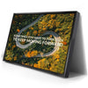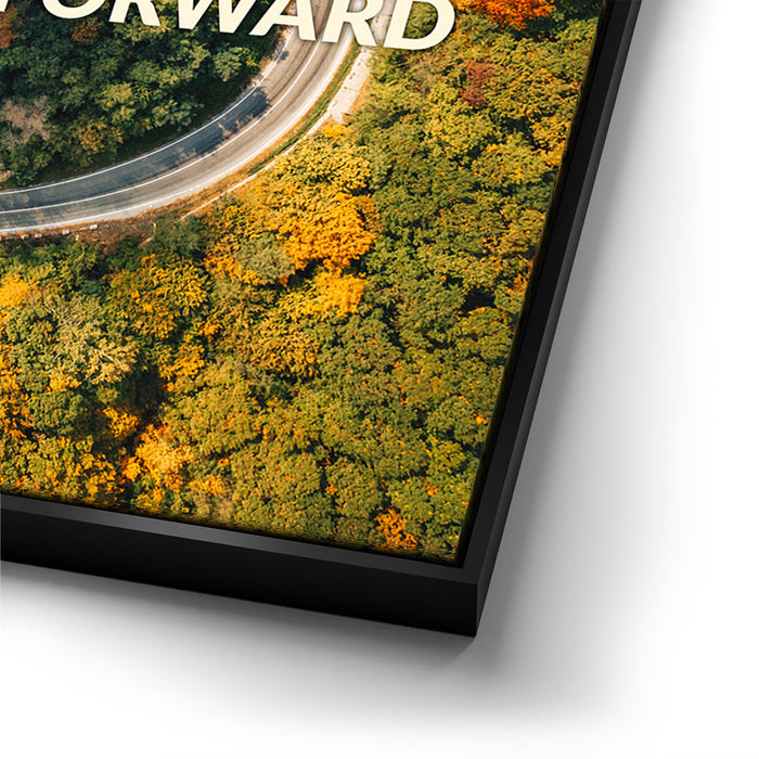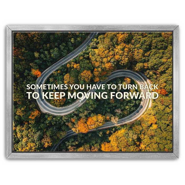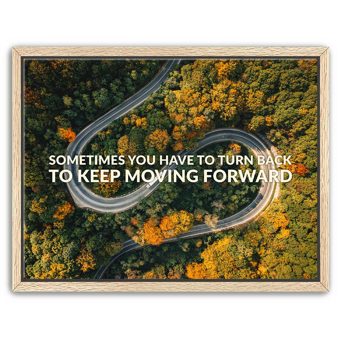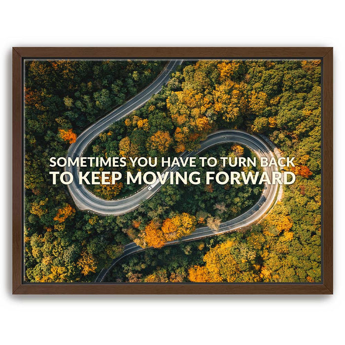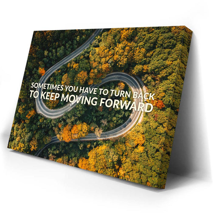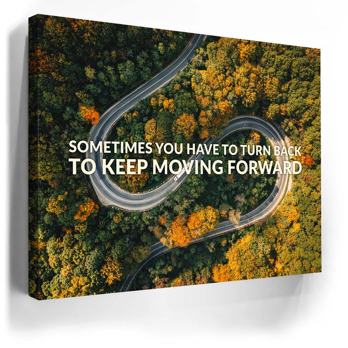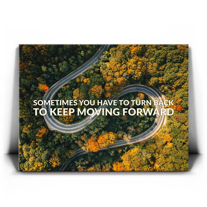 This inspiring piece of typography art features a winding mountain road surrounded by lush trees, overlaid with the motivational message, "Sometimes You Have to Turn Back to Keep Moving Forward." The image powerfully combines nature's beauty with a message of resilience and determination, making it a perfect piece for anyone seeking motivation.