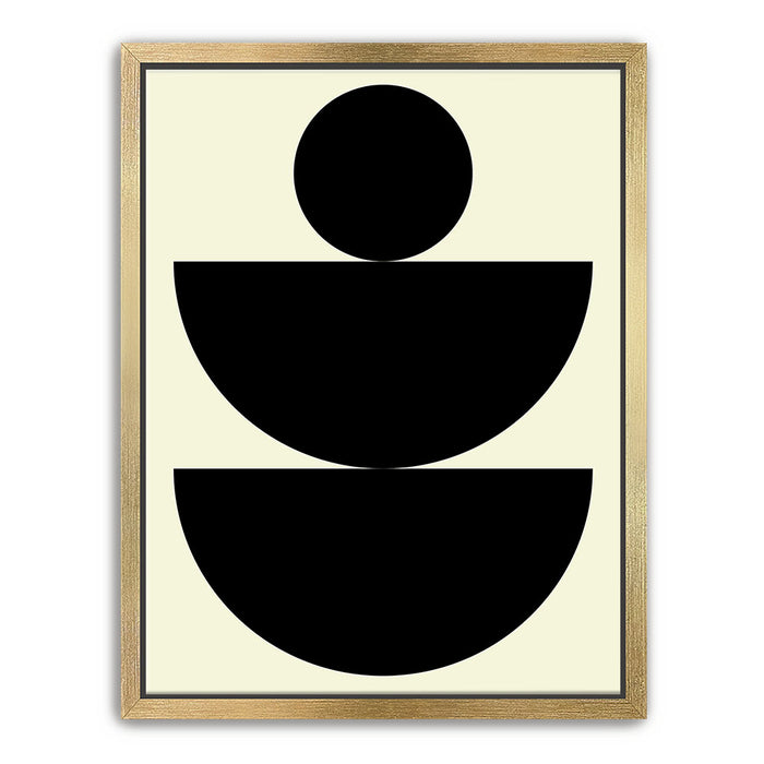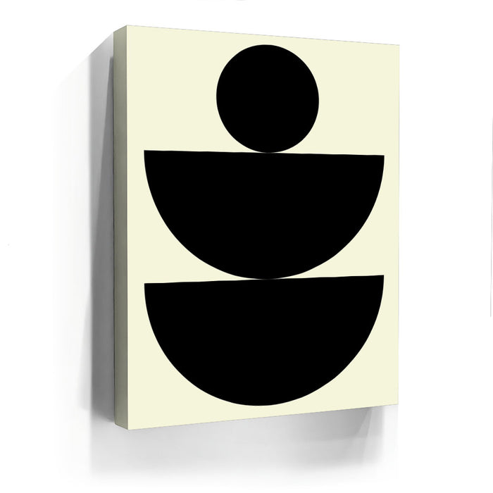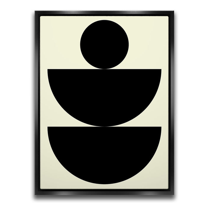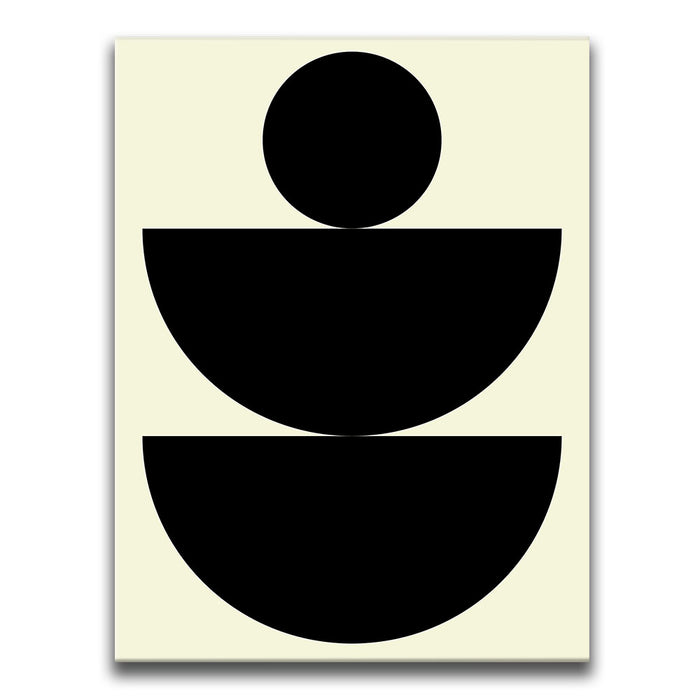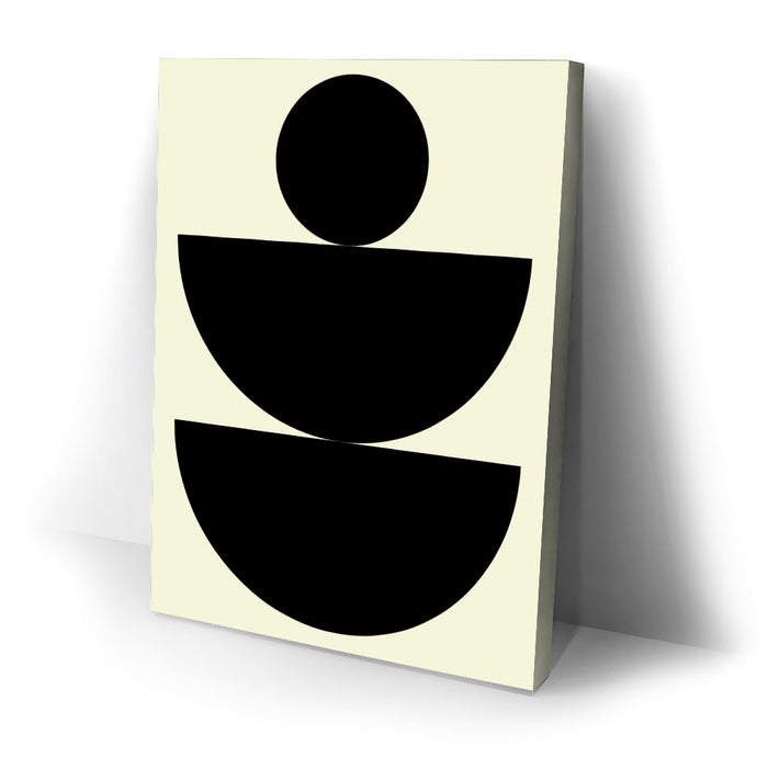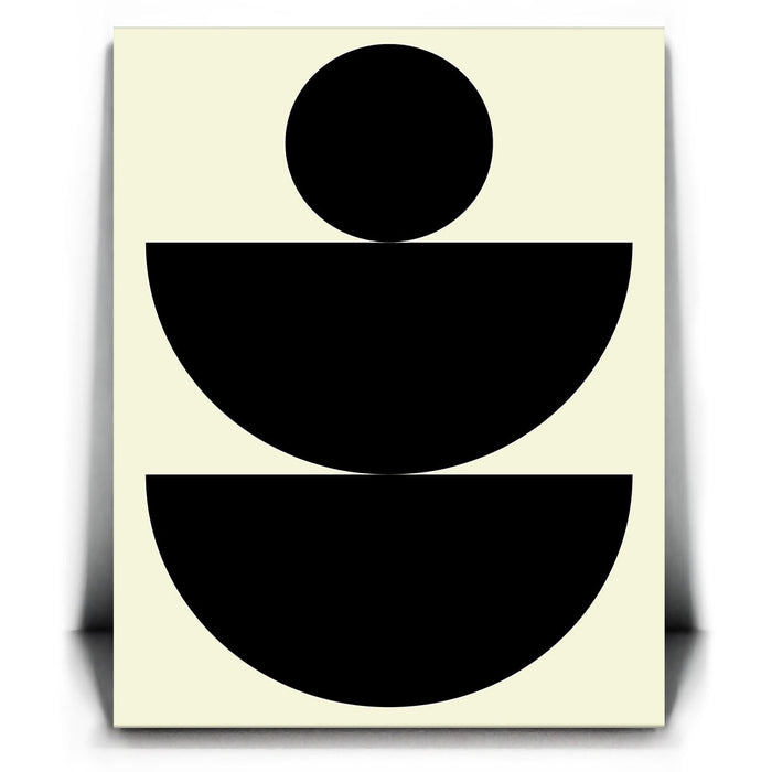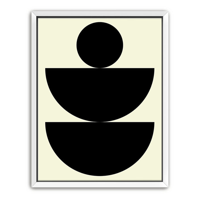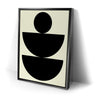 "LA Solace II" by George Rosaly is a striking minimalist artwork featuring stacked geometrical shapes, including circles, half circles, and bold lines. Rendered in black and white, this piece reflects Rosaly’s signature minimalism style, emphasizing balance, form, and simplicity.