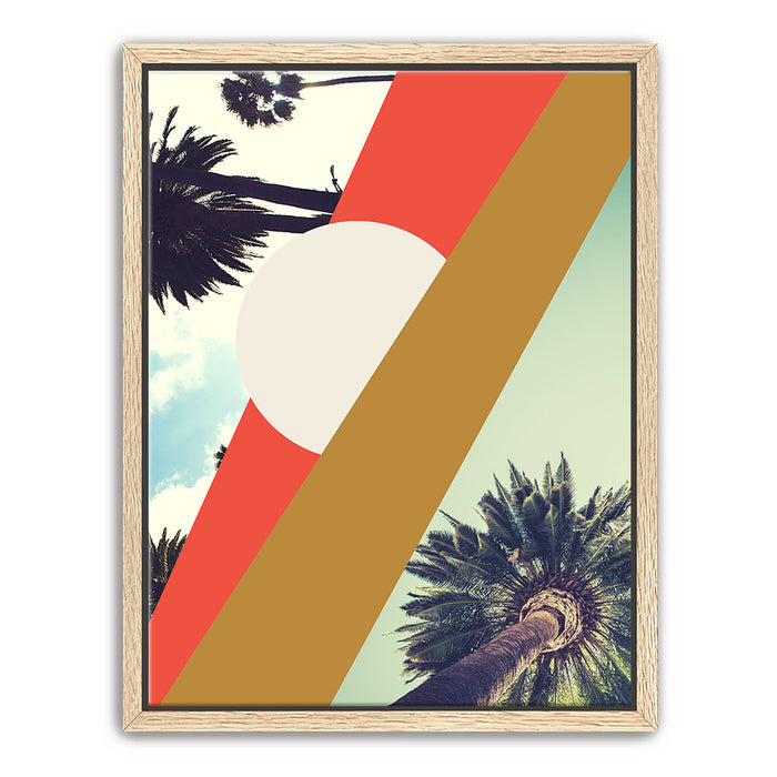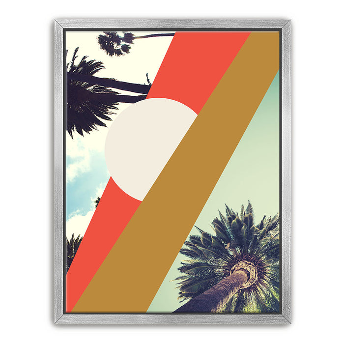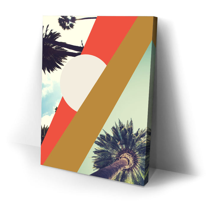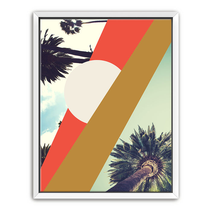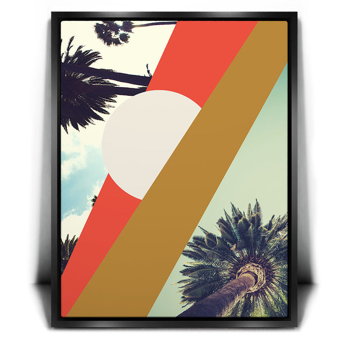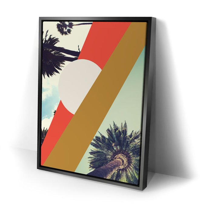 "LA Sunshine" by GEORGE ROSALY is a vibrant piece of abstract wall art featuring palm trees, geometric shapes, and radiant sunshine set against a bright LA sky. The artwork blends bold lines and circles with stylized tree branches and silhouettes, capturing the essence of Los Angeles in a modern, abstract style.