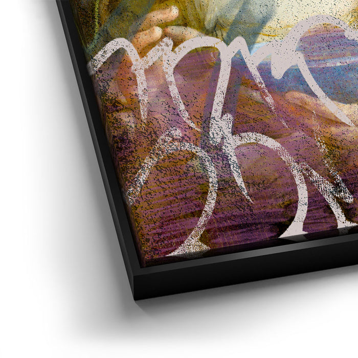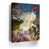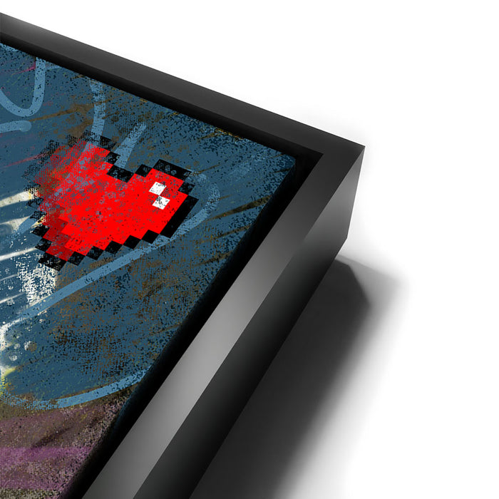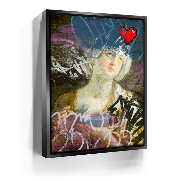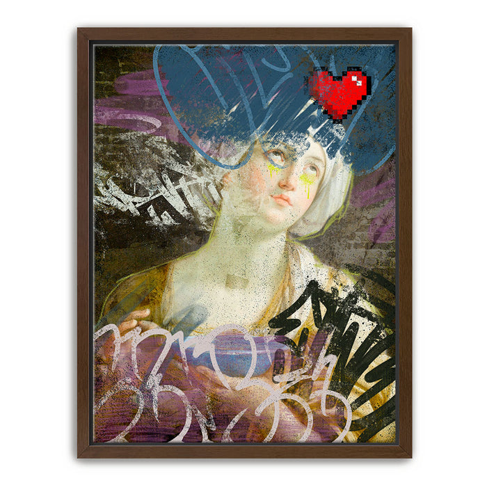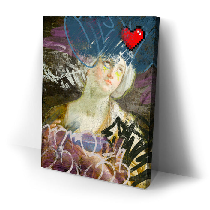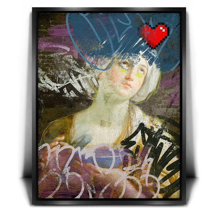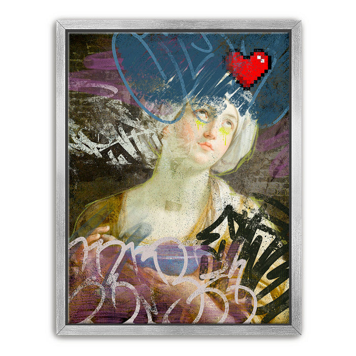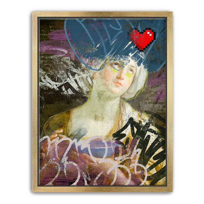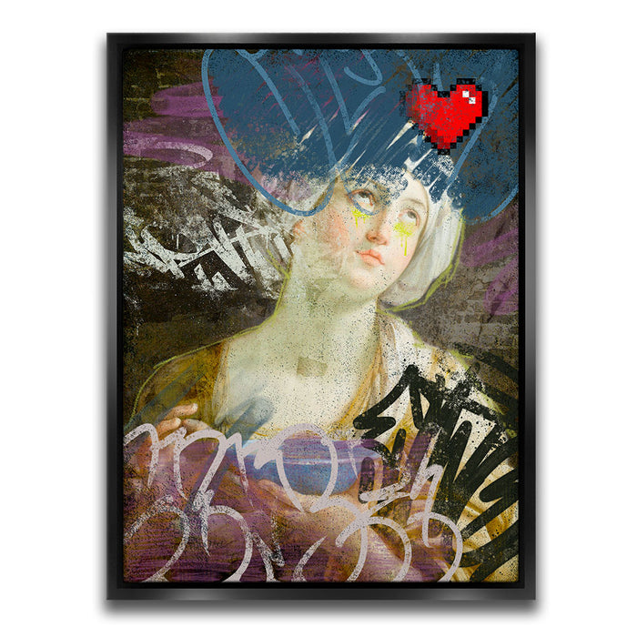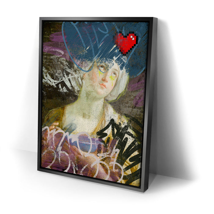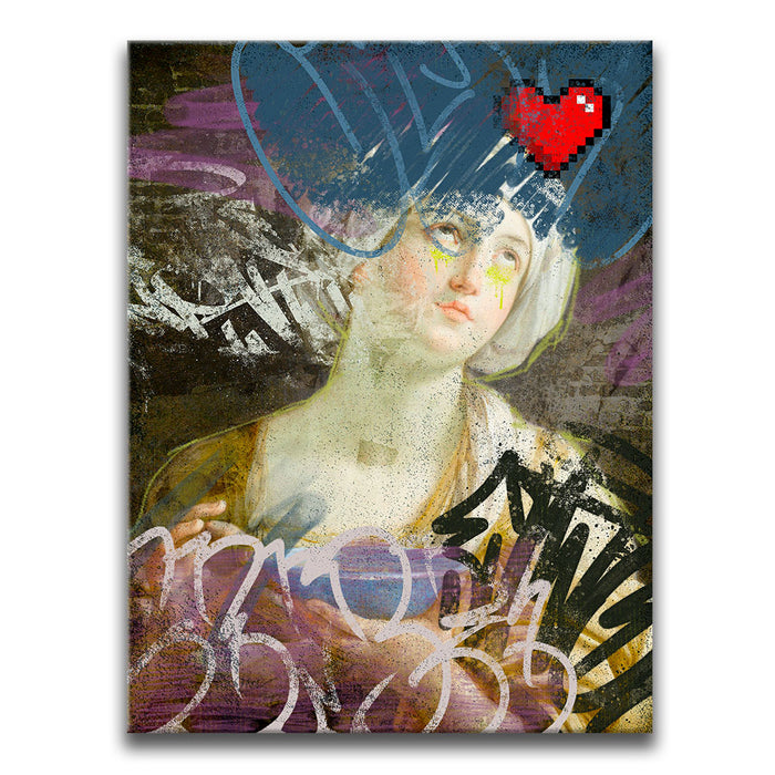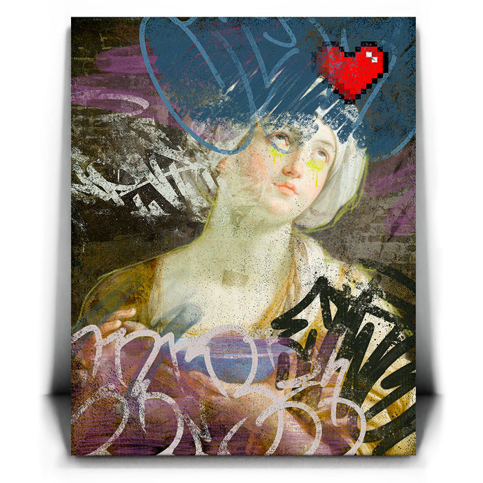 "Lady With Heart" blends classical portraiture with modern street art aesthetics. The serene figure, reminiscent of Renaissance art, is juxtaposed with bold graffiti-style strokes and a pixelated red heart, symbolizing the intersection of tradition and contemporary culture. This contrast between the old and new creates a thought-provoking visual experience that evokes themes of love, emotion, and the passage of time.