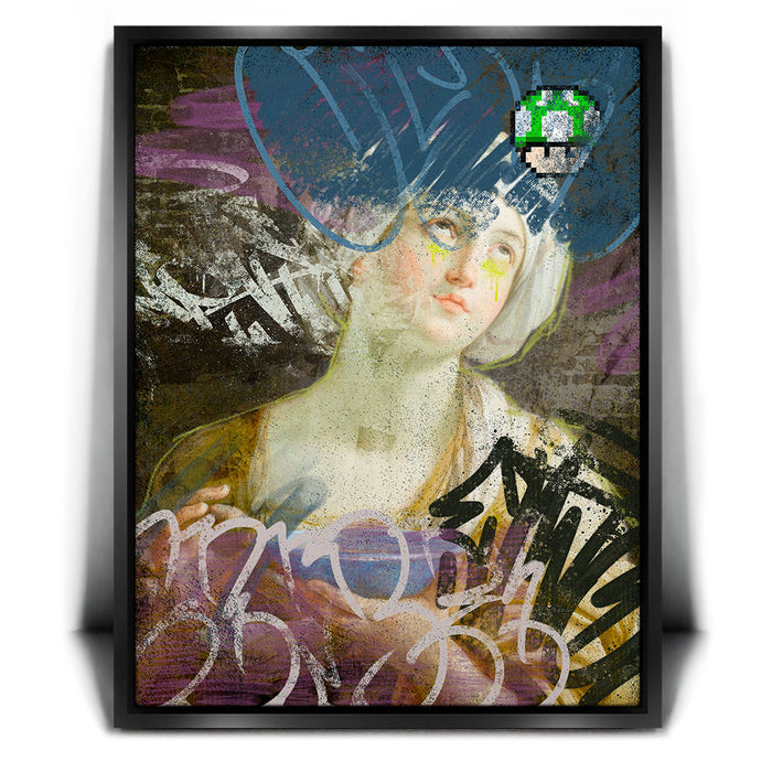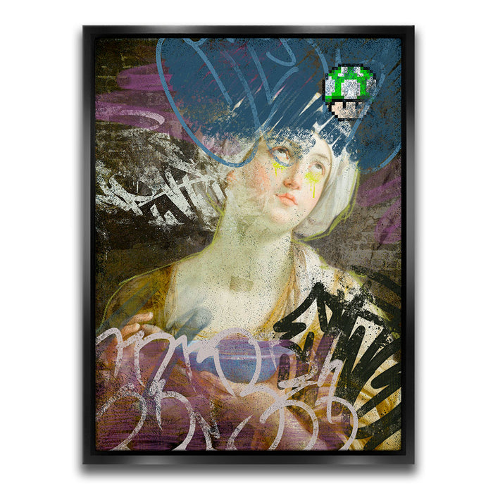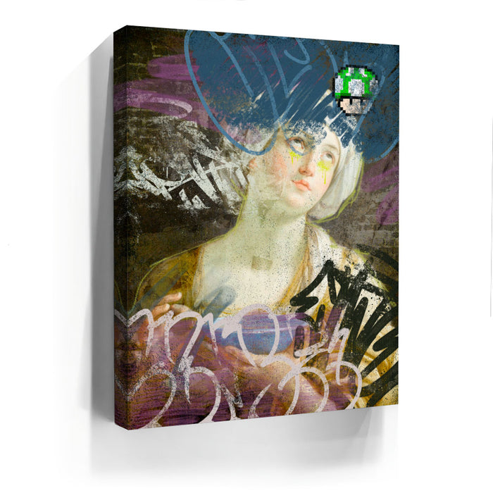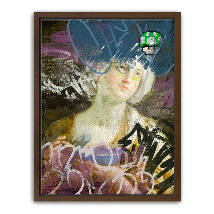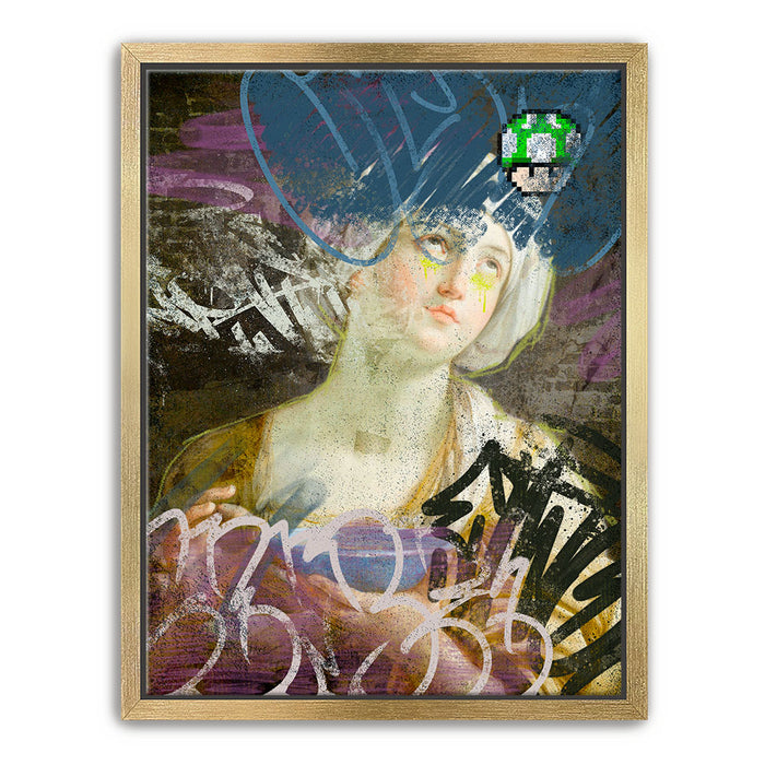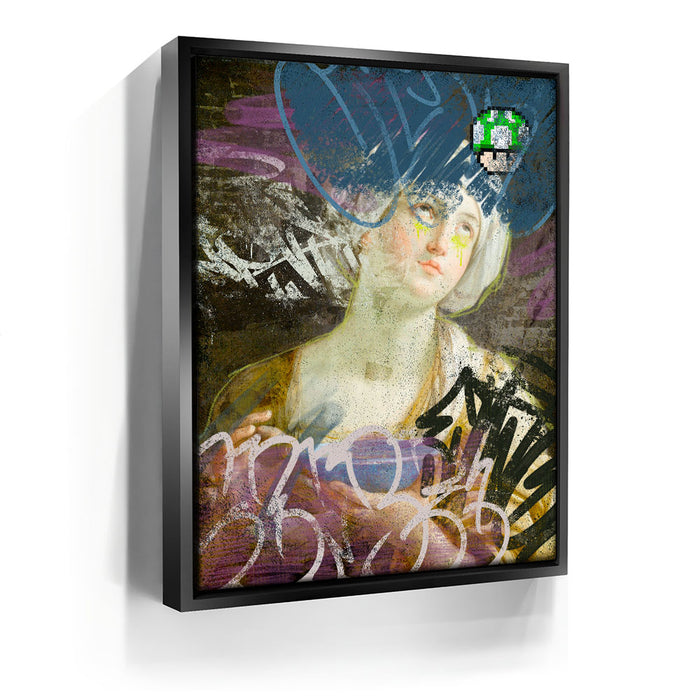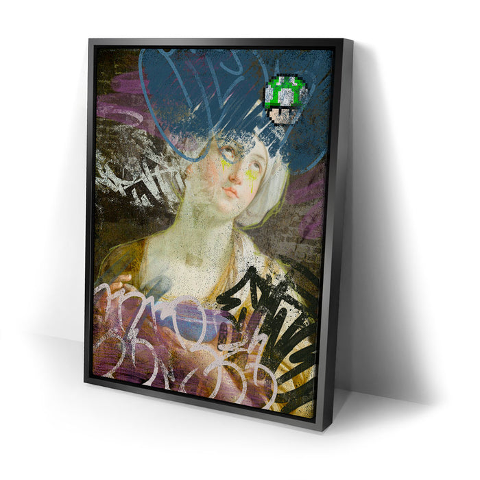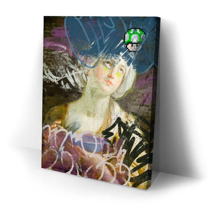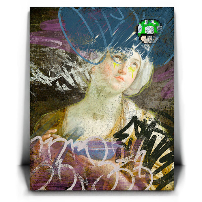 "Lady With Mushroom" playfully merges classical art with pop culture references. The figure, evocative of traditional portraiture, is set against a graffiti-filled backdrop, adding urban flair. The pixelated mushroom, inspired by retro video games, injects a whimsical element into the piece, representing themes of growth, transformation, and nostalgia.
