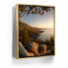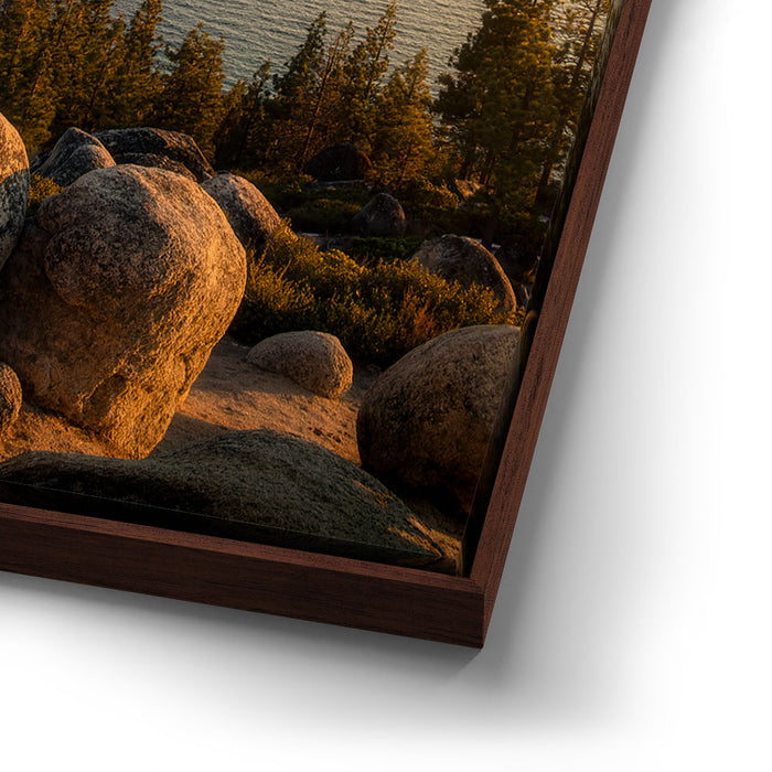 Escape to serenity with “Lake Tahoe Dream,” a breathtaking landscape canvas capturing the golden glow of sunset over the pristine waters and pine-covered slopes of Lake Tahoe. This scenic view blends rocky foreground textures with tranquil forest lines and crystal-clear shoreline, inviting calm into any room.