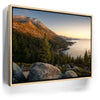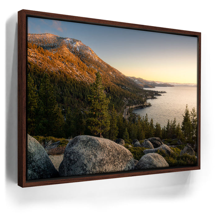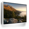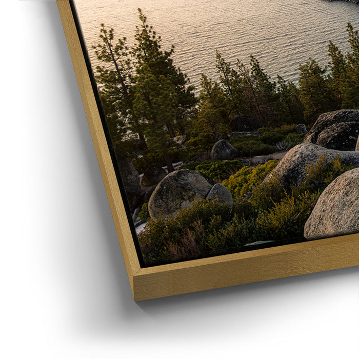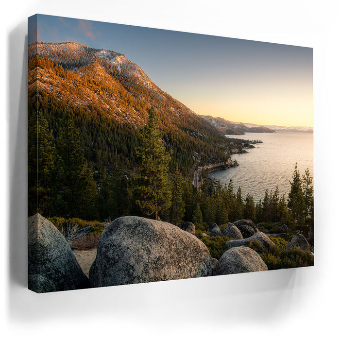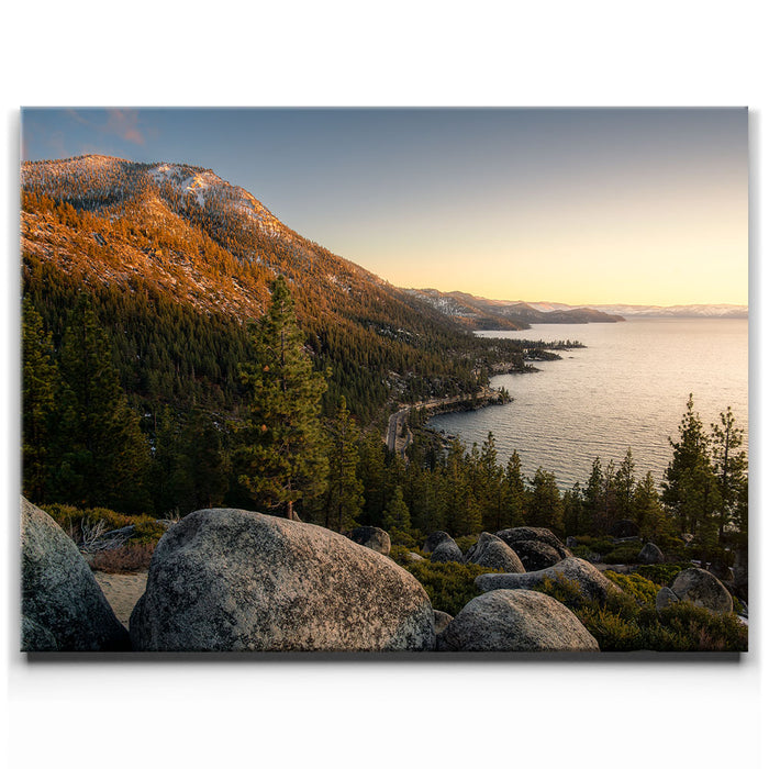 “Lake Tahoe Sunset Vista” by Daniel Heck beautifully captures the golden tranquility of a Sierra Nevada evening. With majestic pines, rugged granite boulders, and the expansive lake stretching into the horizon, this landscape photo celebrates the serene grandeur of Lake Tahoe at sunset.