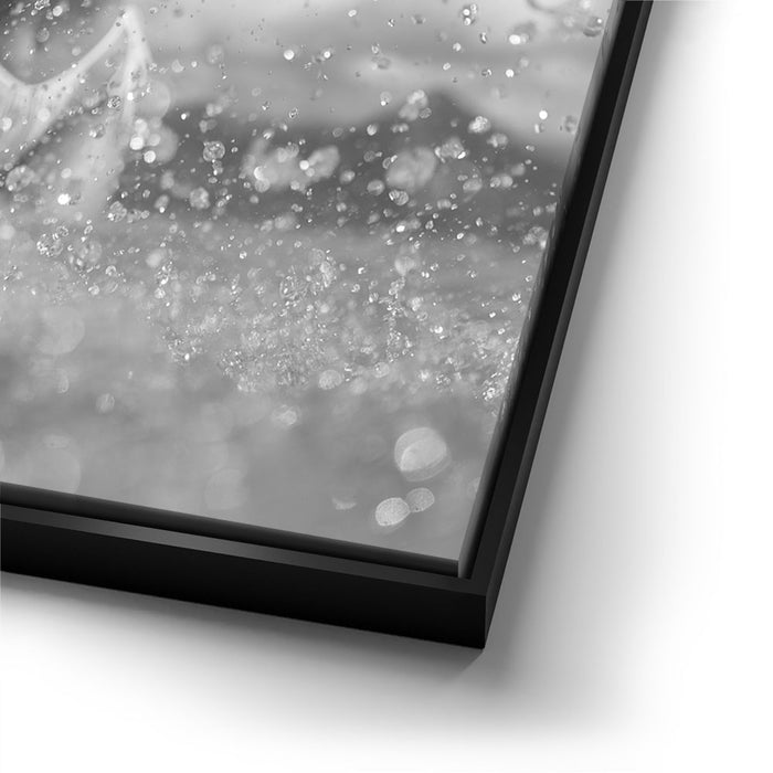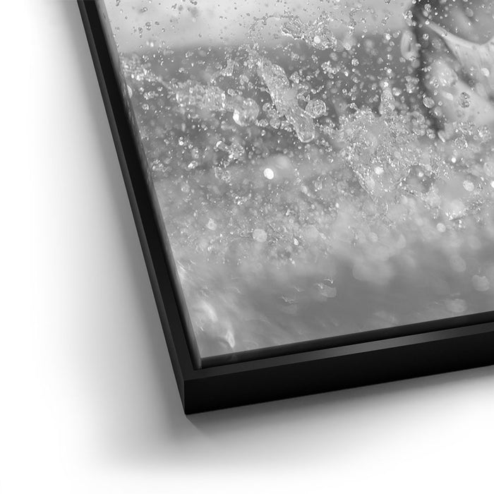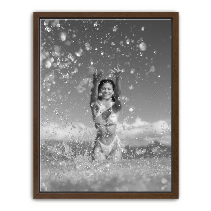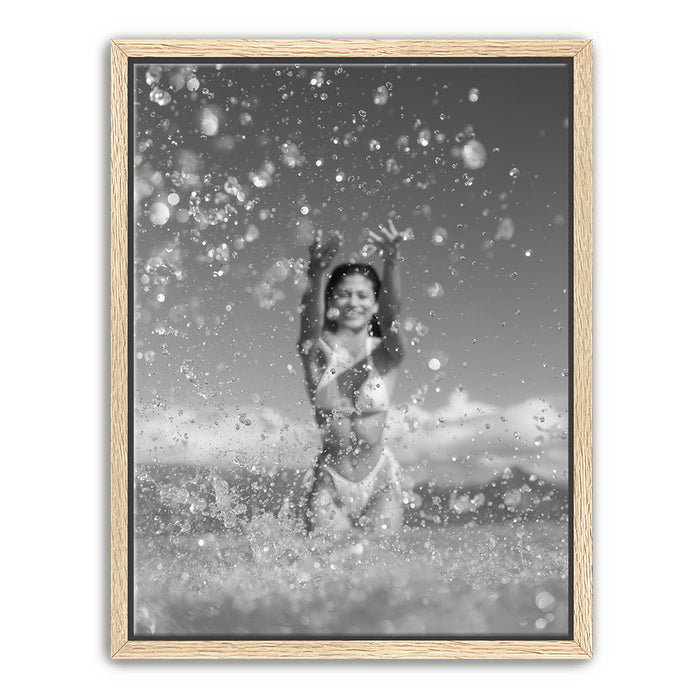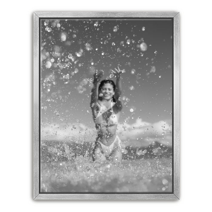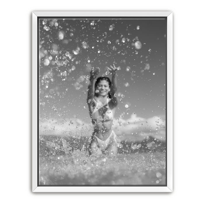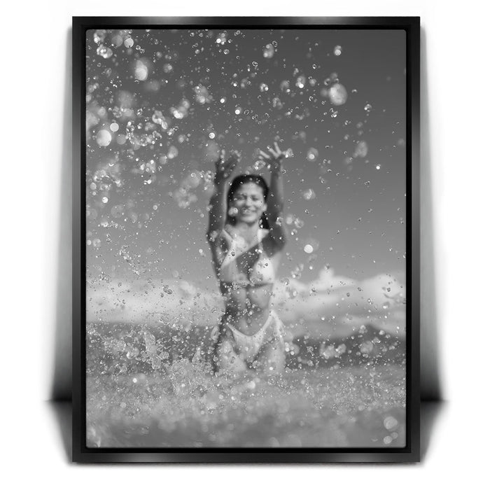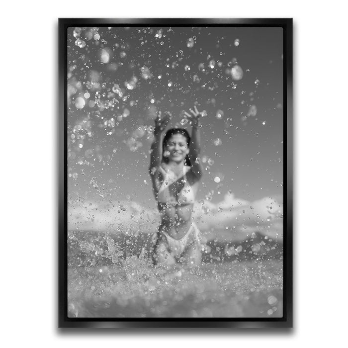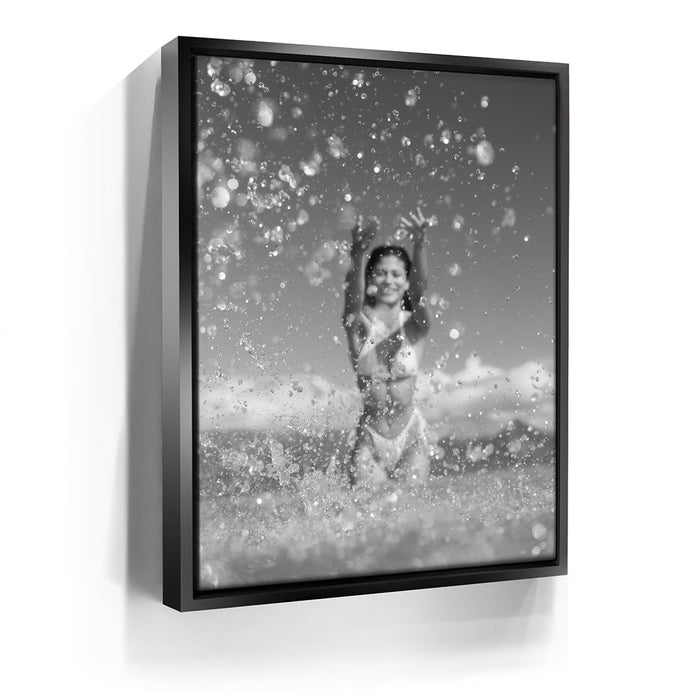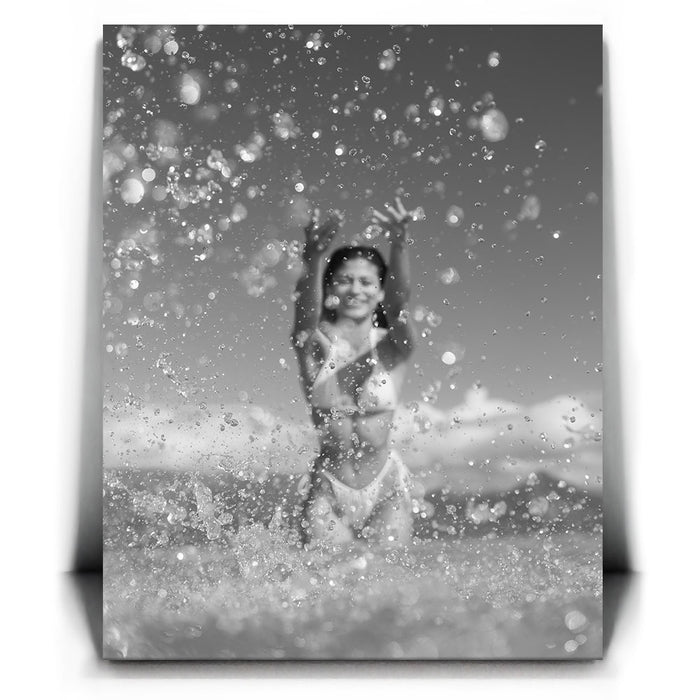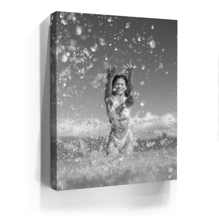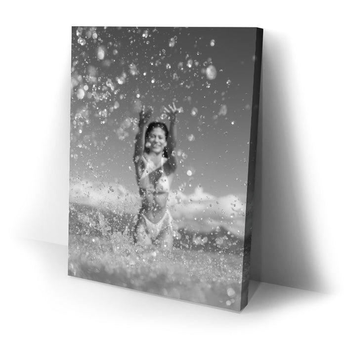 Capture the essence of joy and freedom with this stunning black-and-white canvas art that beautifully portrays a moment of pure happiness in the water. The image features a woman joyfully splashing in the ocean, with water droplets frozen in mid-air, creating a dynamic and lively scene.