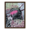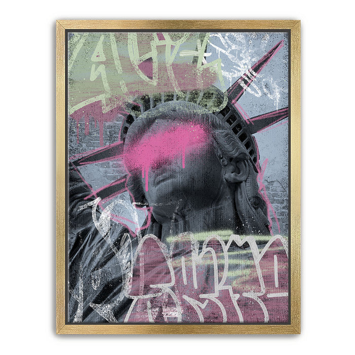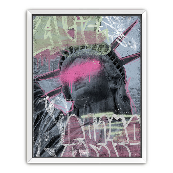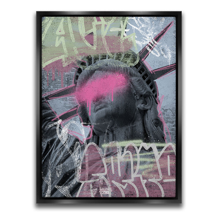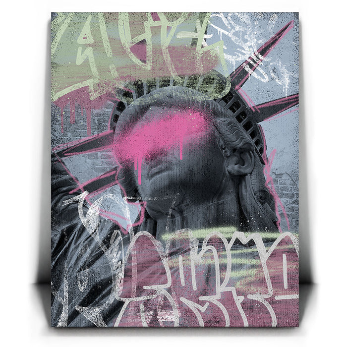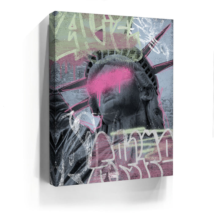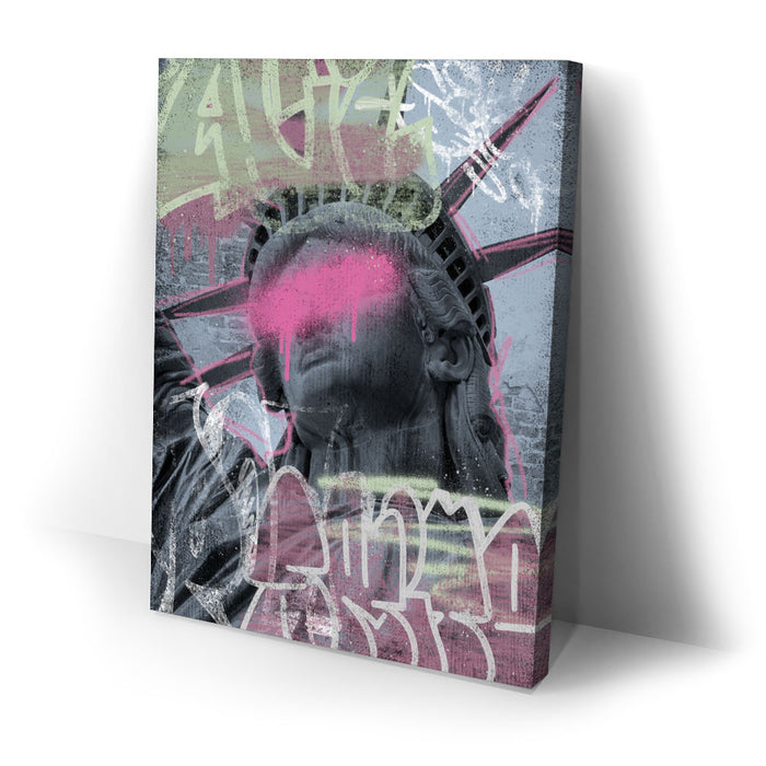 This striking piece of graffiti art, titled "Liberty Is Blind - Pink Graffiti," features the iconic Statue of Liberty with a bold, contemporary twist. The statue's eyes are obscured by a vibrant splash of pink paint, symbolizing a powerful statement on liberty and vision.
