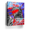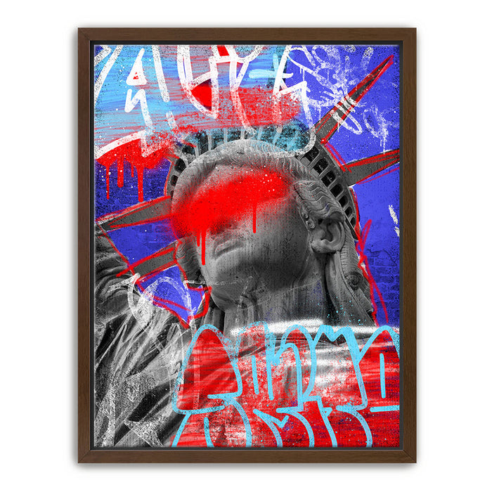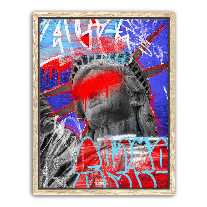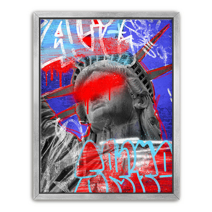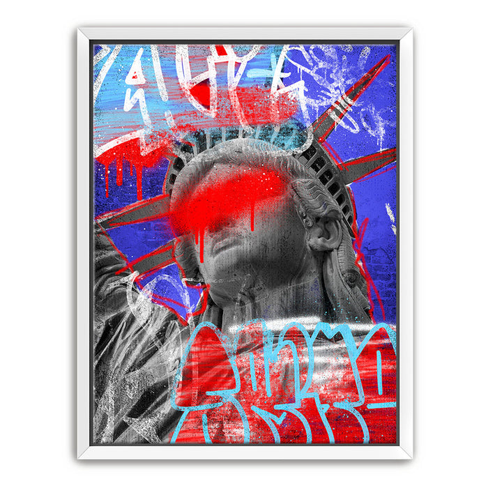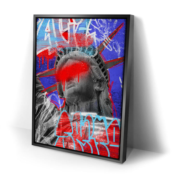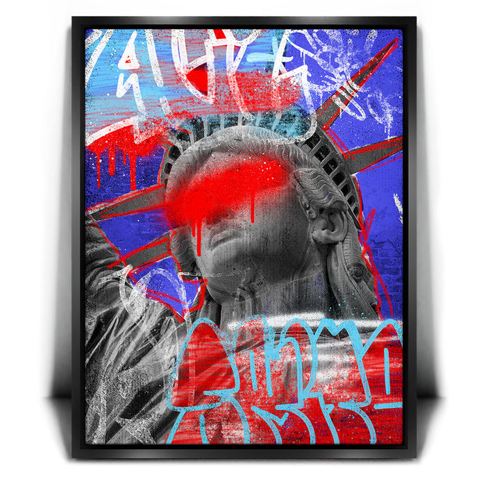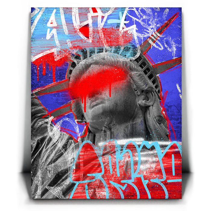 This striking piece of graffiti art, titled "Liberty Is Blind - Red Graffiti," features the iconic Statue of Liberty with a bold, contemporary twist. The statue's eyes are obscured by a vibrant splash of red paint, symbolizing a powerful statement on liberty and vision.