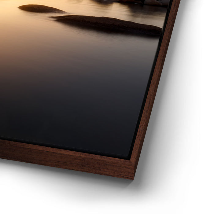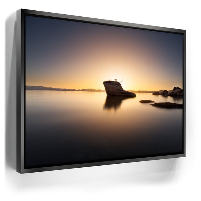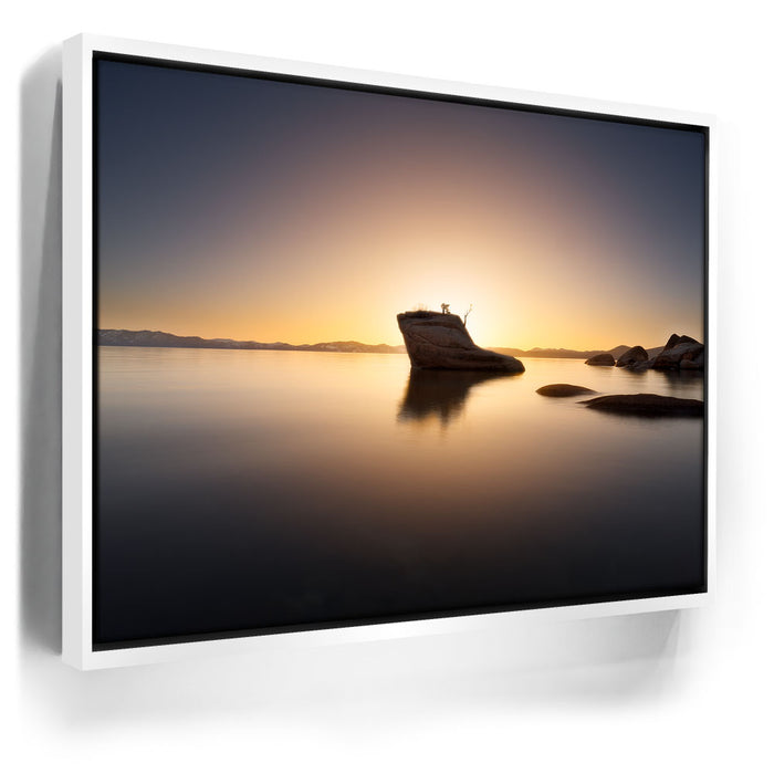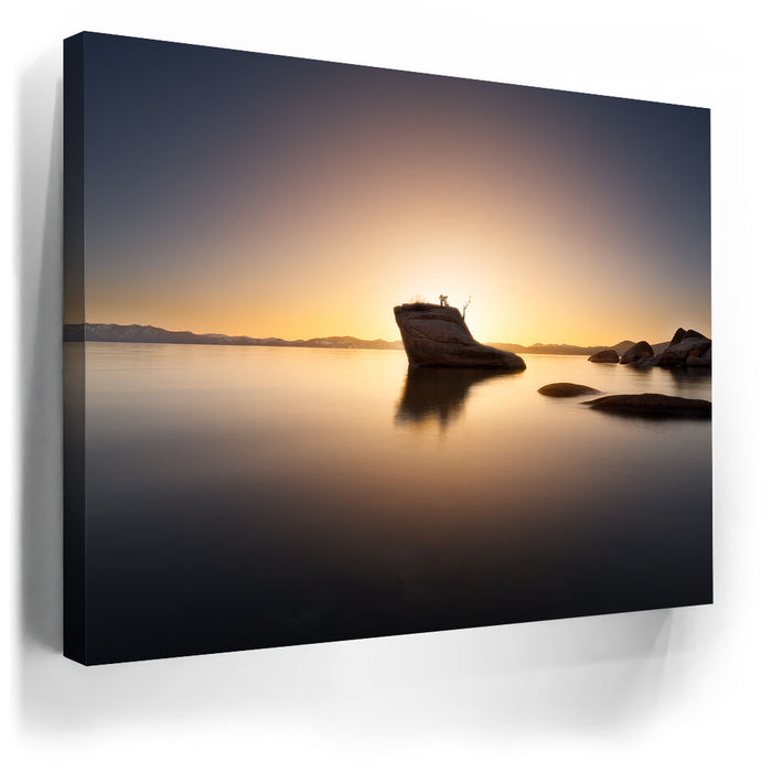 “Light of Serenity” by Daniel Heck captures the tranquil beauty of Lake Tahoe as the sun sets behind the iconic Bonsai Rock. The glowing horizon bathes the calm waters in warm golden tones, creating a peaceful reflection that radiates balance and stillness.