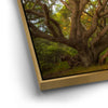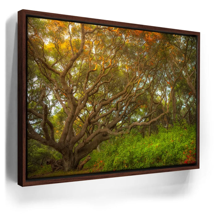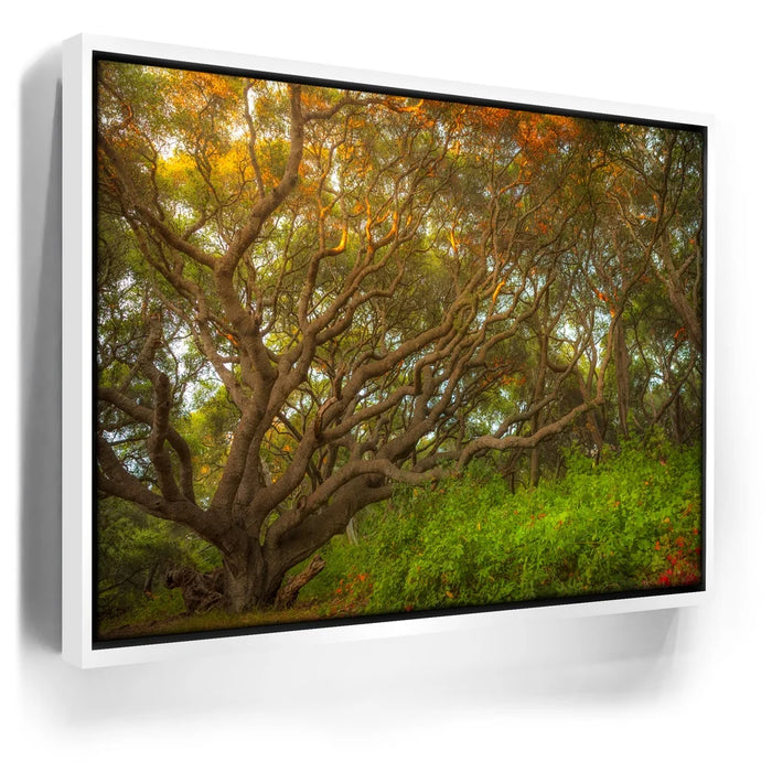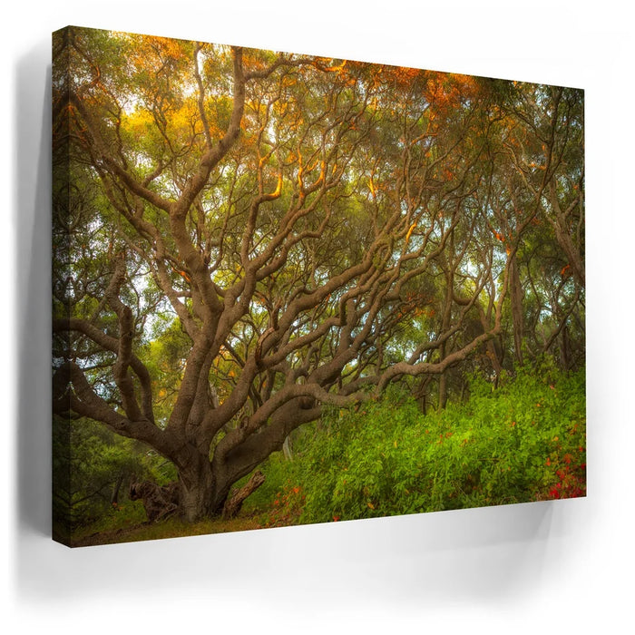 "Light of the Ancient Oak" by 11th Dimension captures the timeless majesty of a sprawling oak tree bathed in warm, golden light. Its twisting branches stretch wide across the forest canopy, while vibrant greenery and soft bursts of color on the forest floor create a serene and enchanting woodland scene.