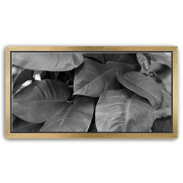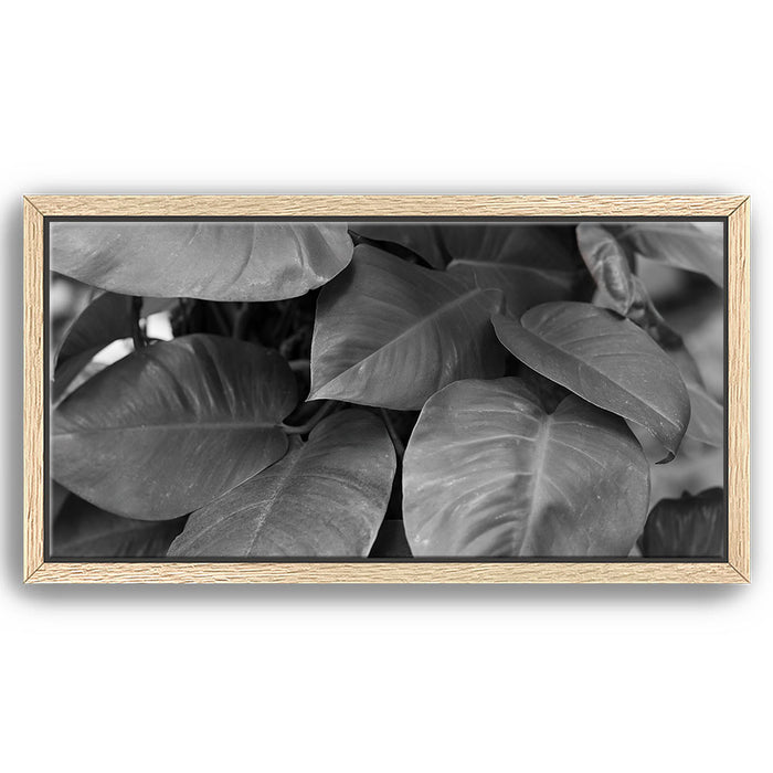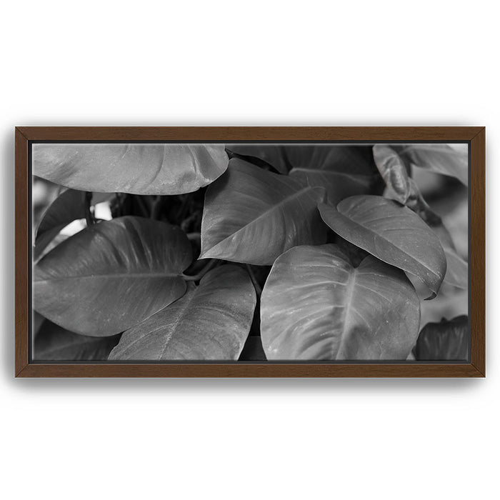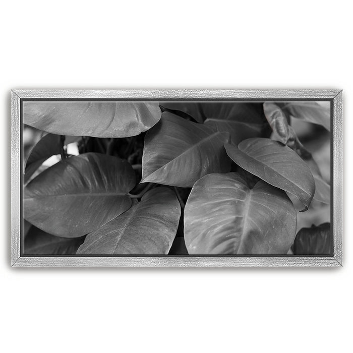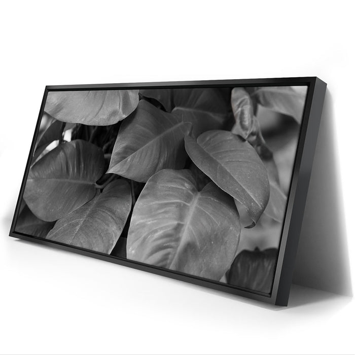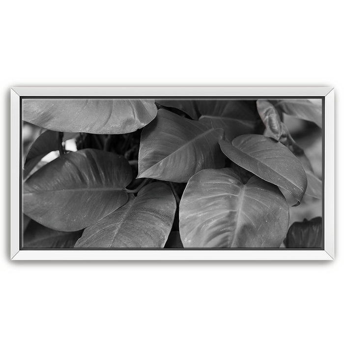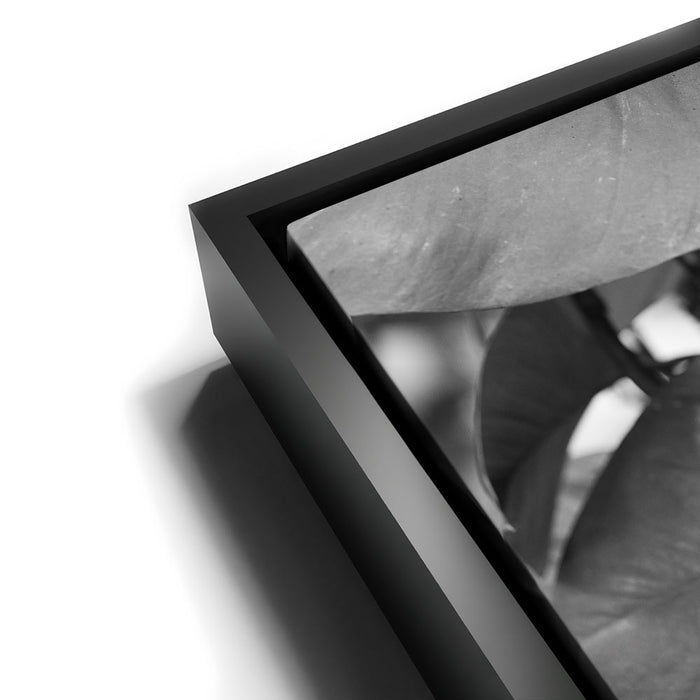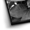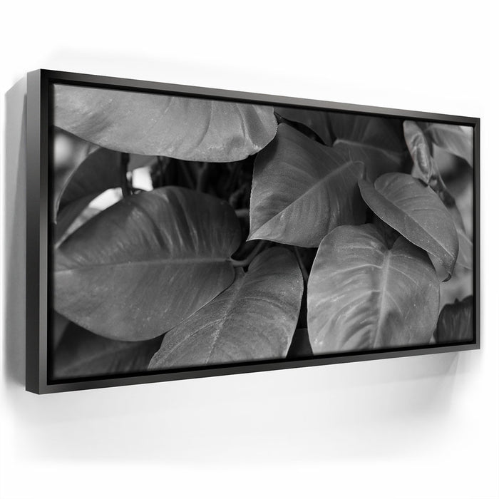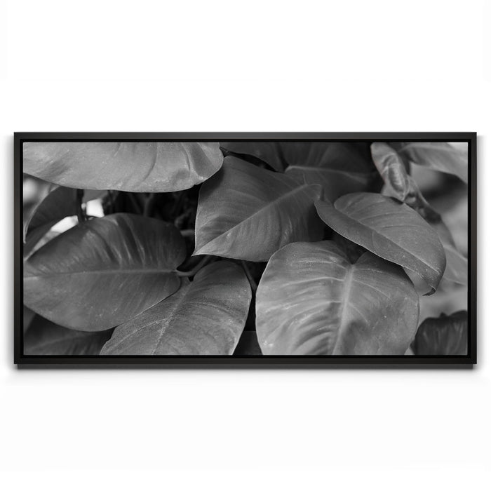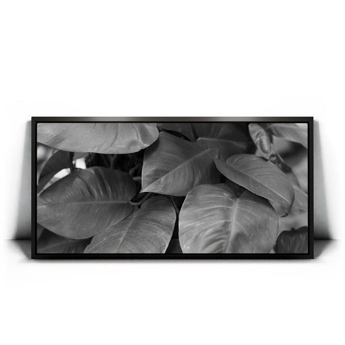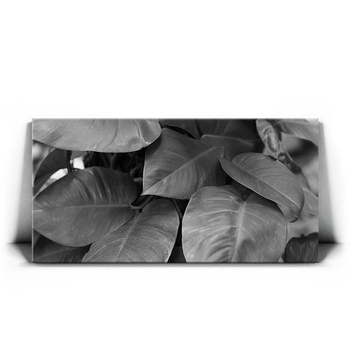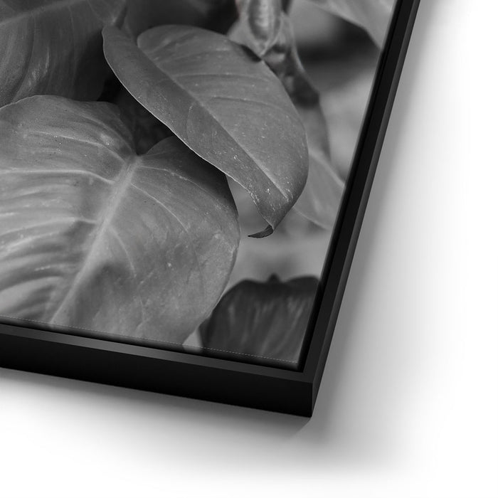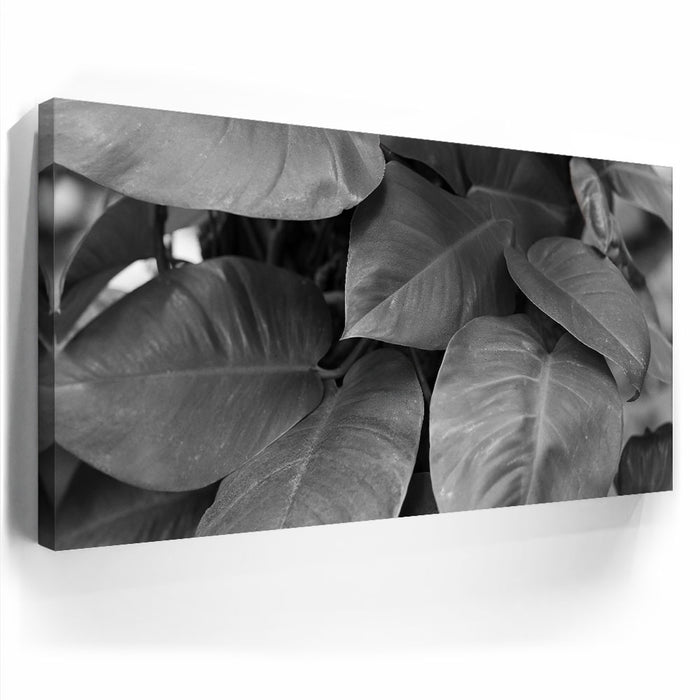 Enhance your space with this captivating black-and-white canvas art, featuring a stunning close-up of tropical leaves in intricate detail. The monochrome palette adds a timeless elegance, making it a versatile piece that complements any décor style. The high-contrast shades of black and gray highlight the natural beauty and texture of the leaves, creating a serene yet impactful visual statement.