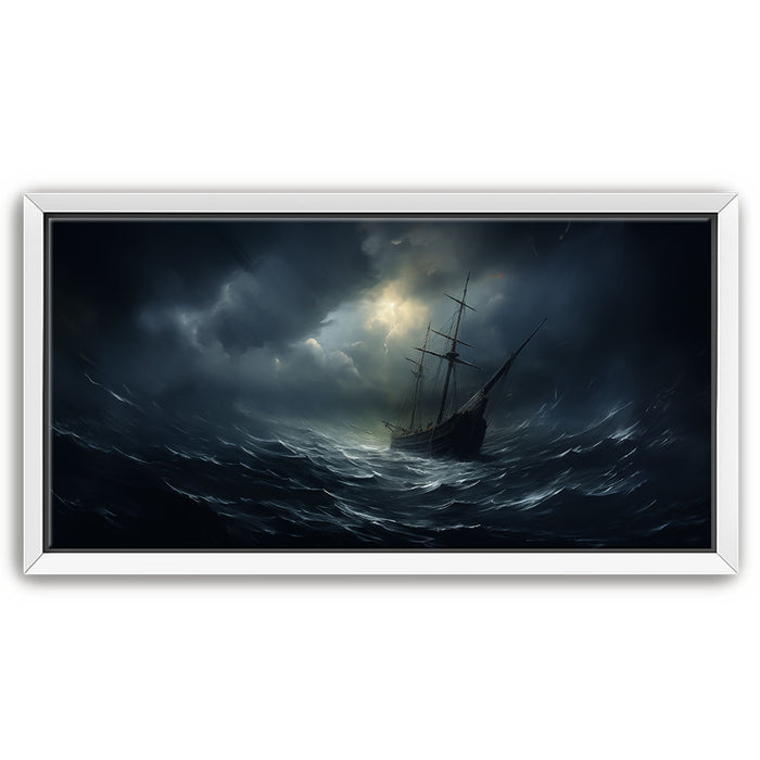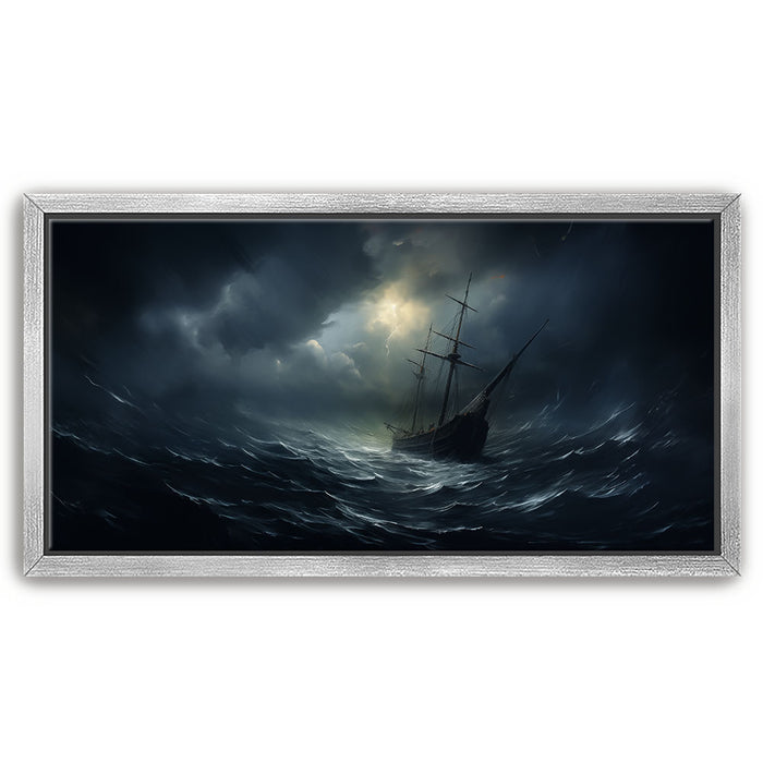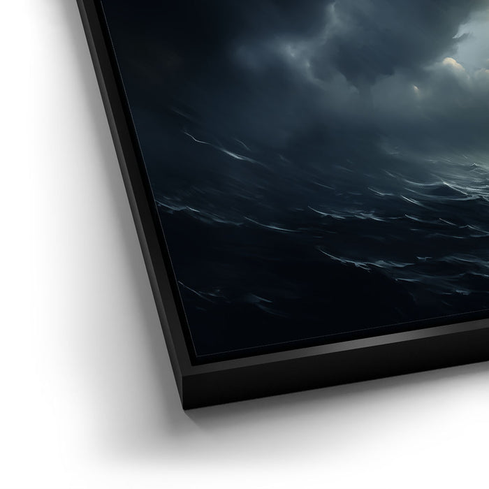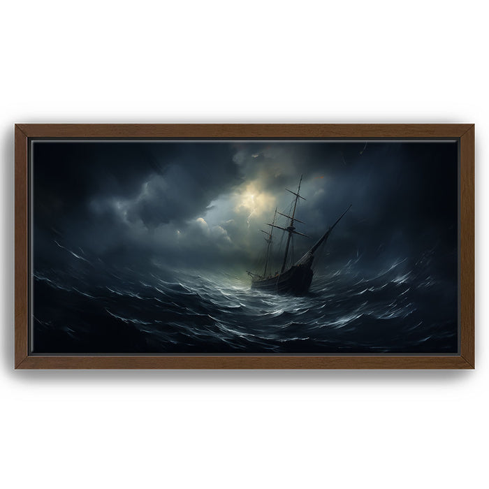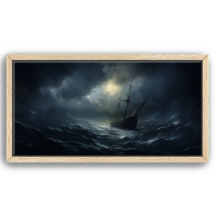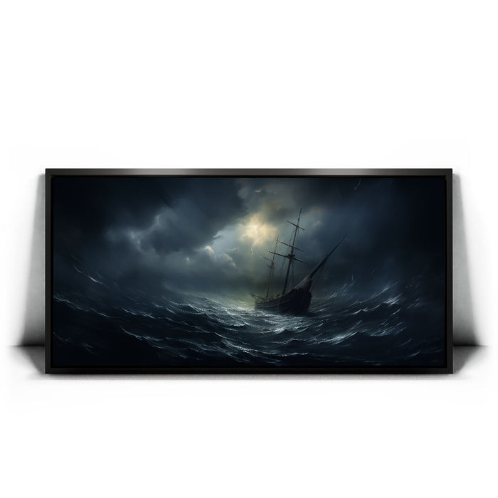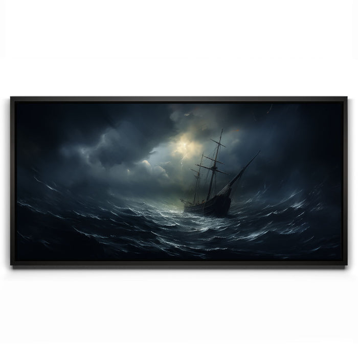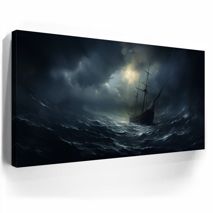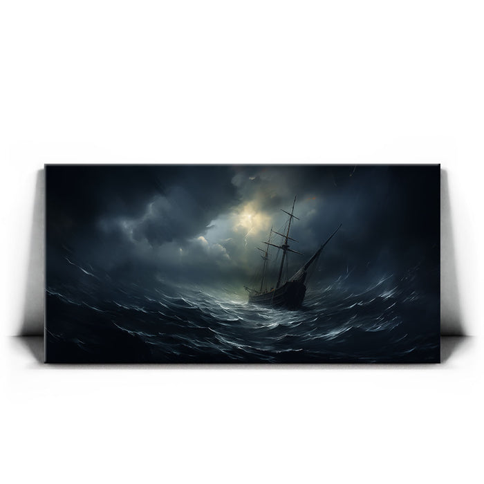 Lost At Sea by Sean Pearce is a dramatic oceanscape that captures the power of ocean waves beneath a cloud-filled sky. Featuring a lone pirate ship navigating the deep sea, this piece evokes the mystery and intensity of being surrounded by stormy clouds and endless water.