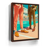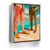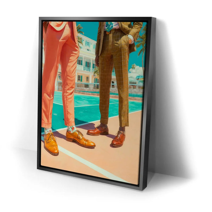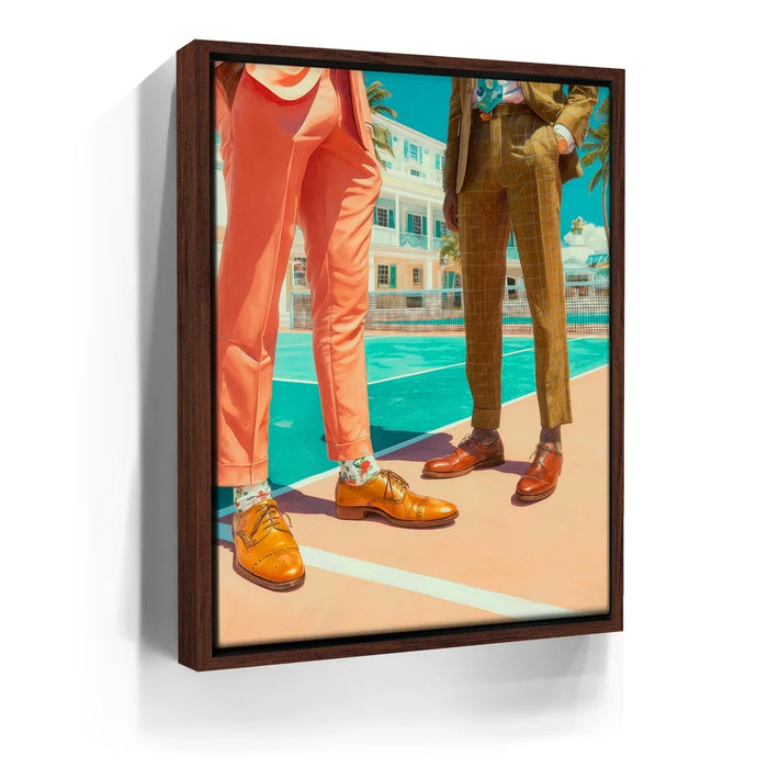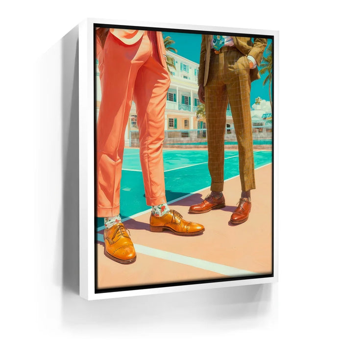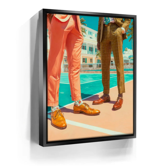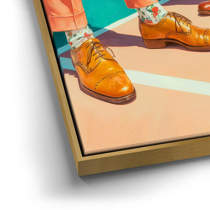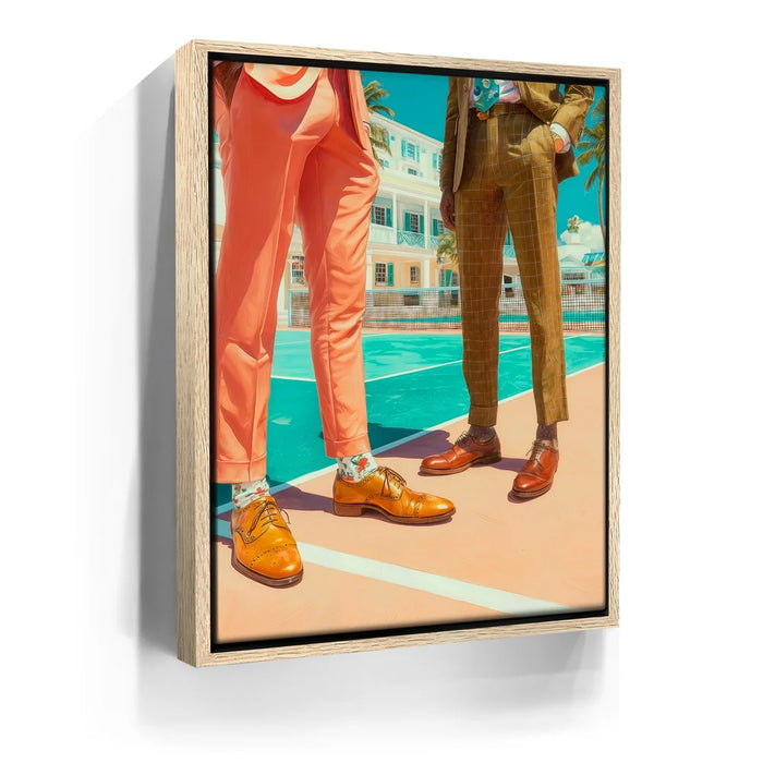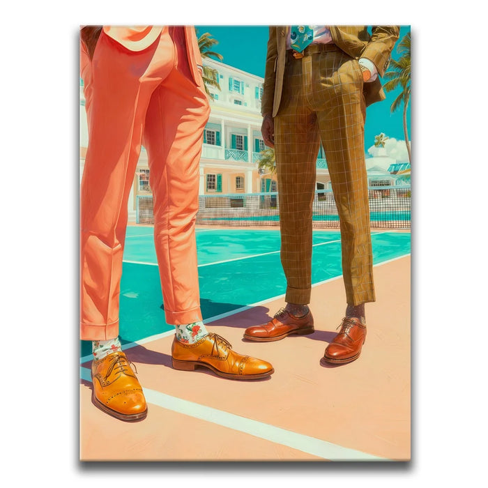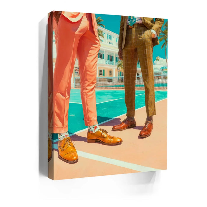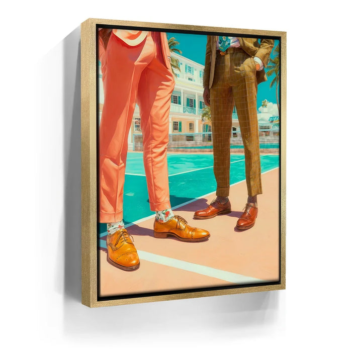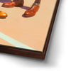 “Lounge Act No. 1” by Kandise King is a sun-soaked portrait of refined leisure and effortless swagger. Two sharply dressed men stand at the edge of a pool, their polished shoes gleaming against the pastel court. The coral, mustard, and teal tones radiate tropical sophistication, evoking a mood that’s equal parts summer escape and style statement.