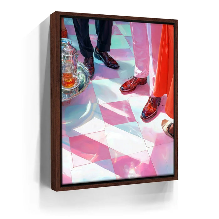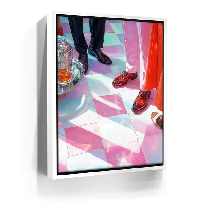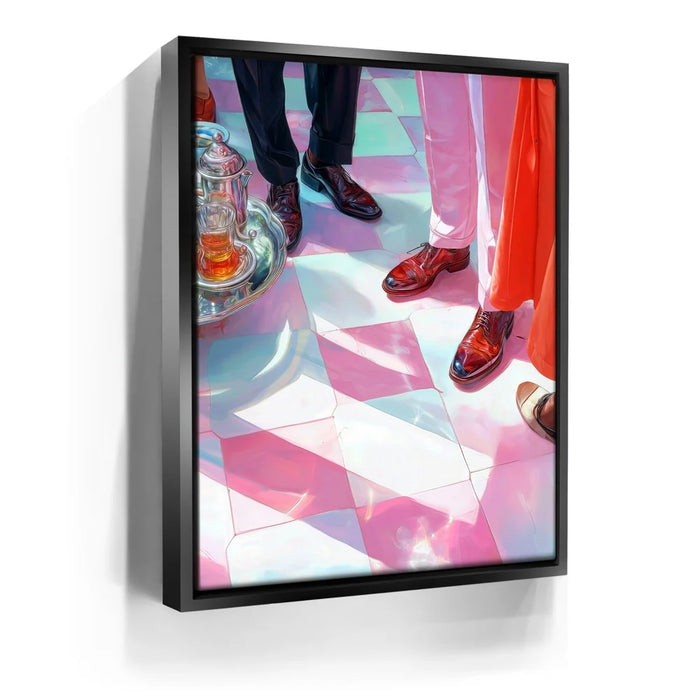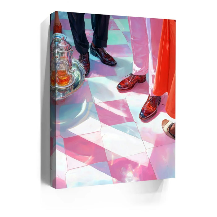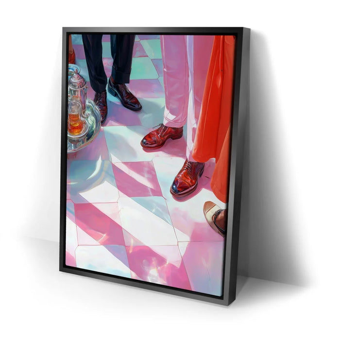 “Lounge Act No. 3” by Kandise King captures a moment of effortless sophistication and cool composure. Polished leather shoes gleam against a pastel-tiled floor, where light refracts in pinks, blues, and golds like liquid luxury. The composition hints at conversation, class, and charisma — an unseen rhythm between elegance and ease.
