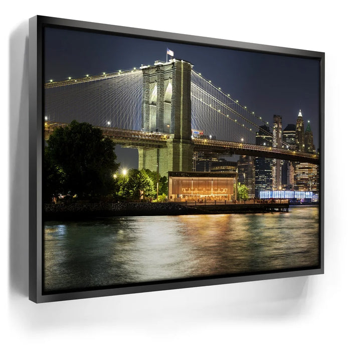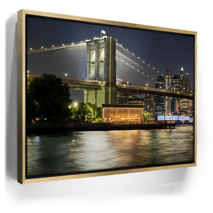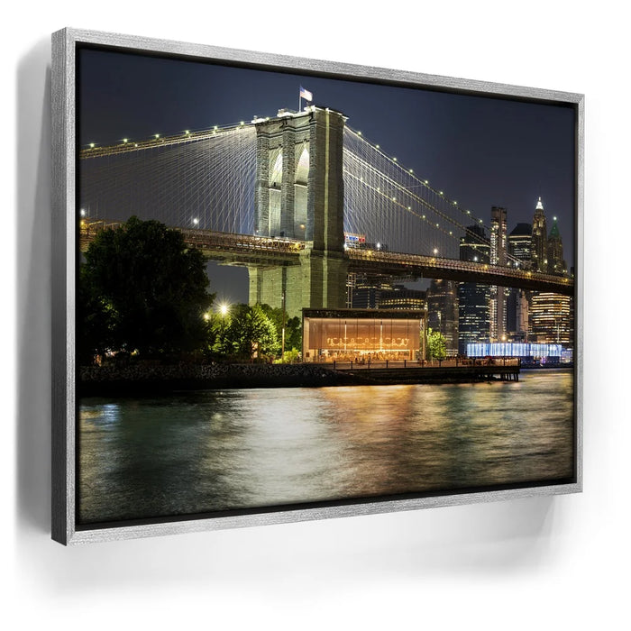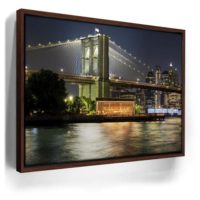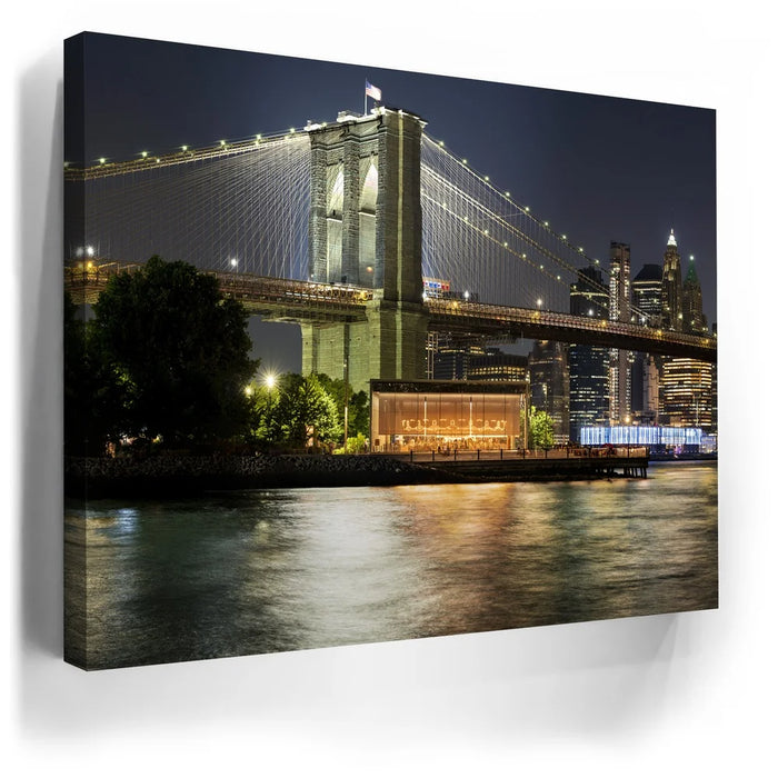 “Lower Manhattan And Brooklyn Bridge Panoramic View - 1 Of 2” by Barbarossa captures the timeless beauty of New York City at night. The Brooklyn Bridge, illuminated by golden lights, stretches across the East River with the Lower Manhattan skyline rising brightly in the background. Reflections shimmer on the water, adding depth and vibrance to the urban scene.