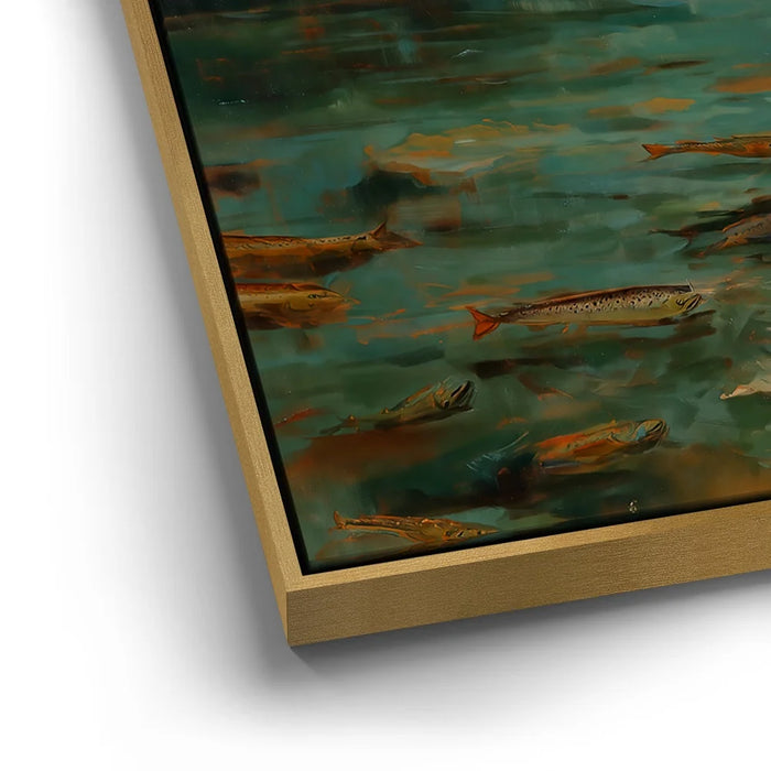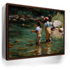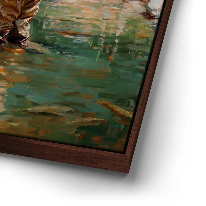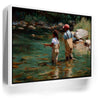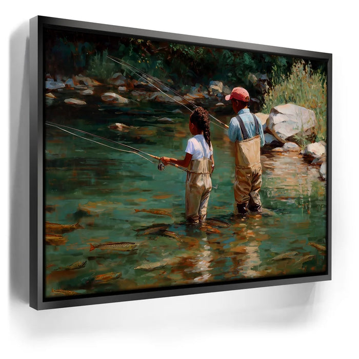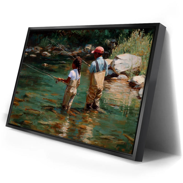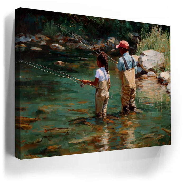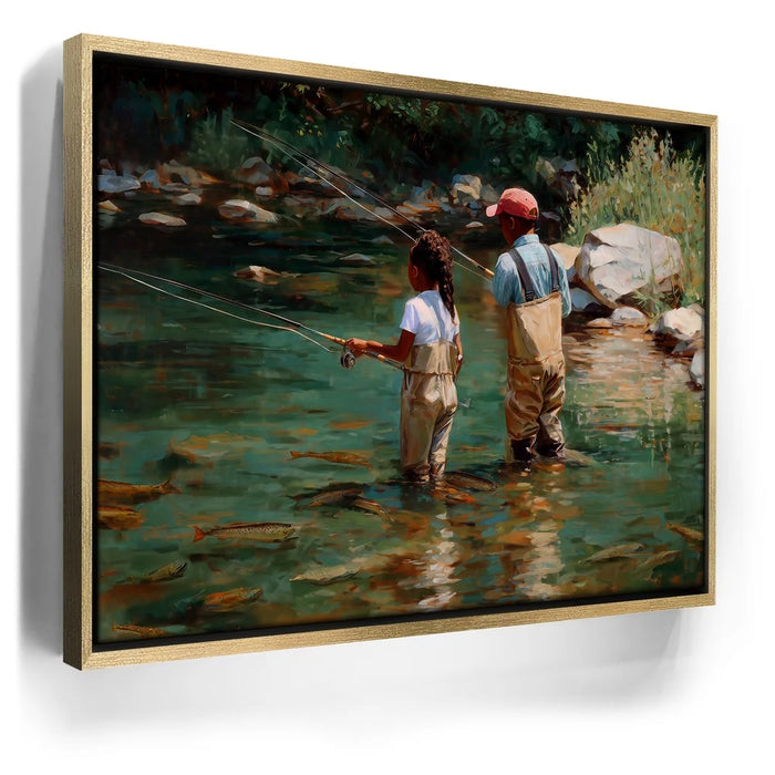 “Lure Of The Wild” by Kandise King is a heartfelt celebration of family, nature, and tradition. This captivating artwork depicts a father and daughter wading into a clear stream, fishing poles in hand, surrounded by glimmers of trout beneath the water’s surface.