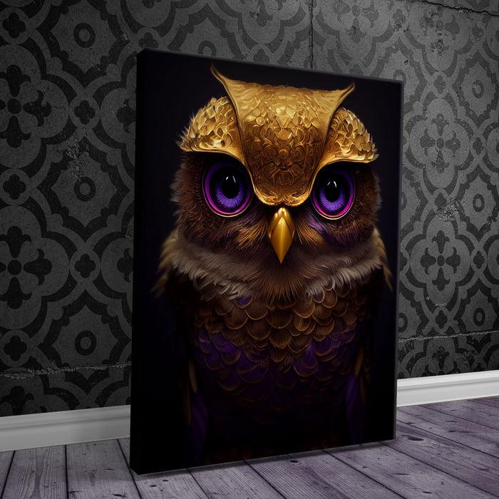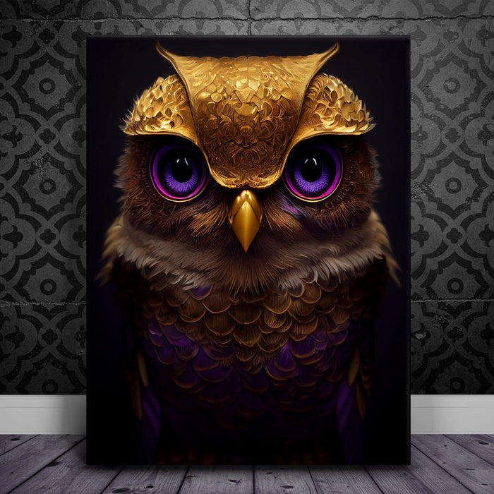 "Magical Owl With Purple Eyes" by Midjourney.Man is a captivating portrait that brings to life a mystical owl with striking purple eyes. This enchanting artwork blends vibrant purple tones with golden hues, creating a magical atmosphere that draws the viewer into its vision.