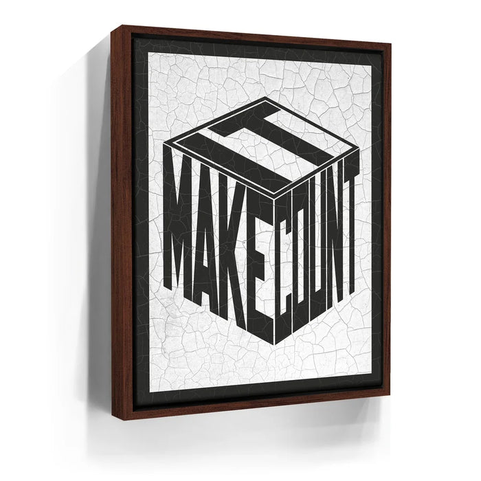 Make It Count - Cracked Paint - Black is a bold visual statement that fuses industrial texture with motivational intent. The cracked paint finish adds a raw, weathered character to the sharp, dimensional typography, symbolizing strength built through persistence. Its black-and-white palette gives it a sleek, modern edge—perfect for office walls, studios, or minimalist interiors. This artwork serves as a daily reminder that every effort matters, and every moment counts.