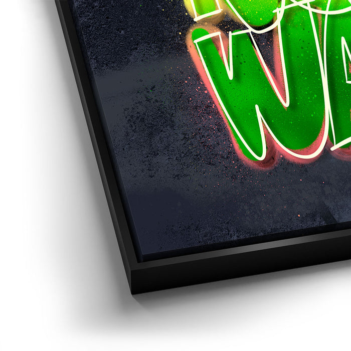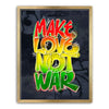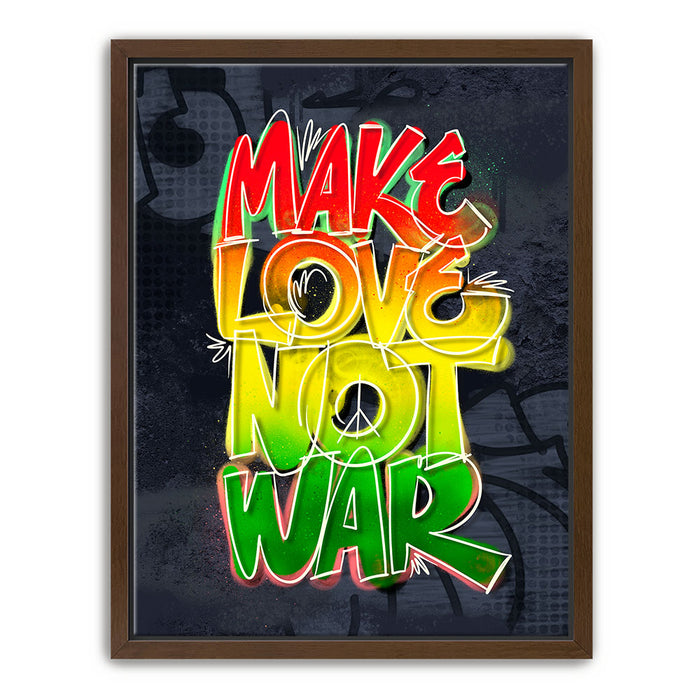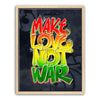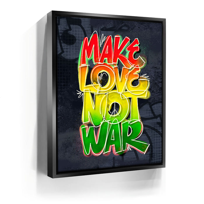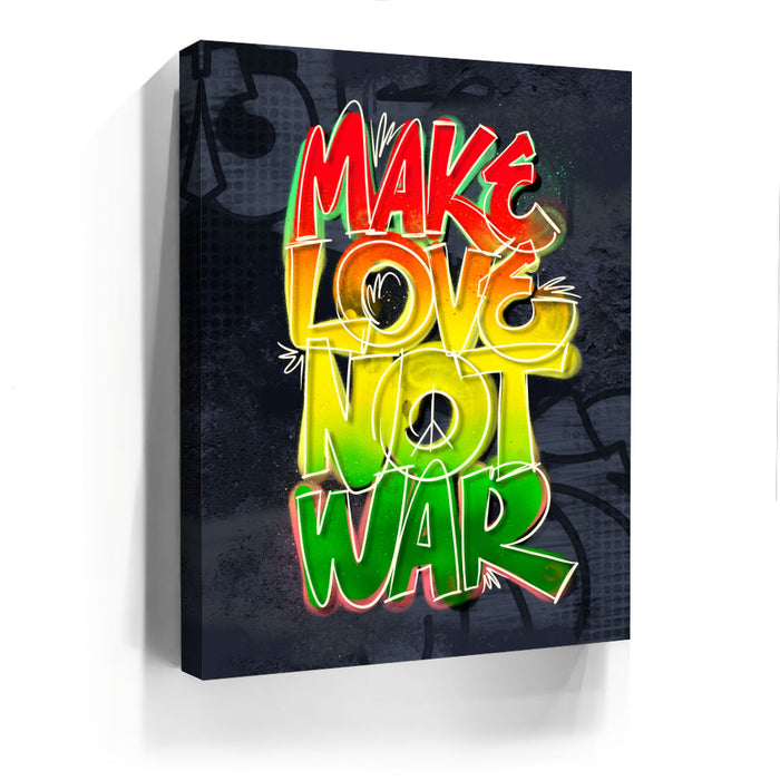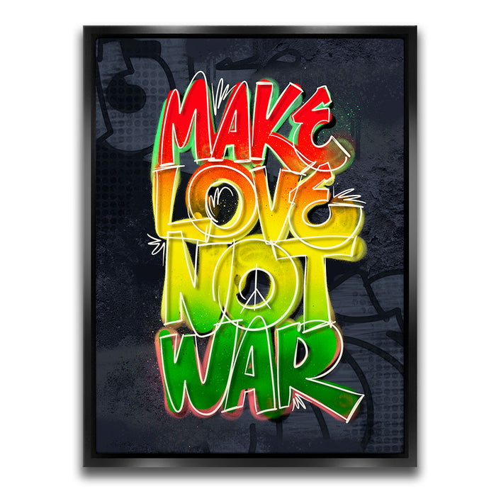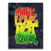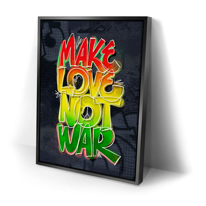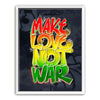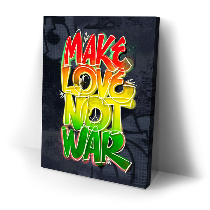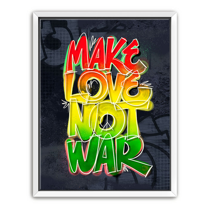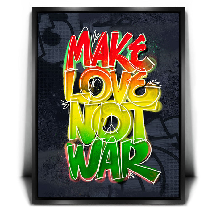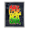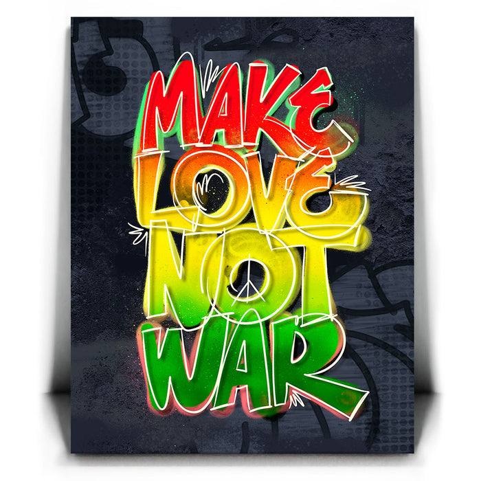 "Make Love Not War - Graffiti" is a bold and vibrant street art-inspired piece that echoes the famous peace slogan from the 1960s. The text is spray-painted in eye-catching shades of red, yellow, and green, with dynamic outlines that give it a glowing effect. The central message is accented with a peace symbol, reinforcing its call for love and harmony over conflict. This artwork combines the expressive energy of graffiti with a timeless message of peace, making it a perfect addition to any collection celebrating activism, counter-culture, and positivity.