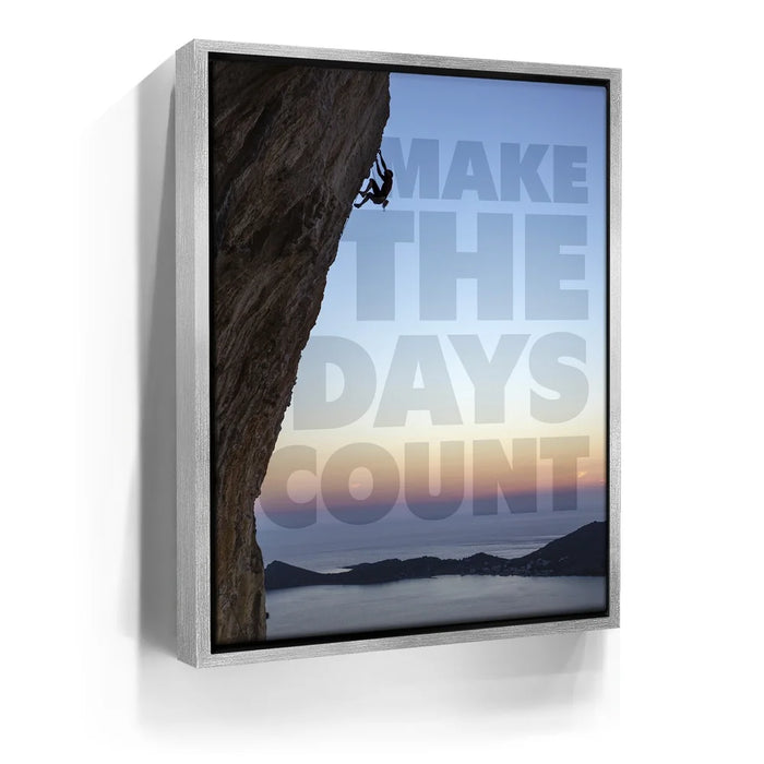 Make The Days Count captures the essence of perseverance and purpose with a breathtaking image of a climber scaling a sheer cliff at sunset. The soft gradient sky and bold typography remind you to live each day with intention and courage. This motivational wall art is perfect for adventurers, entrepreneurs, and anyone striving to reach new heights—both literally and figuratively.