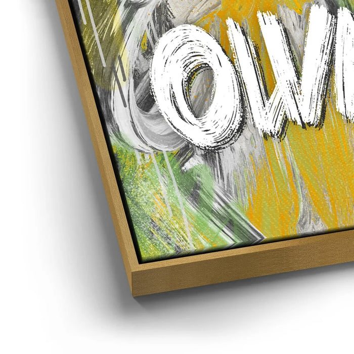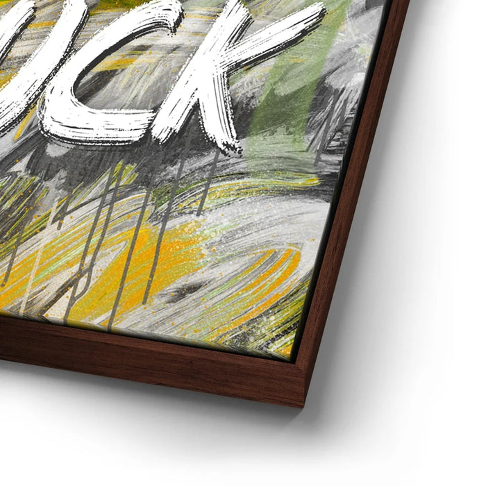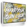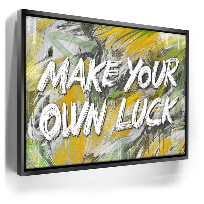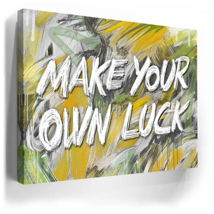 "Make Your Own Luck" is a bold motivational artwork that combines energetic brushstrokes of yellow, green, and gray with powerful typography. The dynamic abstract background emphasizes movement and drive, while the striking white text inspires action, resilience, and determination.