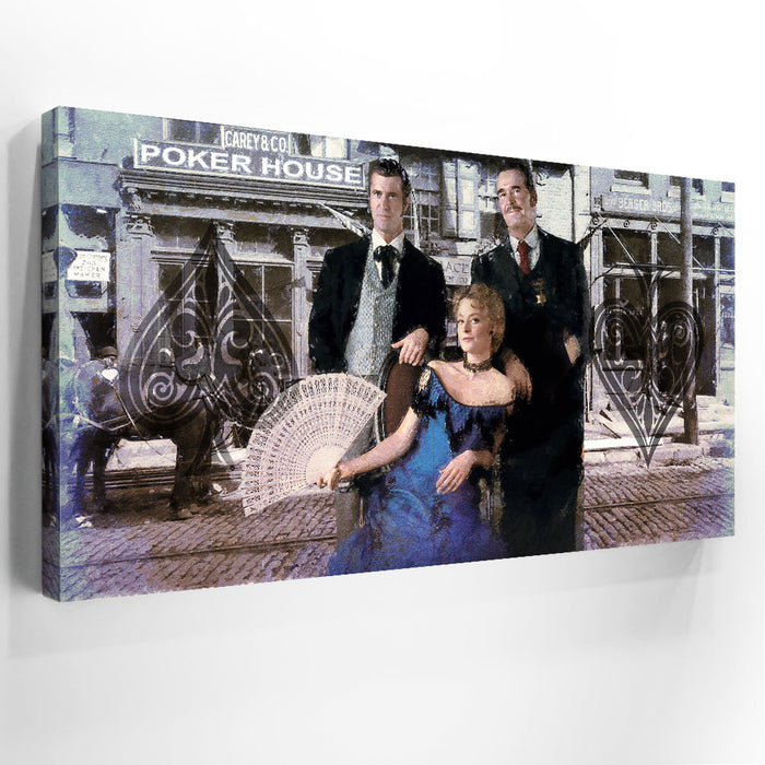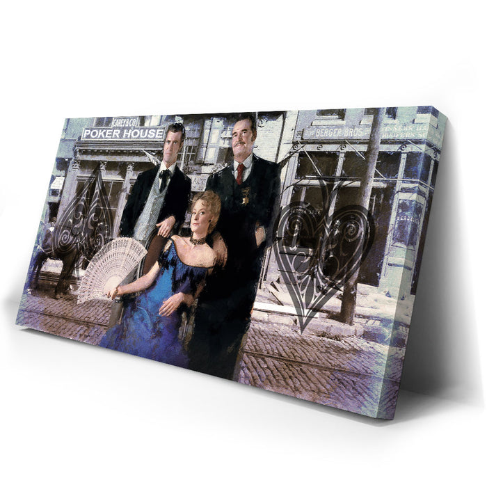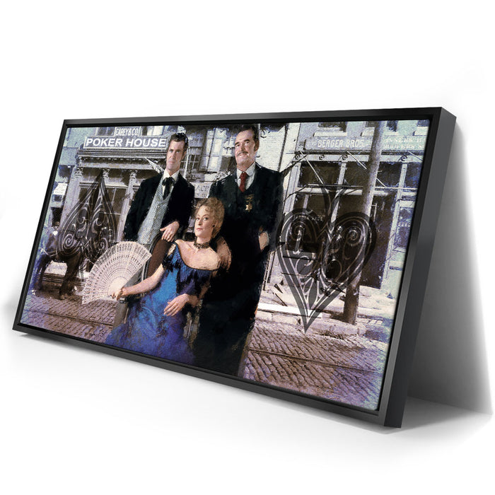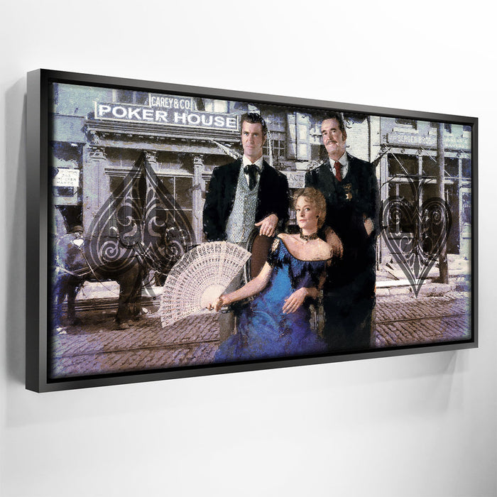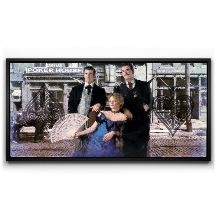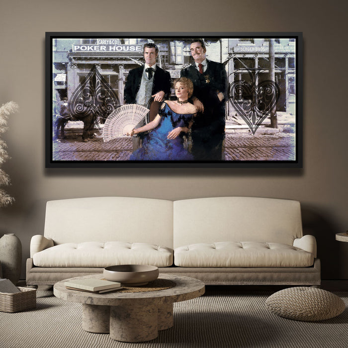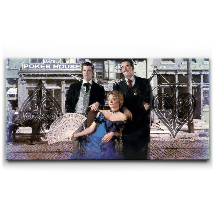 The "Maverick Canvas Set" by Don Husband brings the essence of the Wild West to life with a nod to the iconic movie *Maverick*. This artwork captures the adventurous spirit of poker games, cowboys, and country-western charm. Featuring a wide landscape design, the piece highlights elements of gambling, Texas Hold'em, and five-card draw, making it an ideal addition for poker enthusiasts and fans of classic western films.