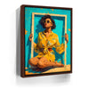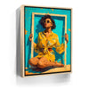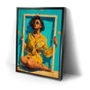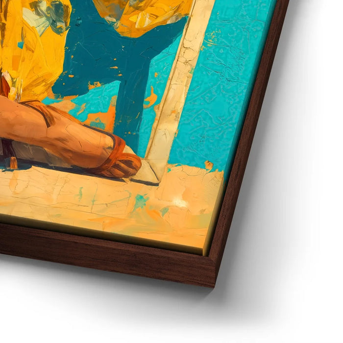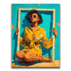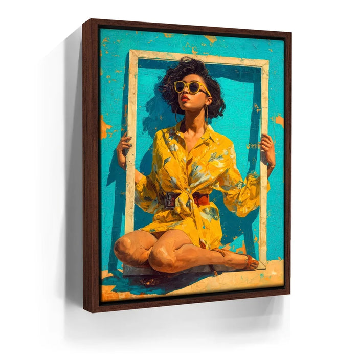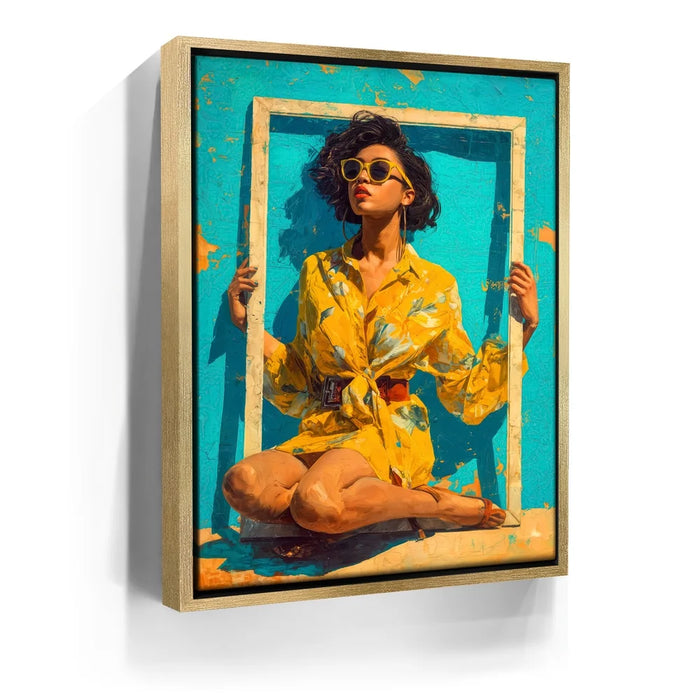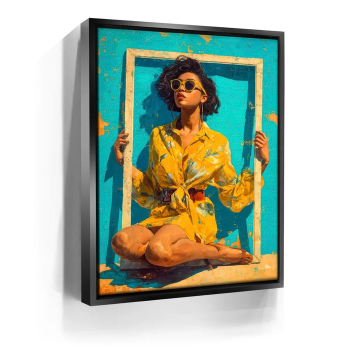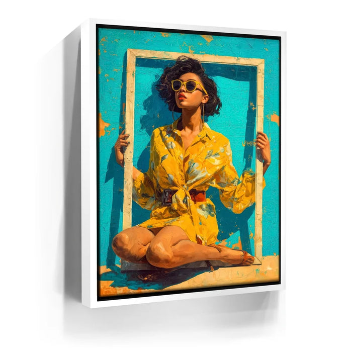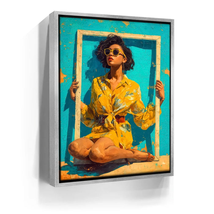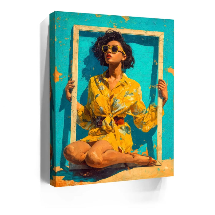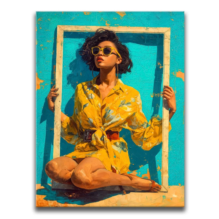 "Mellow Drama" by Kandise King radiates vibrant summer energy with its bold use of color and striking composition. A woman in a bright yellow floral dress and matching sunglasses sits framed against a turquoise backdrop, her confident pose and effortless style making her the center of attention. The bold hues and playful framing create a piece that feels both modern and timeless, bursting with personality and flair.