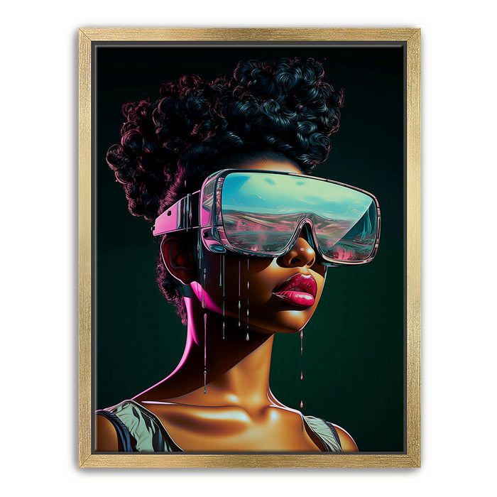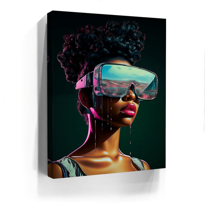 "Meta Drip" by Kandise King is a bold and futuristic portrait that explores the intersection of technology and style. Featuring a striking subject wearing oversized reflective VR goggles, the piece captures a surreal and immersive aesthetic. With glossy textures, vibrant lighting, and dripping effects, the artwork embodies innovation, individuality, and a vision of the digital future.