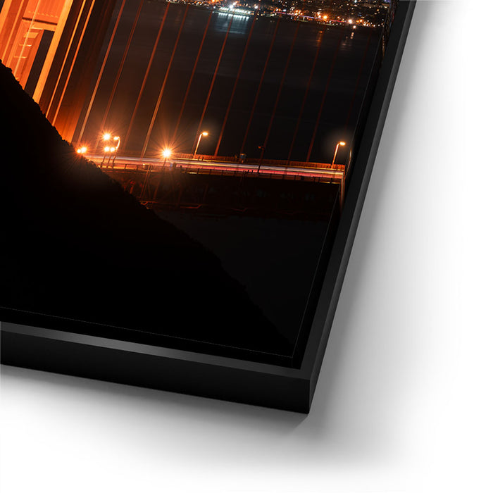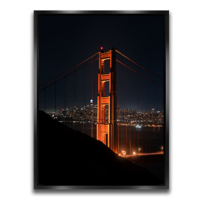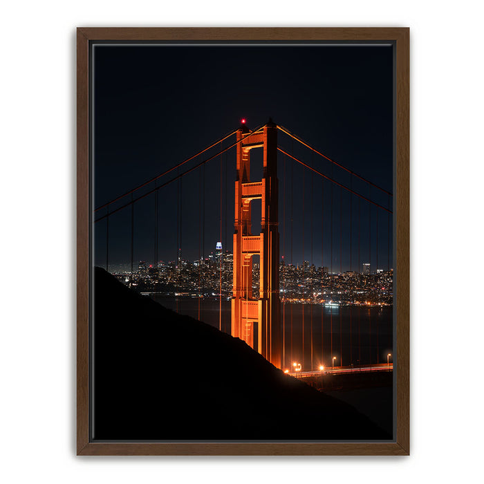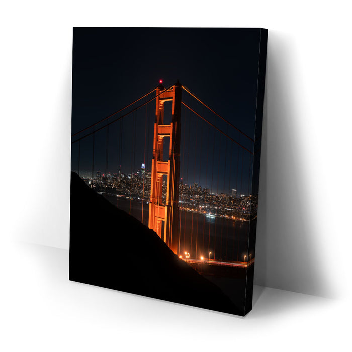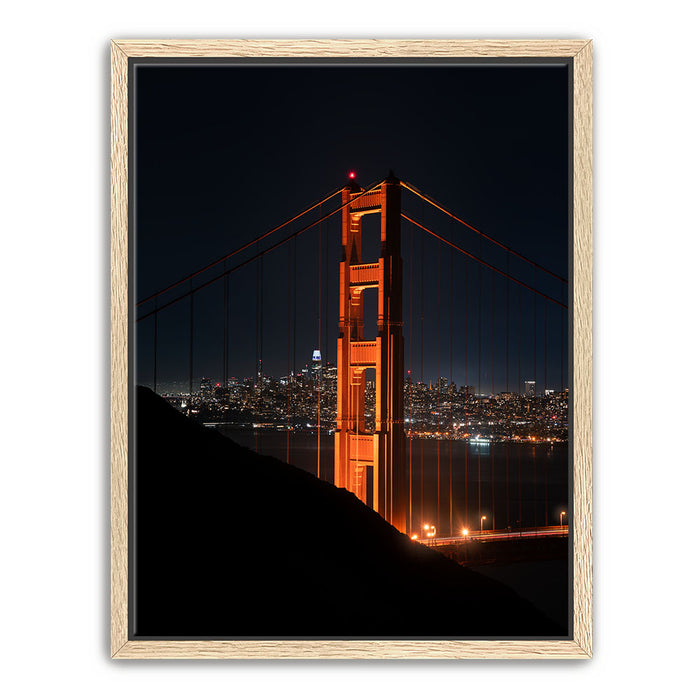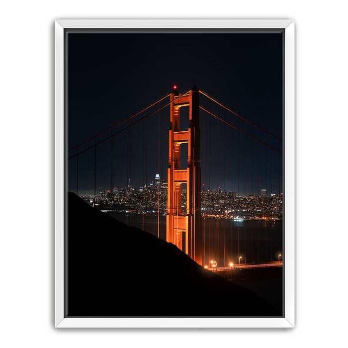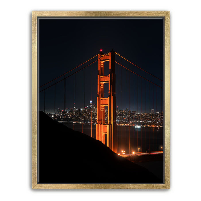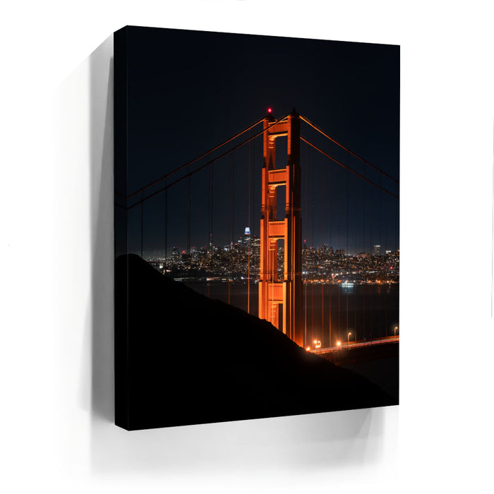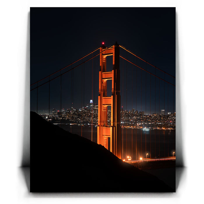 The bridge stands as a symbol of California's architectural beauty, connecting the city's vibrant life with the calmness of the surrounding hills. Perfect for those who appreciate the serene yet powerful presence of cityscapes at night, this piece brings the allure of San Francisco’s night life into your space.