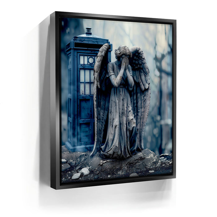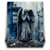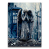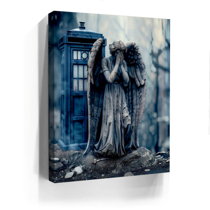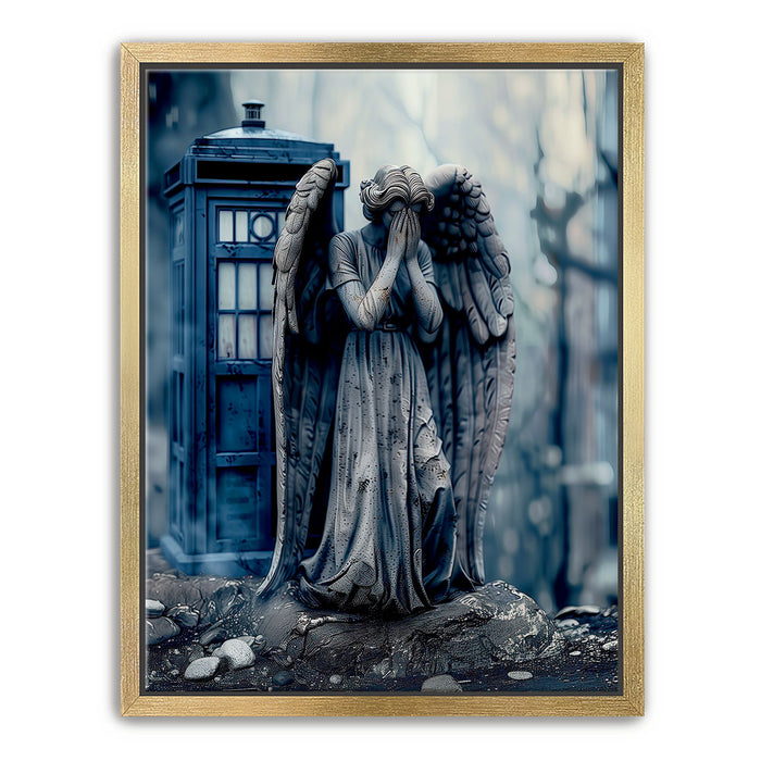 "Missing Timelord" by Kandise King is a haunting and evocative piece that combines elements of science fiction and gothic art. The artwork features a weeping angel statue, a chilling symbol of frozen time, set against the backdrop of a mysterious blue police box. With muted tones and a misty atmosphere, the piece exudes an air of mystery, melancholy, and otherworldly intrigue.