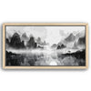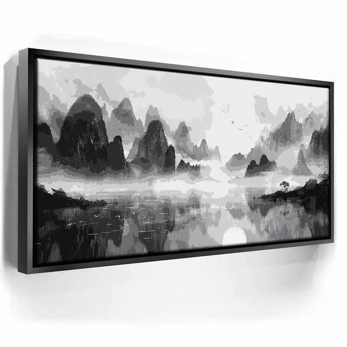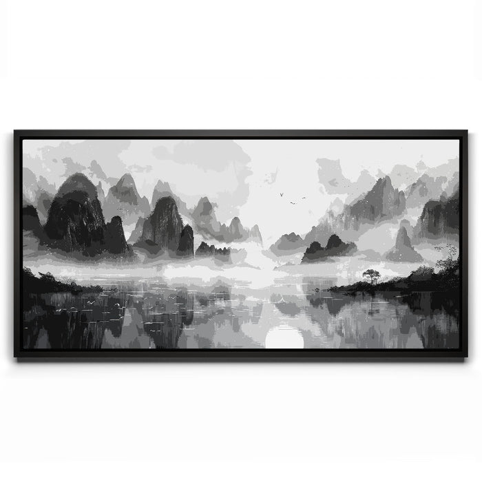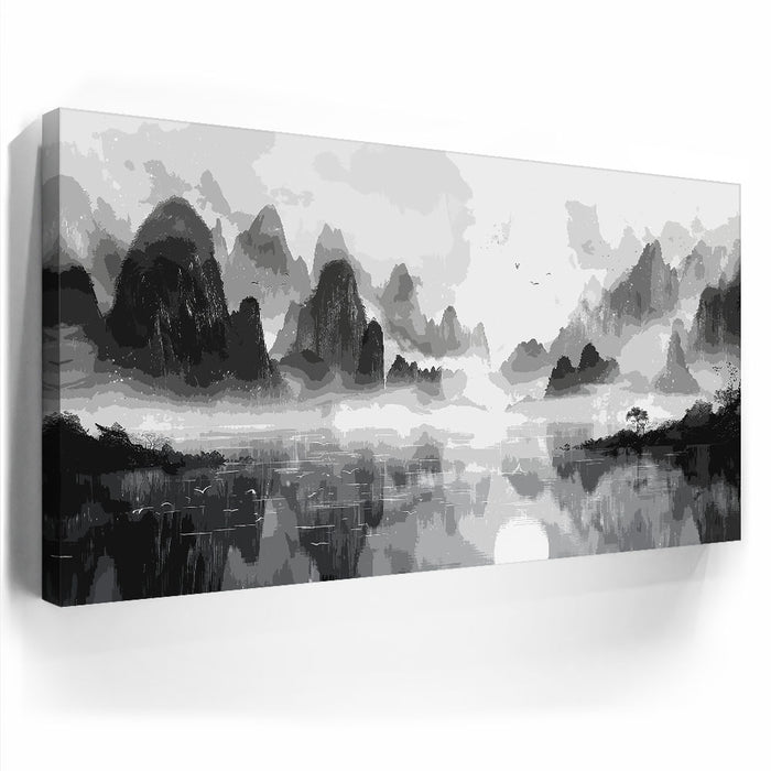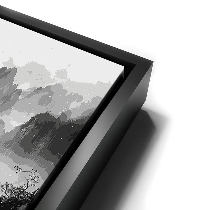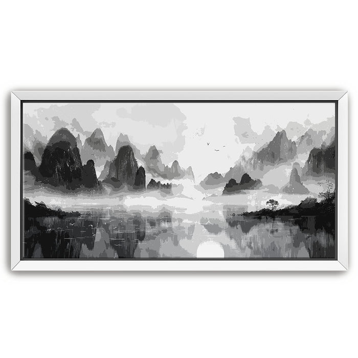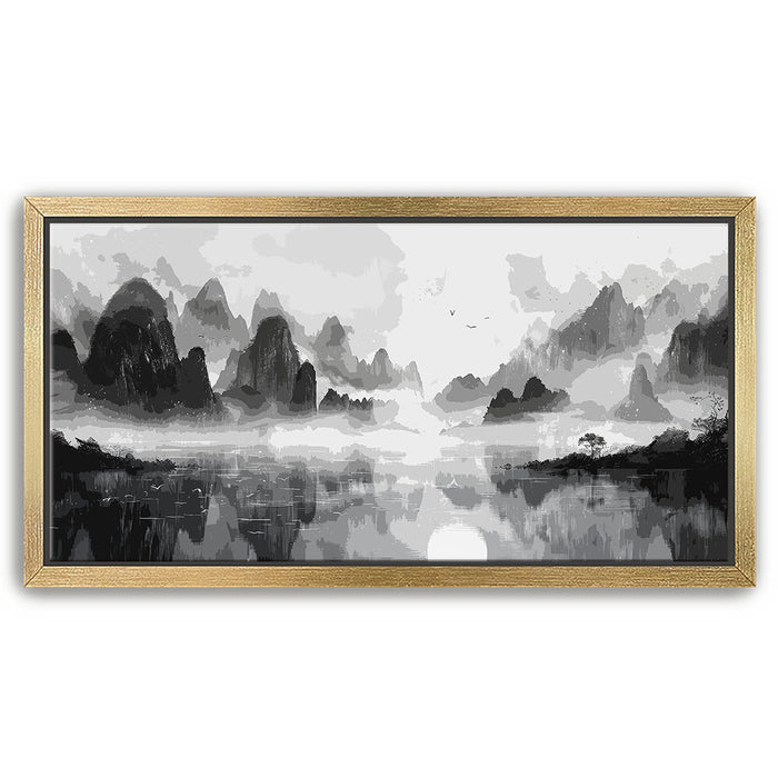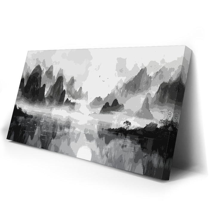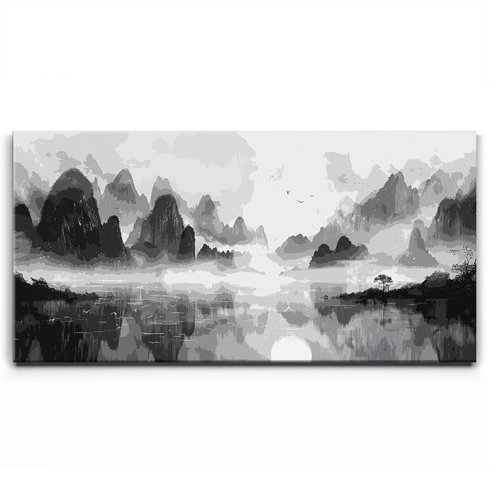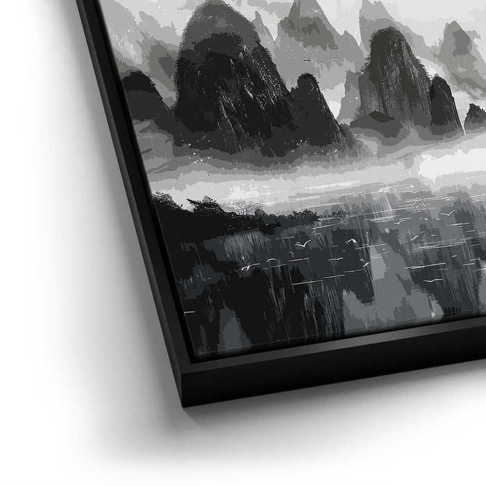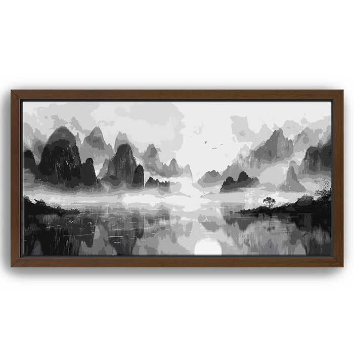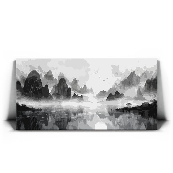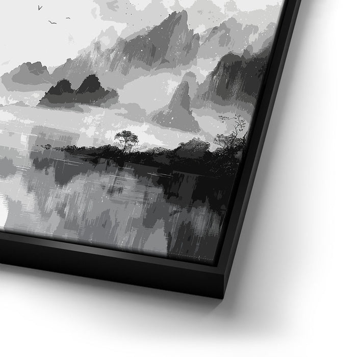 Featuring elements like mountains, water, trees, birds, and swirling mist, Misty Mountains blends the drama of nature with the elegance of greyscale tones. Ideal for fans of abstract wall art and mountain scapes, this artwork brings a modern yet timeless atmosphere to any space.