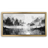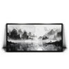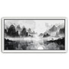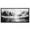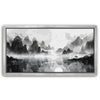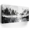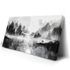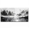 Misty Mountains by Sean Pearce is a striking black and white abstract artwork that captures the serene beauty of a mist-covered mountain range. With layers of dark grey peaks, a cloud-filled sky, and soft reflections on a tranquil lake or river, this piece evokes a sense of peaceful isolation and natural grandeur.