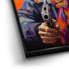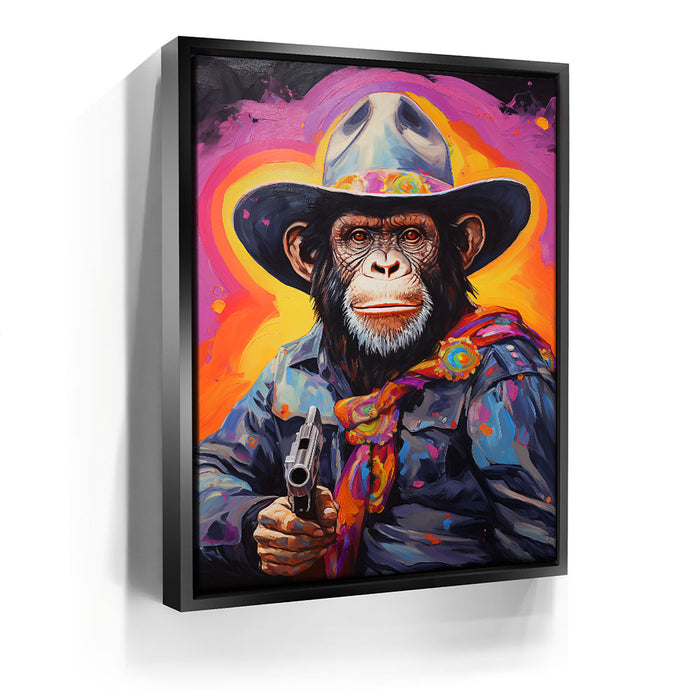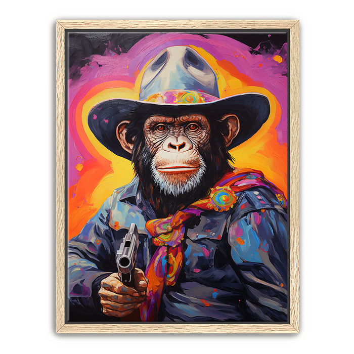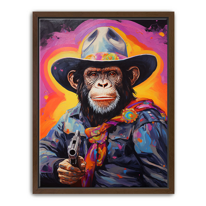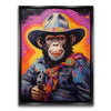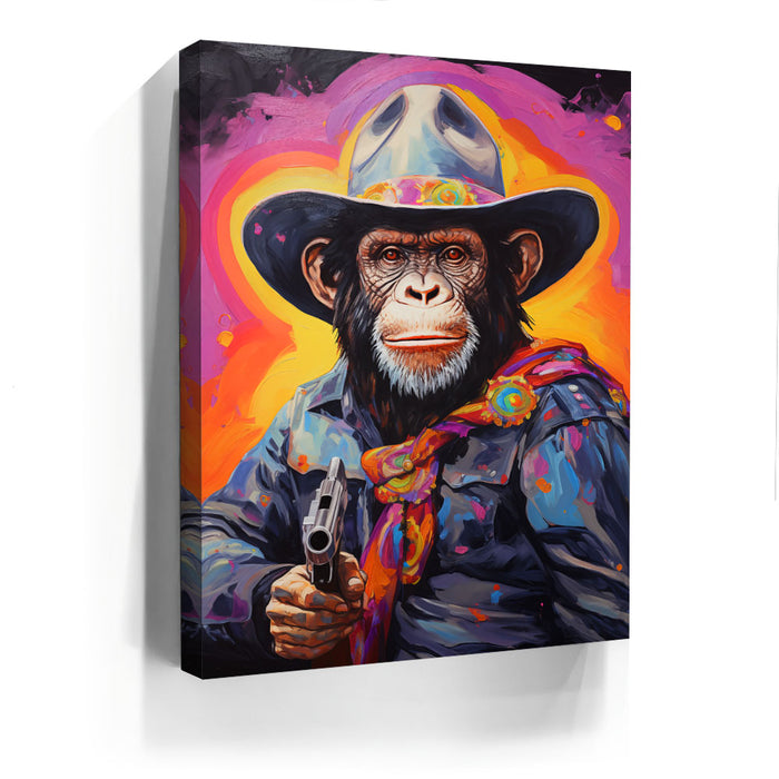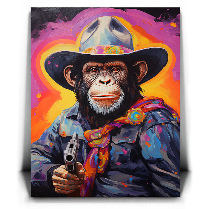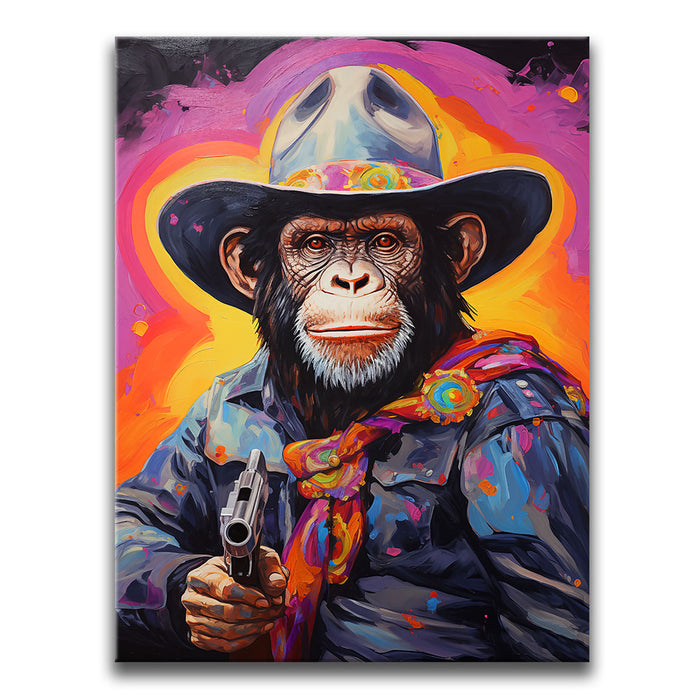 "Monkey Business" by Sean Pearce is a vibrant, portrait-style abstract artwork that brings a playful twist to the world of wild animals and cowboy life. Featuring monkeys dressed in Western-inspired hats and wielding guns, this piece blends humor, attitude, and creativity in a unique exploration of zoo animals in a Wild West setting.