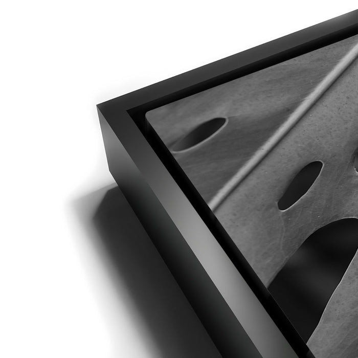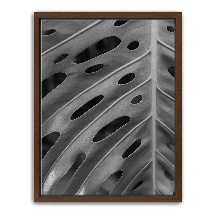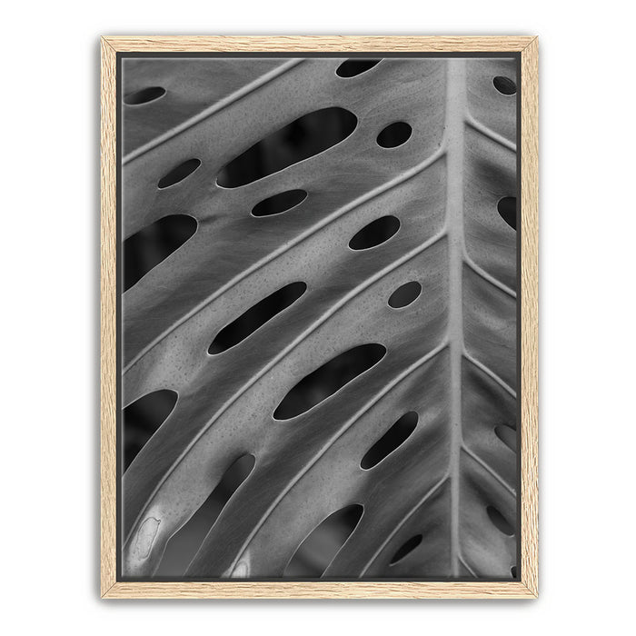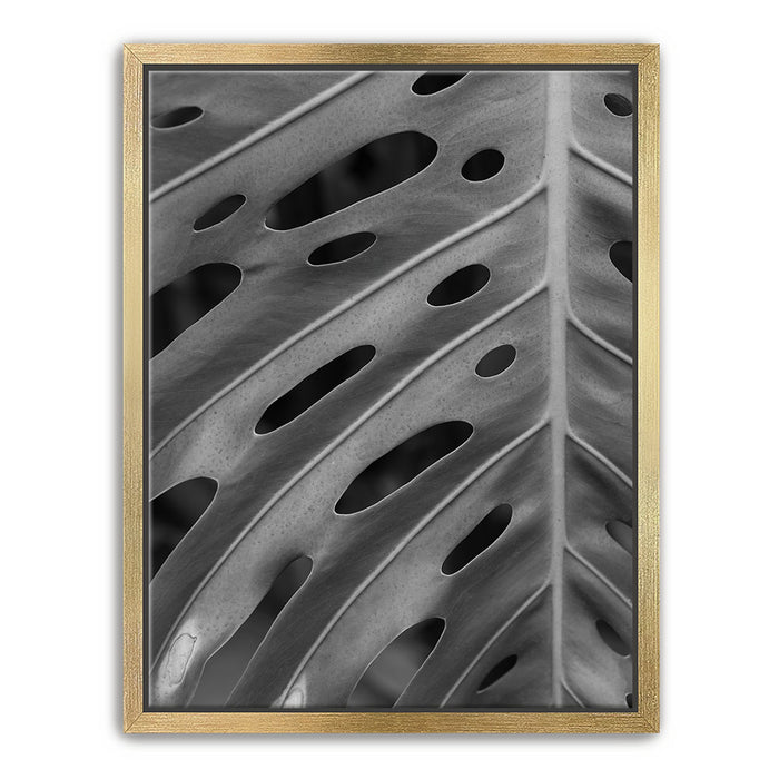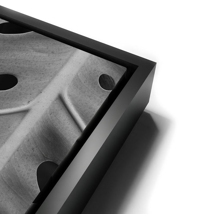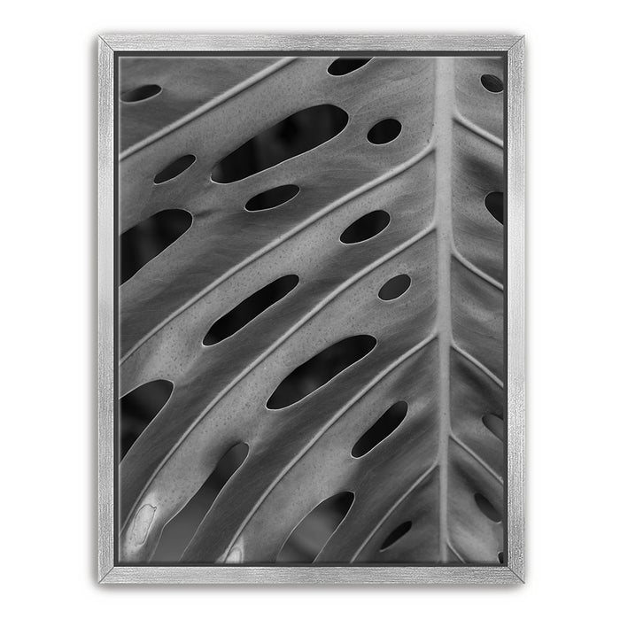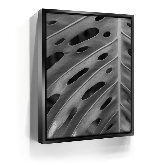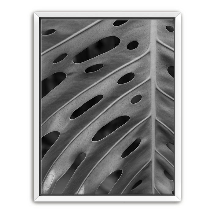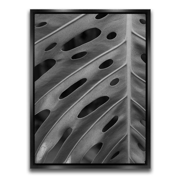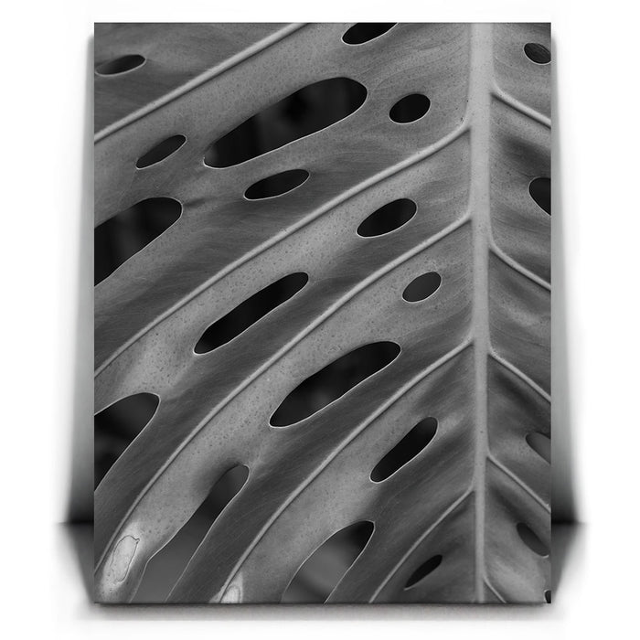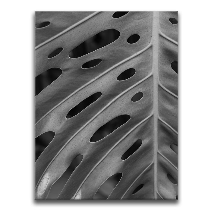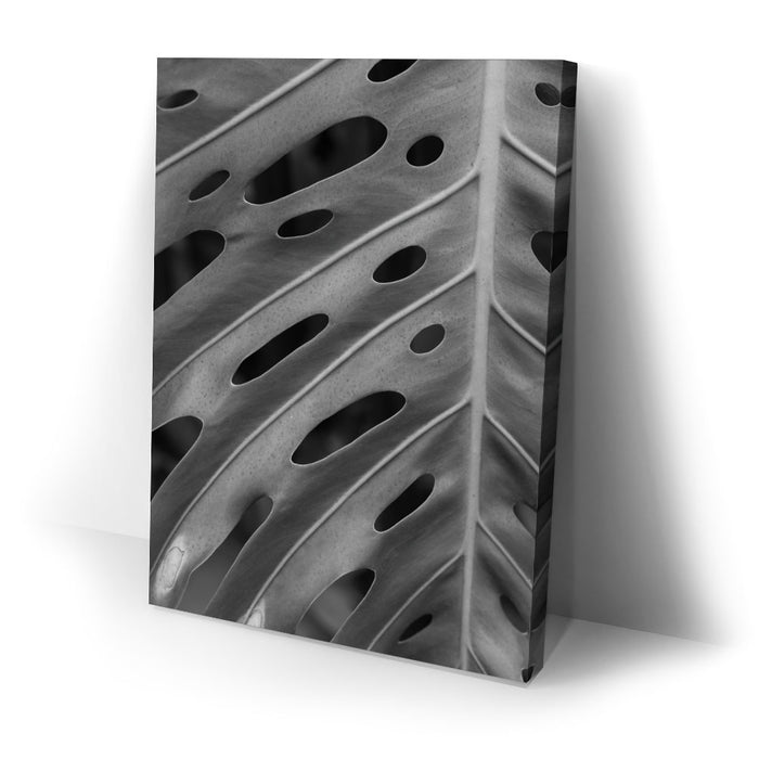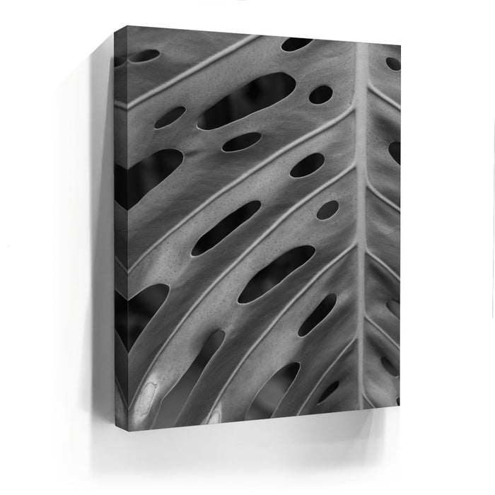Elevate your space with this striking black-and-white canvas art featuring the intricate details of a Monstera leaf. The close-up view emphasizes the leaf's unique pattern of holes and textures, creating a captivating, almost abstract design that highlights the beauty of nature in its simplest form.