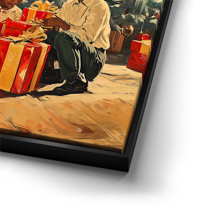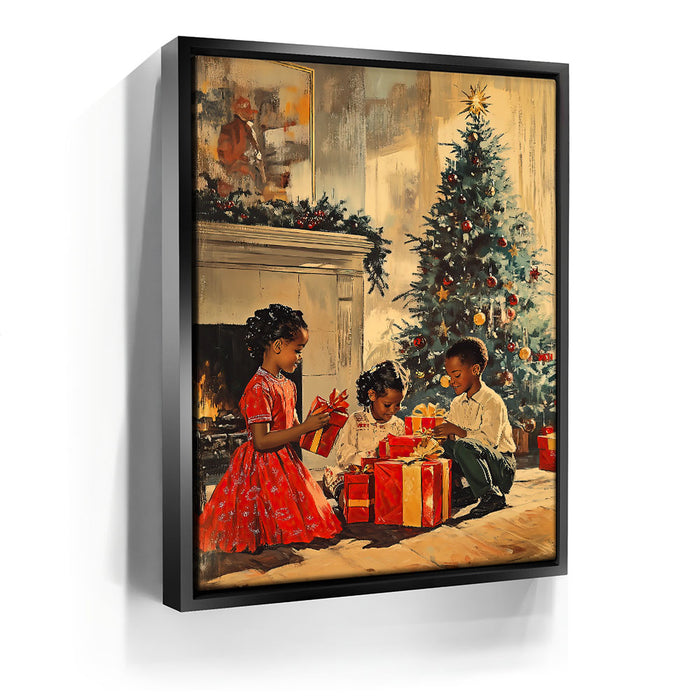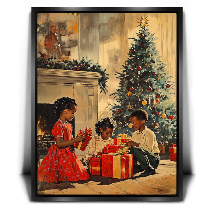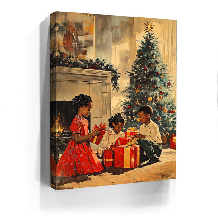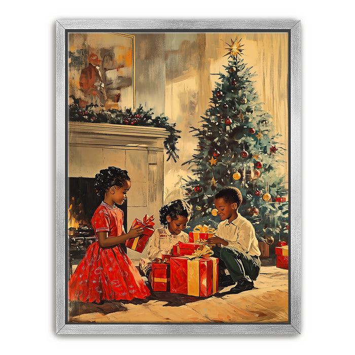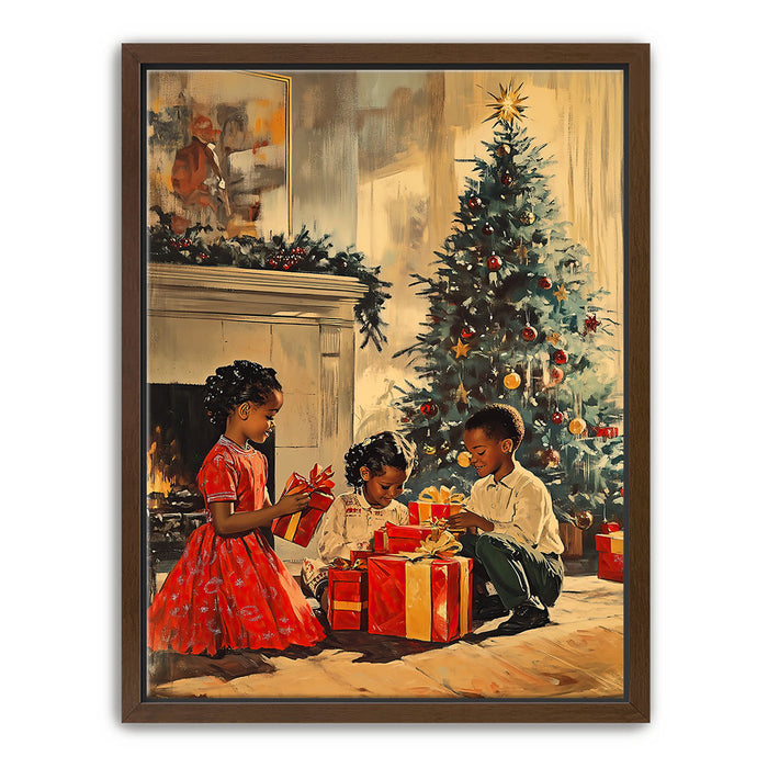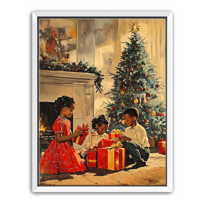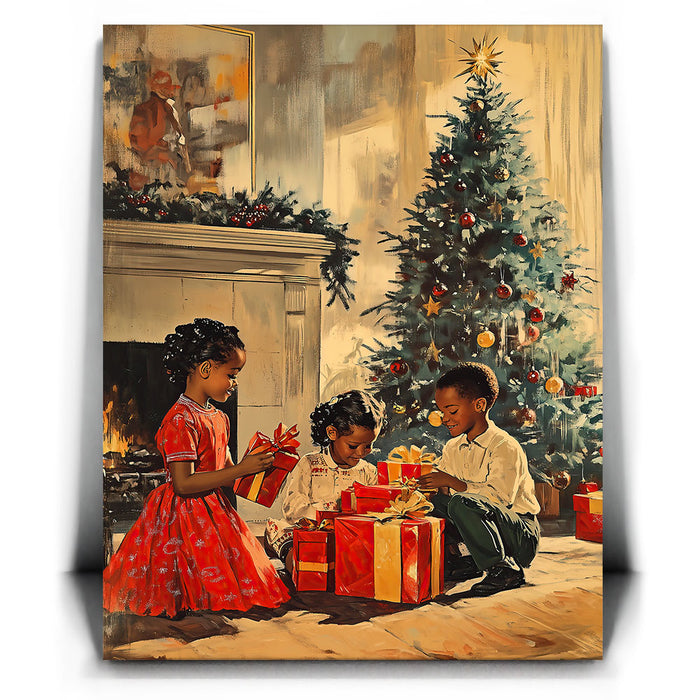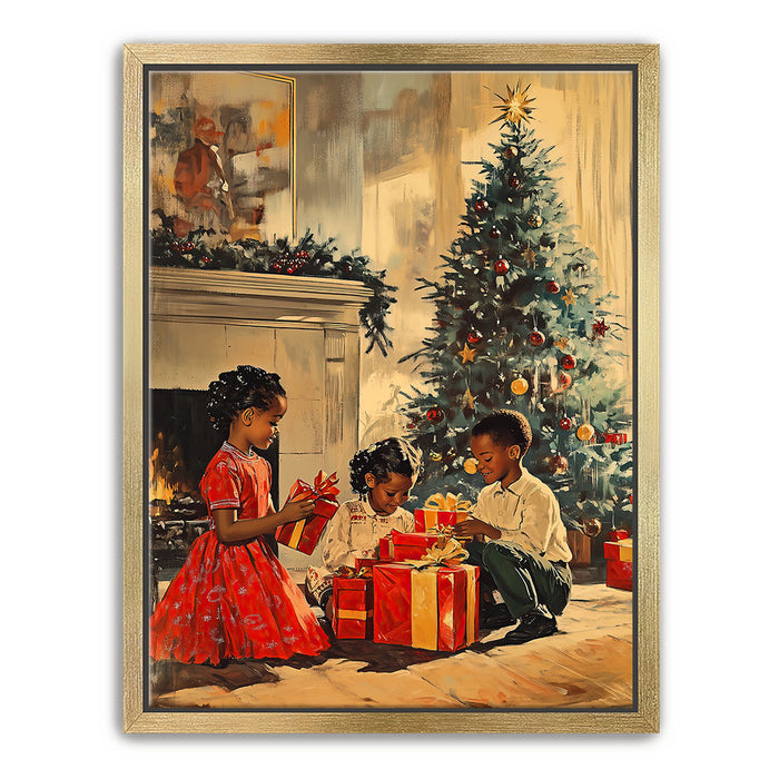 "Morning Merriment" by Kandise King is a heartwarming depiction of the joy and togetherness of the holiday season. The artwork captures three children gathered around a beautifully decorated Christmas tree, unwrapping brightly colored presents with expressions of excitement and wonder. The warm glow of the fireplace and the festive garland enhance the cozy, nostalgic atmosphere, evoking cherished memories of family traditions.