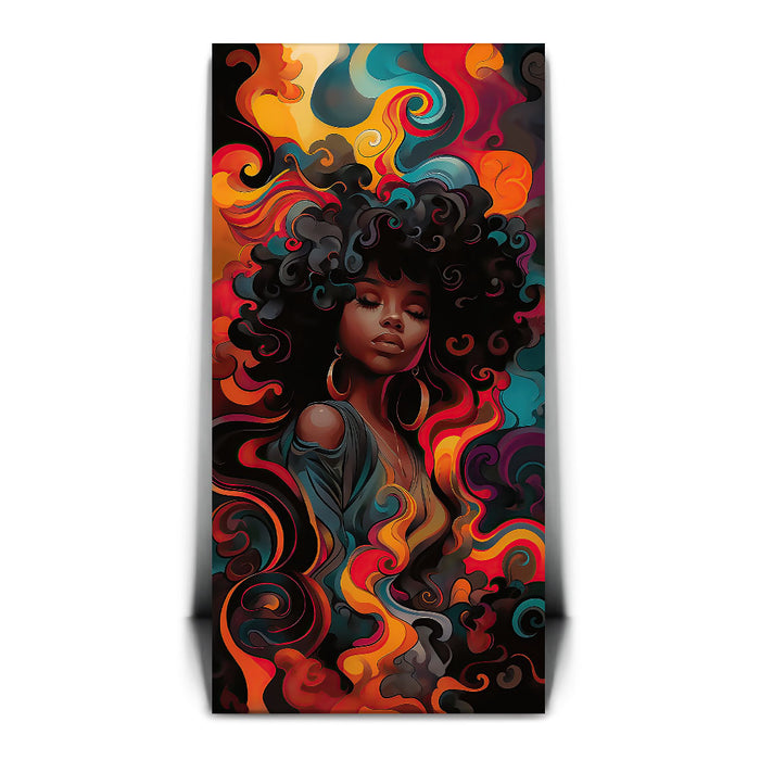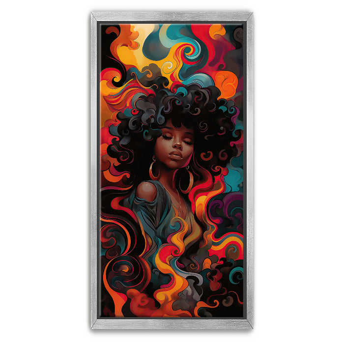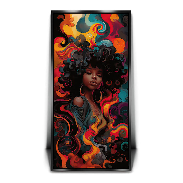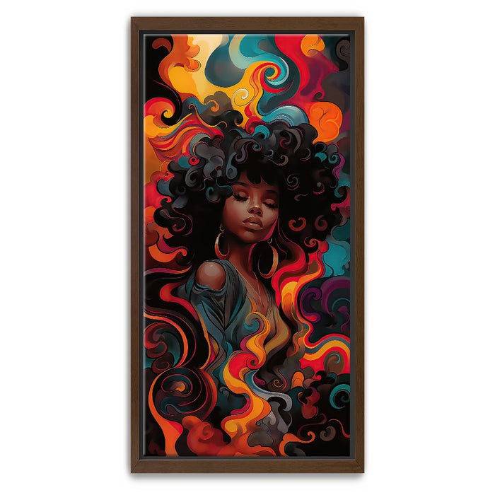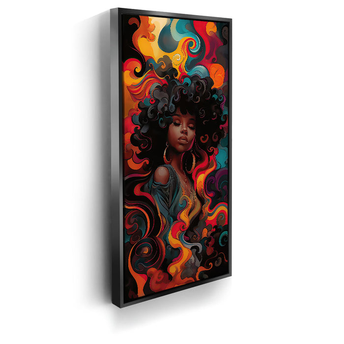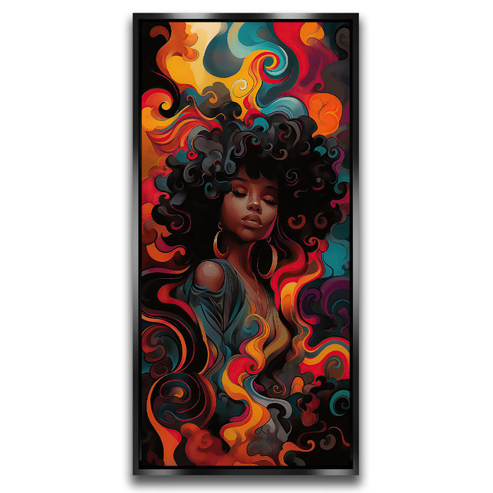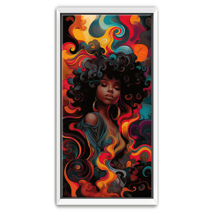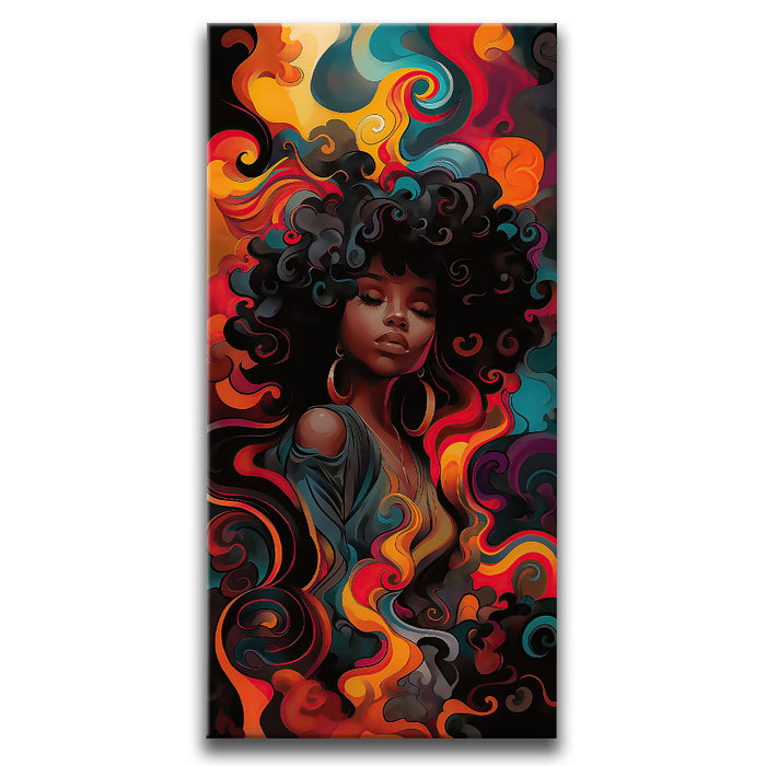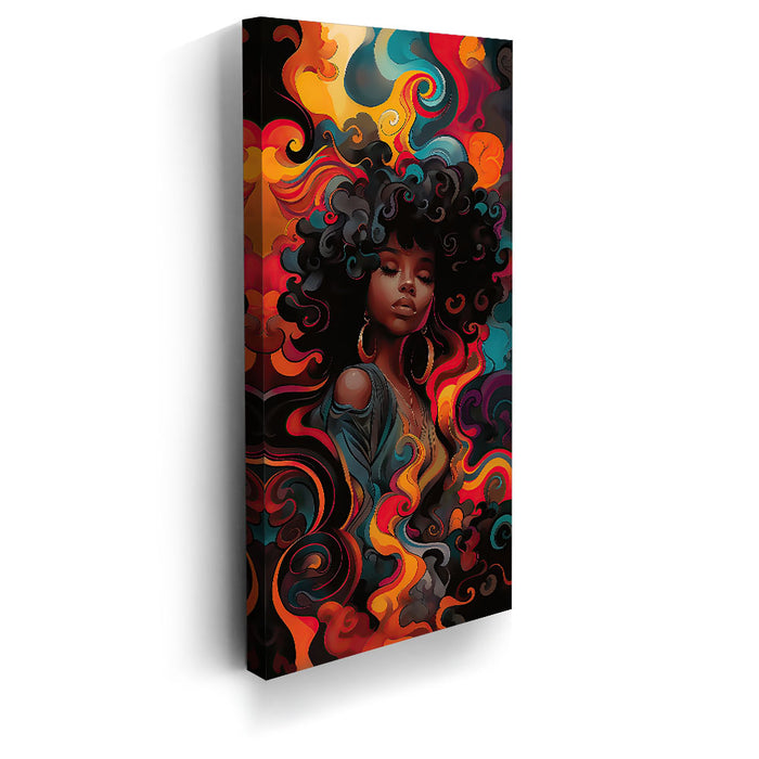 Add a burst of vibrant energy to your space with this stunning canvas art, featuring a captivating portrait of a woman enveloped in a swirl of bold, flowing colors. The artwork beautifully blends elements of modern expressionism with cultural depth, as the swirling patterns in rich hues of red, orange, blue, and gold dance around the figure, symbolizing creativity, passion, and inner strength.