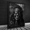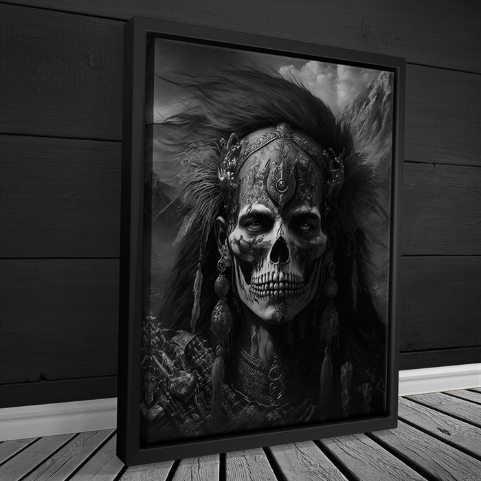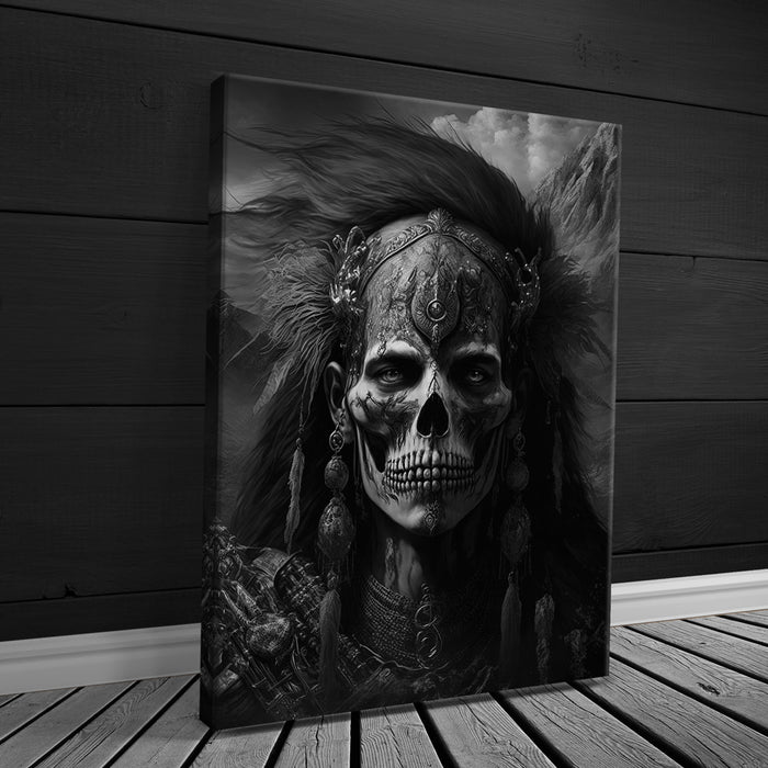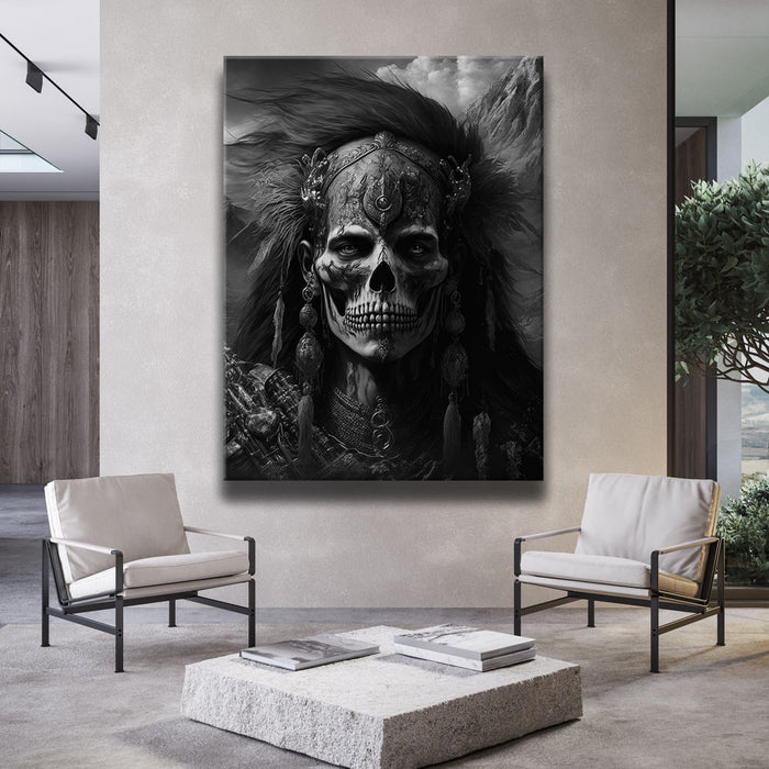 This striking artwork depicts a powerful Native Skull Warrior, blending tribal and warrior elements into a hauntingly beautiful portrait. The intricate details of the skull face are adorned with traditional Native American jewelry and feathers, giving it a fierce yet majestic presence.