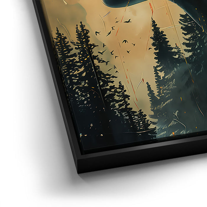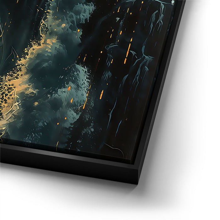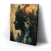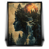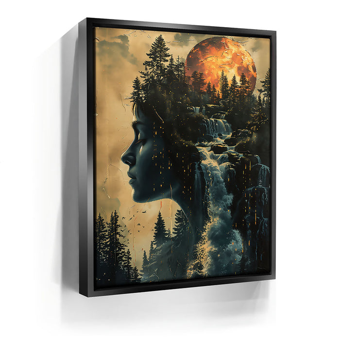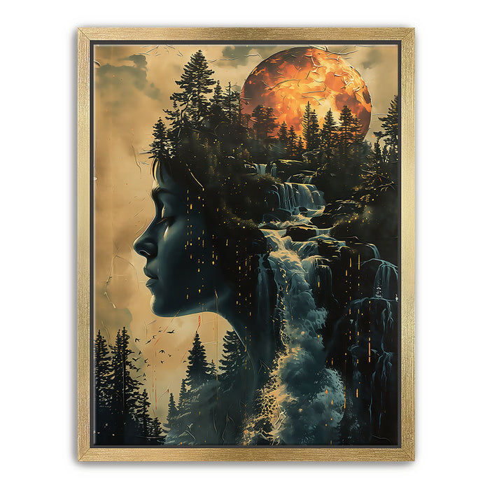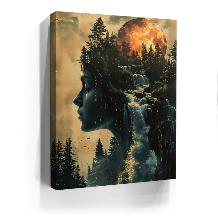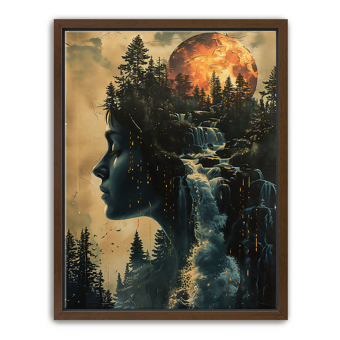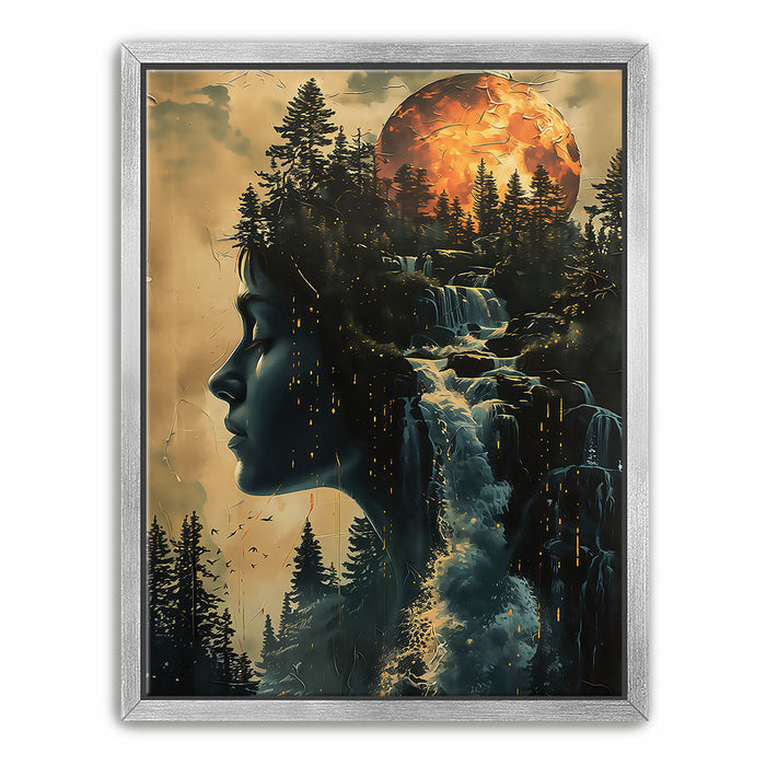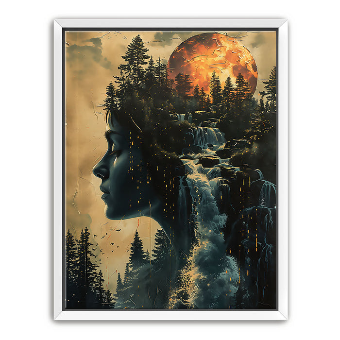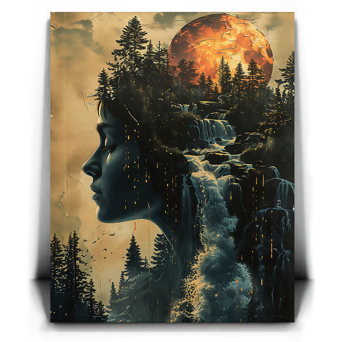 "Nature's Echo" by Stella Ygris is a captivating piece of art that seamlessly merges the human form with elements of the natural world. Featuring a serene silhouette intertwined with cascading waterfalls, towering trees, and a glowing, textured moon, the artwork evokes themes of harmony, introspection, and the profound connection between humanity and nature.