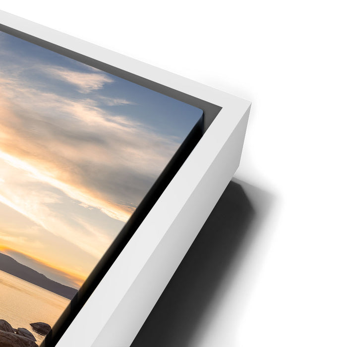 When you receive your order it will arrive pre-installed with industrial sawtooth coated metal hooks so it’s ready to hang right out of the box. Our handmade floating frames, available in various thickness options, add a touch of sophistication and come ready to hang right out of the box with a high quality wire hangar.