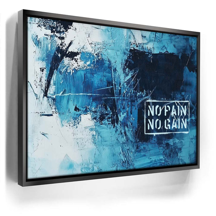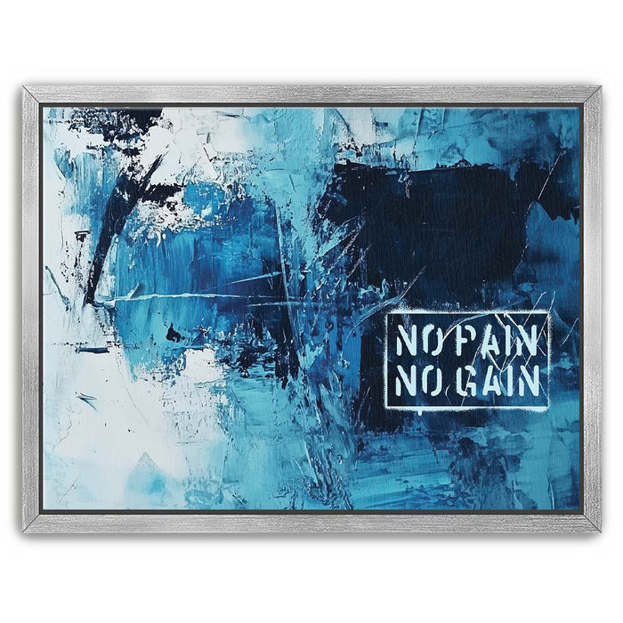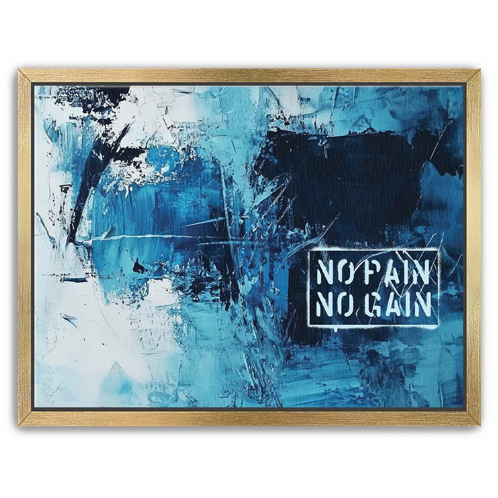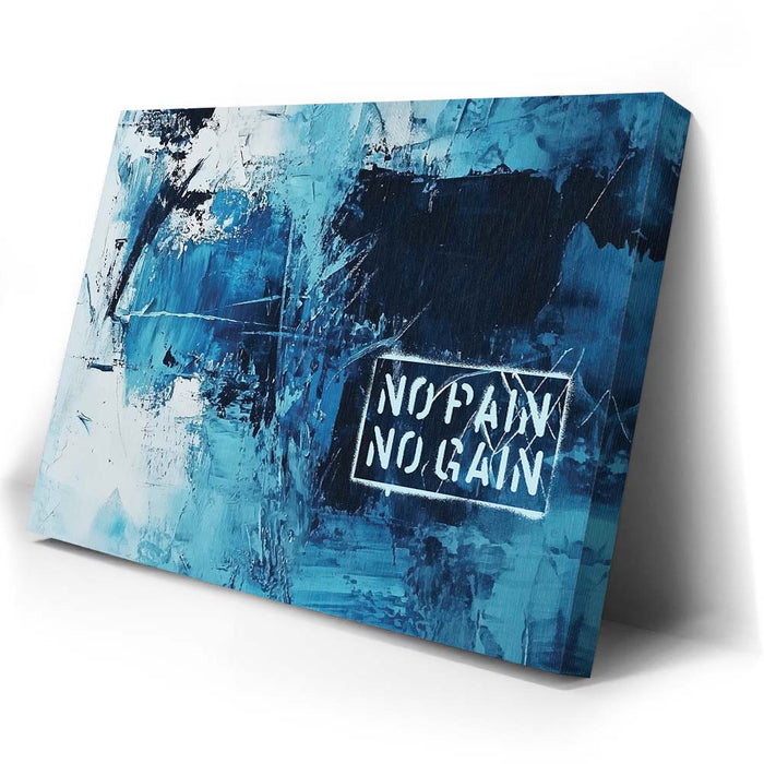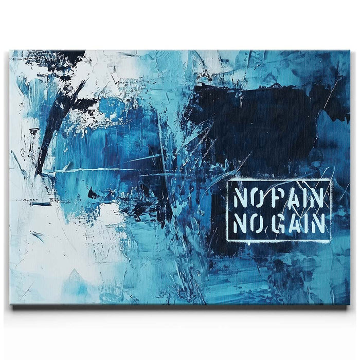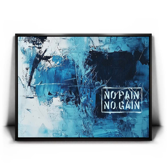 "No Pain No Gain" is a bold abstract artwork that embodies strength and determination through its dynamic brushstrokes and striking shades of blue. The textured composition, paired with the powerful stencil text, captures the essence of perseverance and the journey toward achievement.