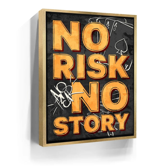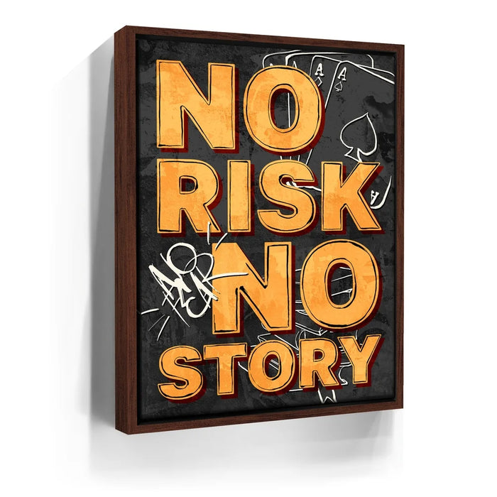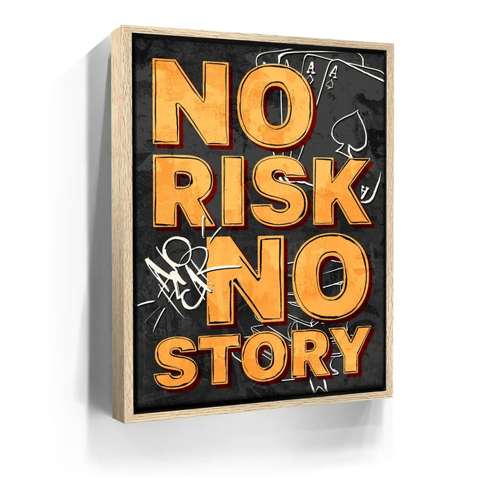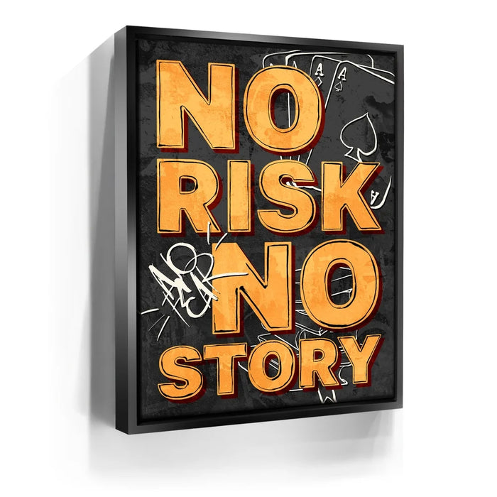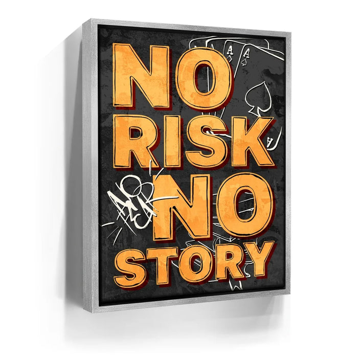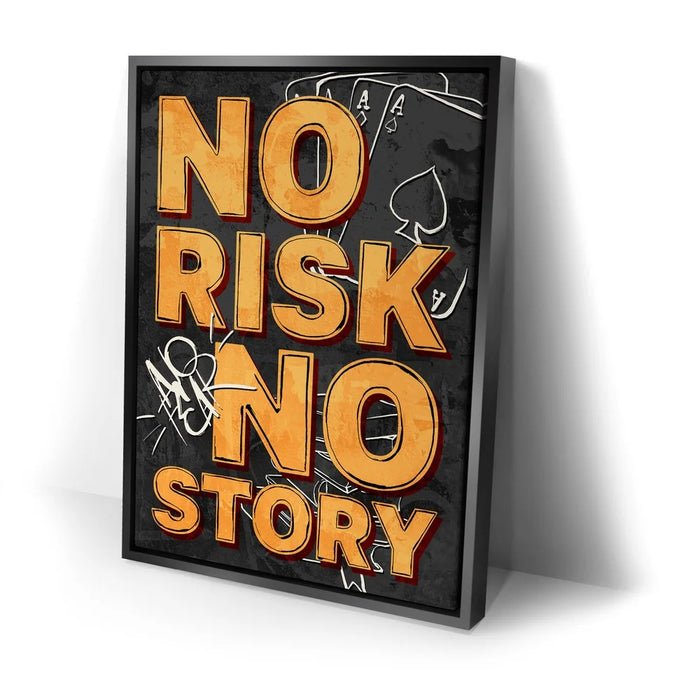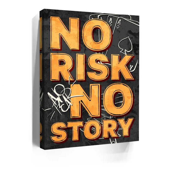 No Risk No Story – Graffiti is a bold reminder that success favors the fearless. With striking orange typography layered over a gritty black-and-gray backdrop of playing cards and graffiti tags, this artwork channels urban edge and motivational fire. Perfect for entrepreneurs, gamers, and dream chasers, it embodies the spirit of taking chances and creating your own legacy.