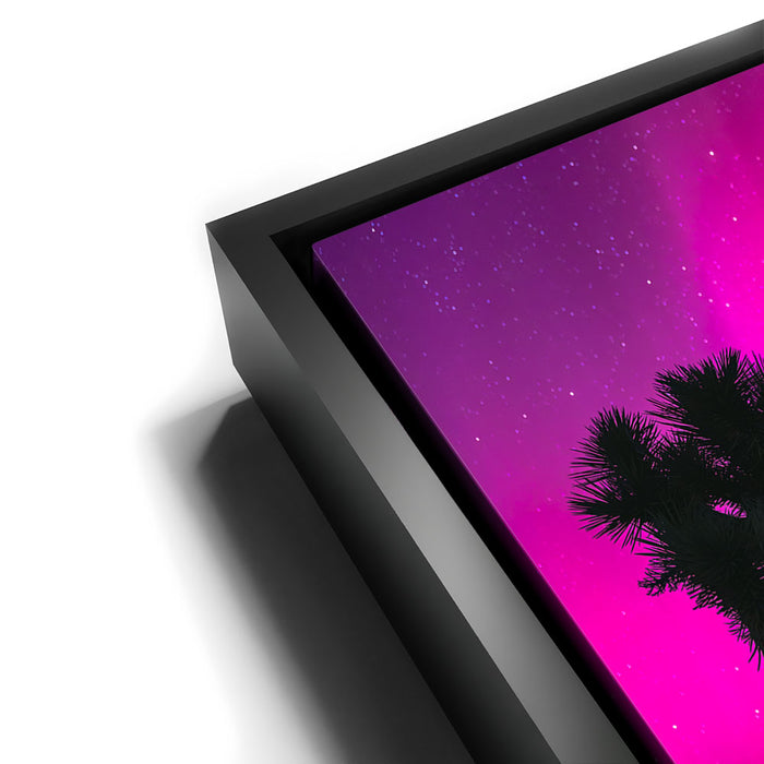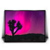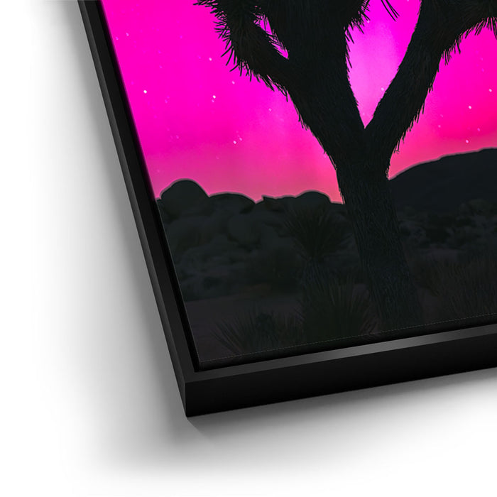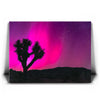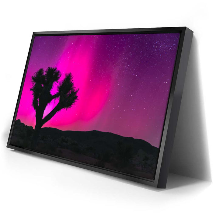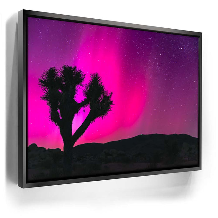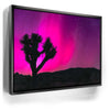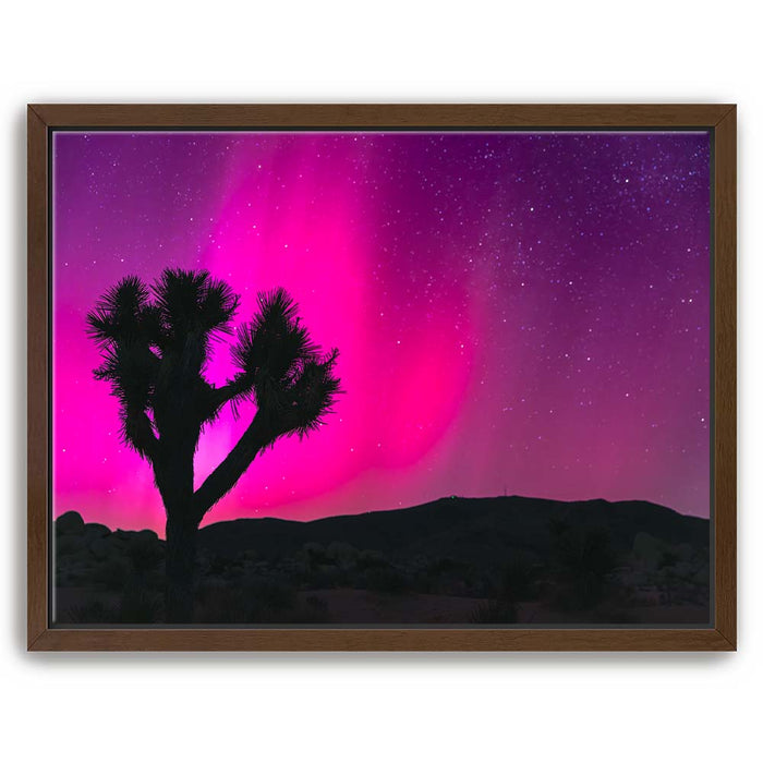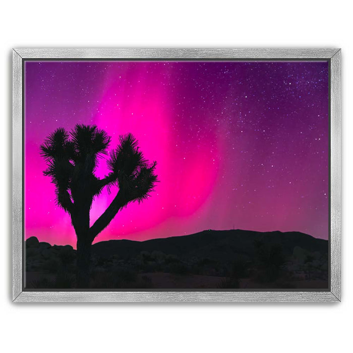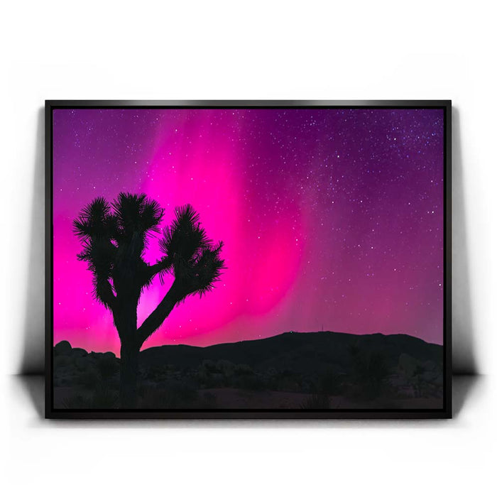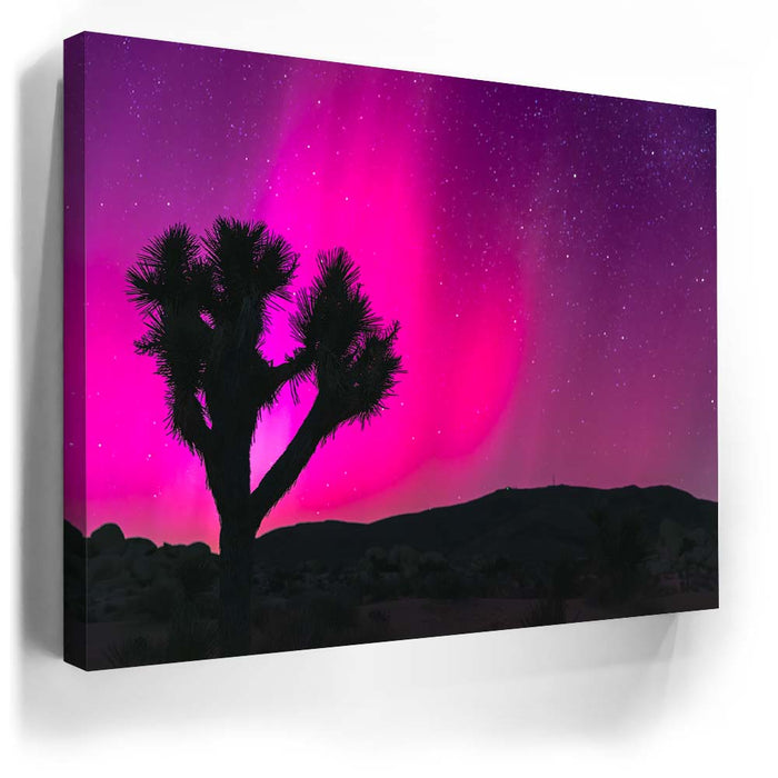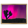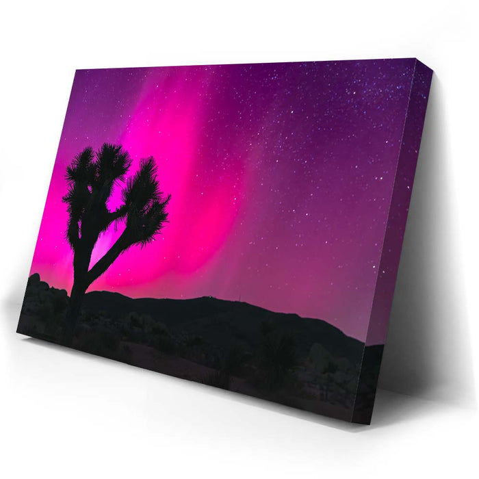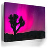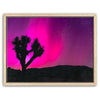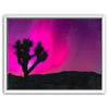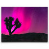This stunning photograph, titled "Northern Lights At Joshua Tree," captures the breathtaking beauty of the night sky as the vibrant purple hues of the aurora borealis dance above the silhouetted Joshua Tree. The serene mountainscape in the background adds depth and contrast to the luminous starry night, creating a mesmerizing scene that blends natural wonders with the mystical ambiance of nighttime.