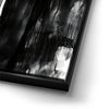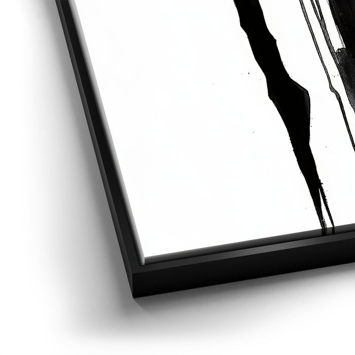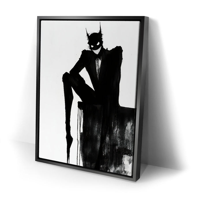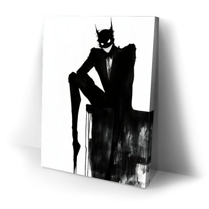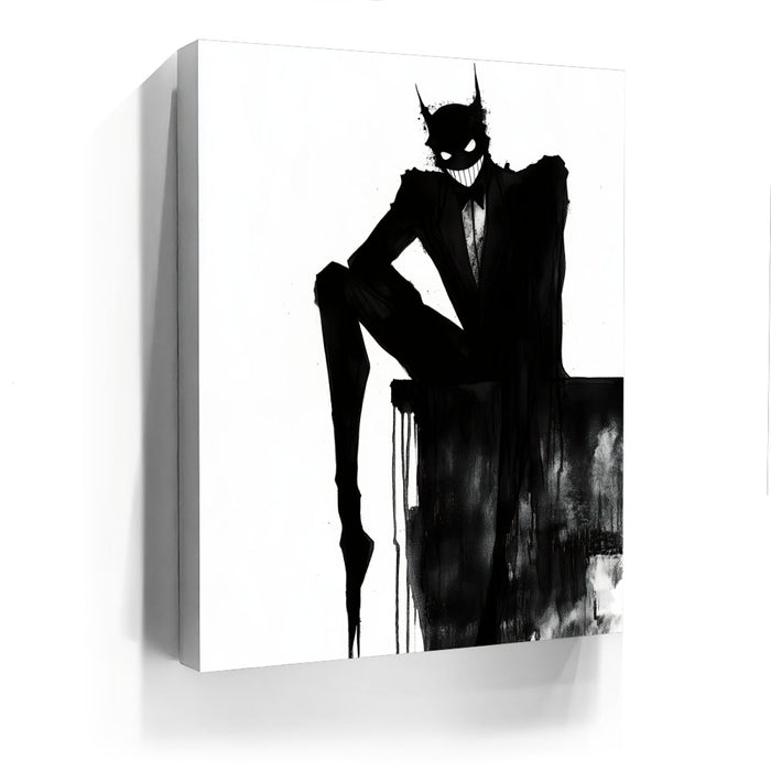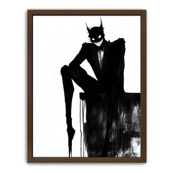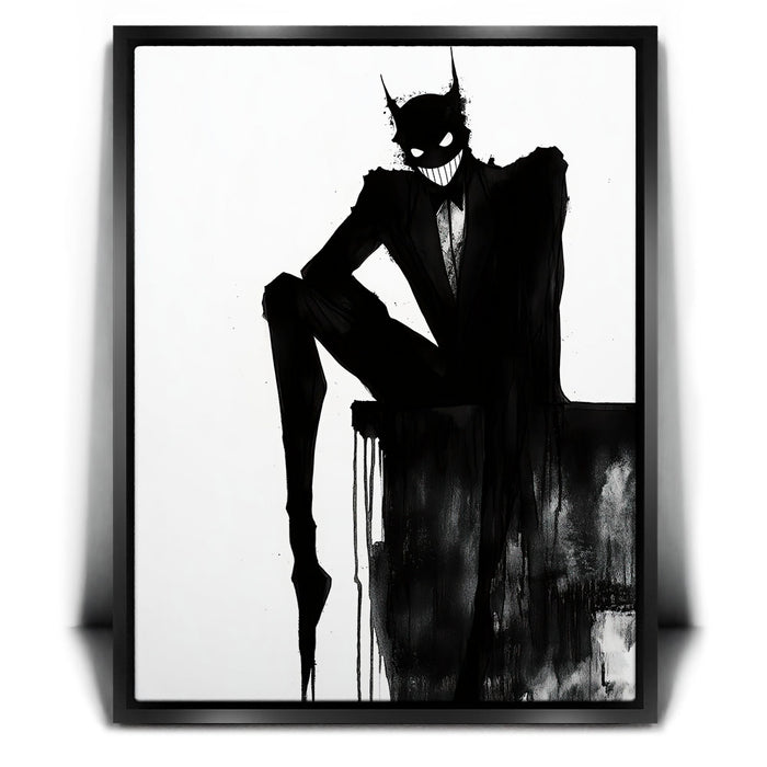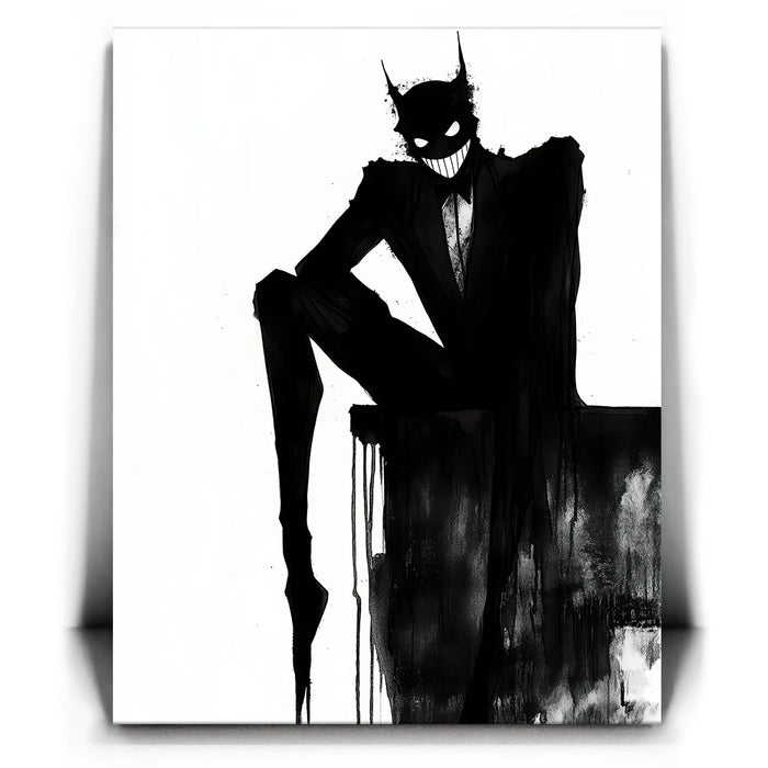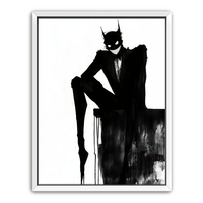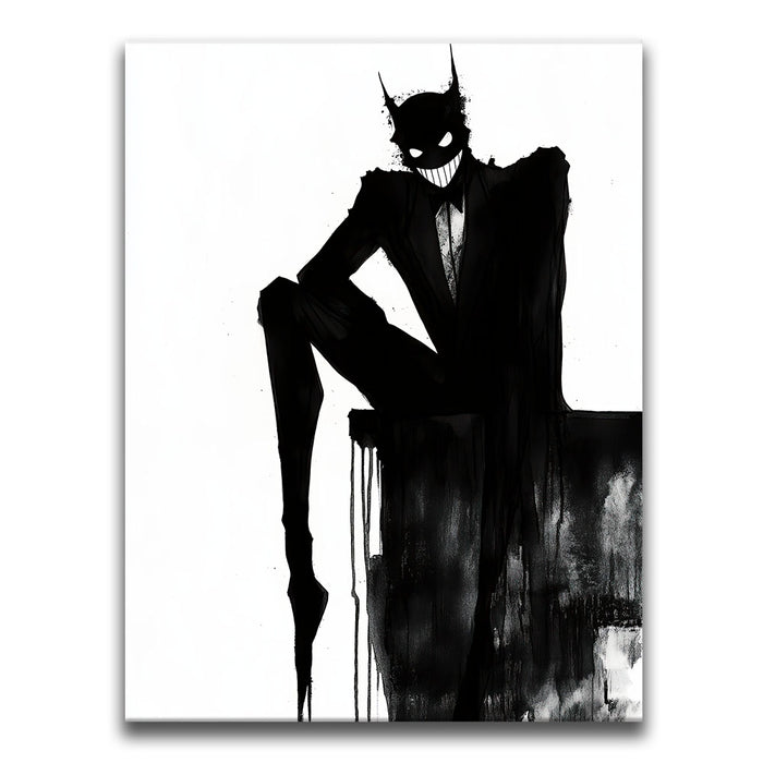 "Obsidian Charade" by Kandise King is a striking and enigmatic piece that explores the darker facets of mystery and allure. Featuring a shadowy figure with sharp, exaggerated features and a haunting grin, the artwork is rendered in stark black-and-white tones, creating a dramatic contrast. The dripping textures and minimalist composition evoke a sense of unease and intrigue, making it a powerful statement piece.