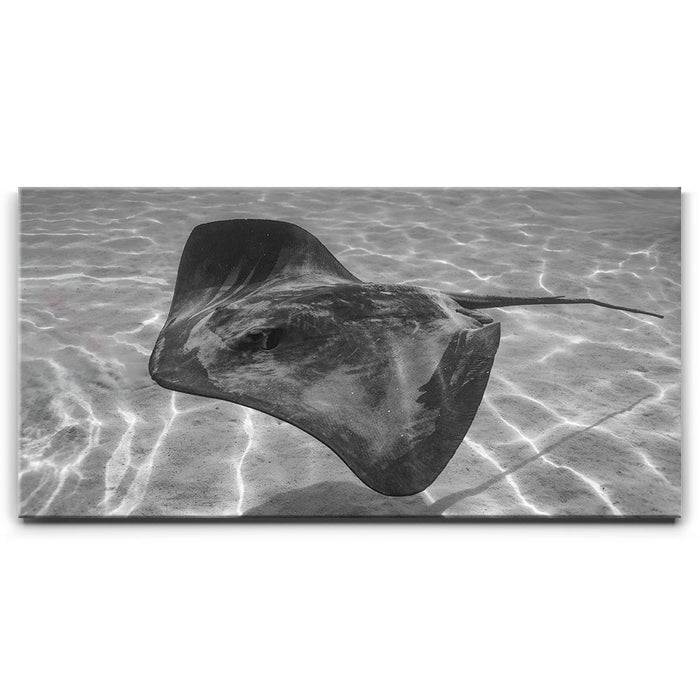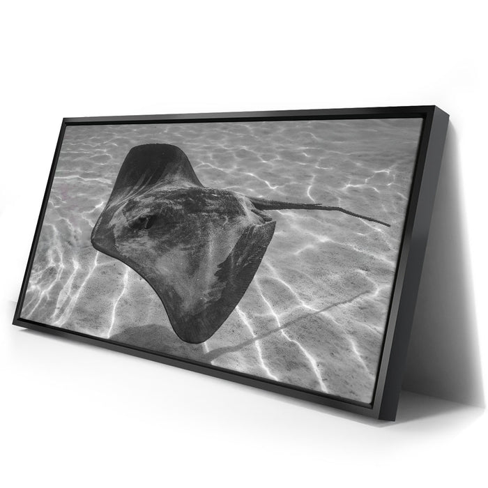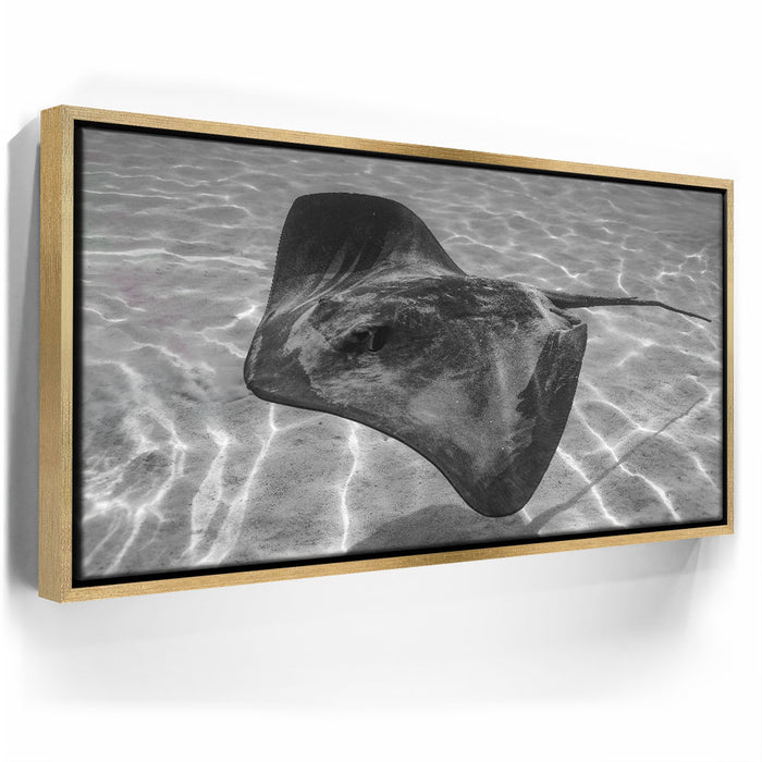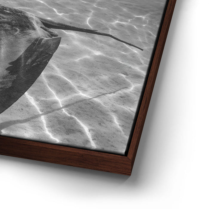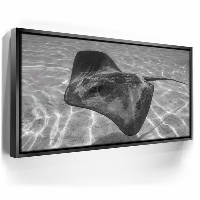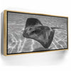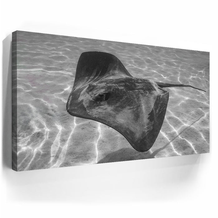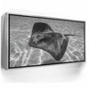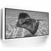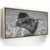 “Ocean Flying B&W, Tahiti” by Thais Mendonca is a mesmerizing black-and-white underwater photograph that captures the grace and mystery of a stingray gliding effortlessly across the ocean floor. The monochrome palette amplifies the texture of its wings and the rippling light patterns on the sandy seabed, creating an almost ethereal scene.