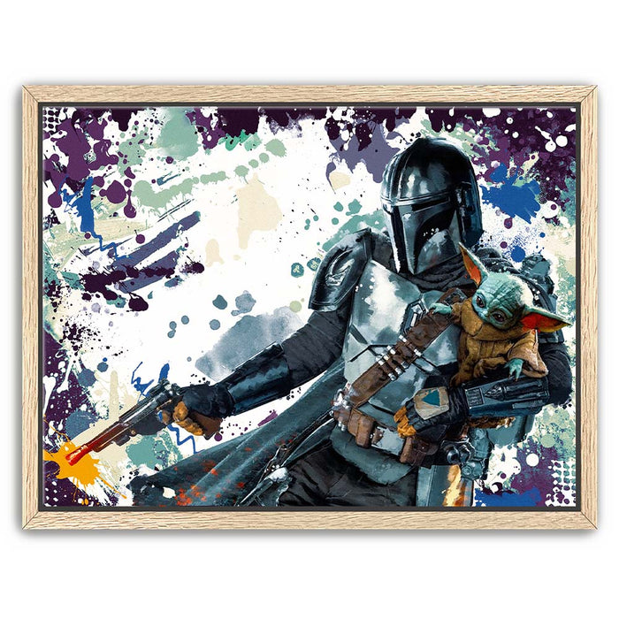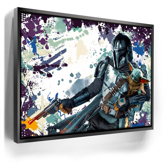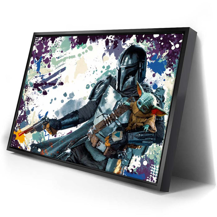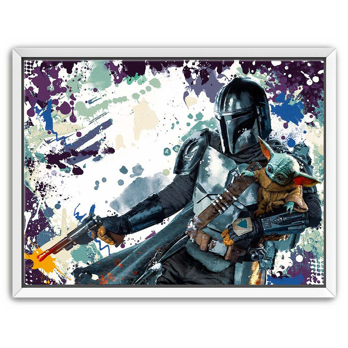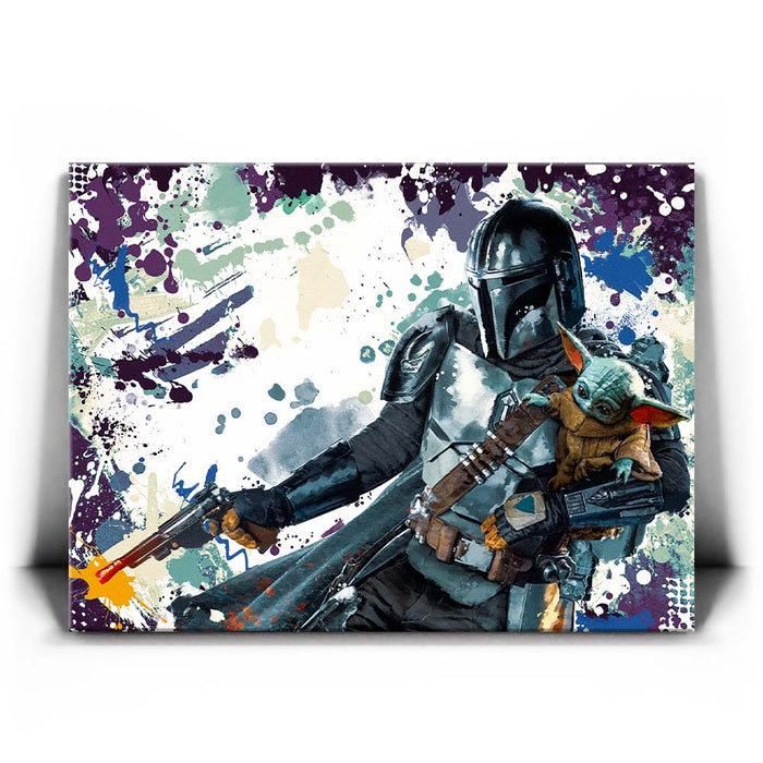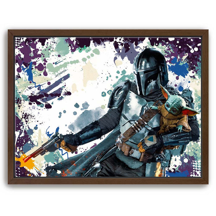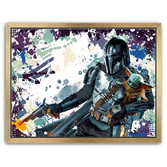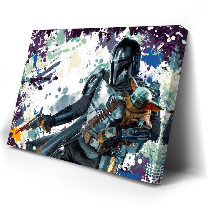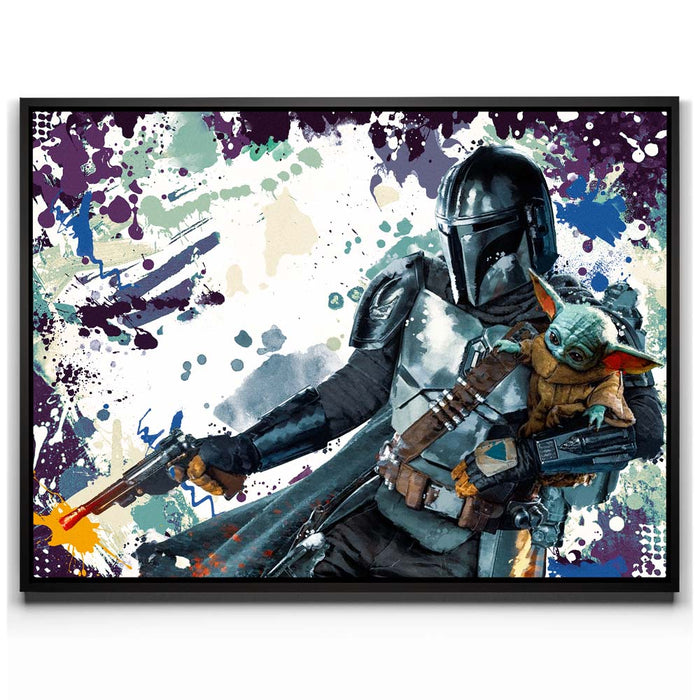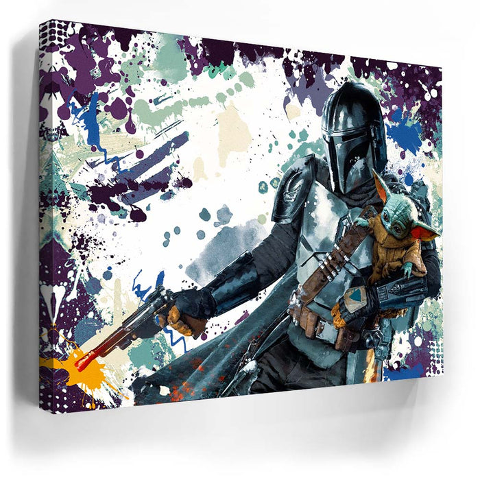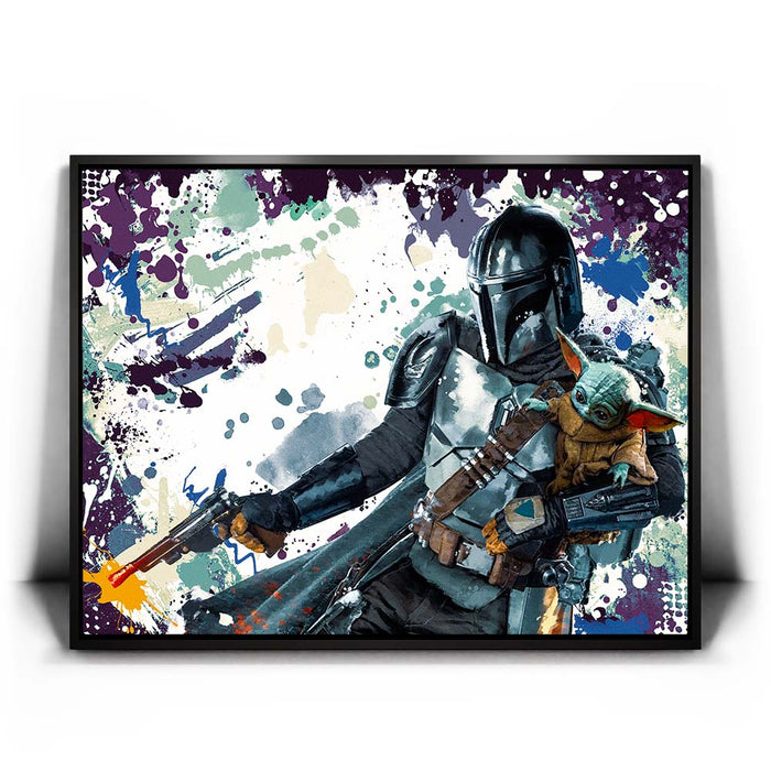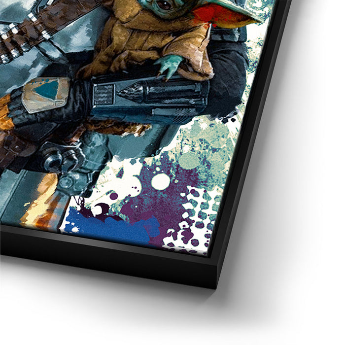 Embrace the epic adventure of a galaxy far, far away with our "Outer Rim Sentinel" canvas print. This captivating artwork features the iconic duo from the hit series, "Outer Rim Sentinel." The fearless Mando, clad in his beskar armor, is depicted in a dynamic action pose, wielding his blaster with precision. Nestled safely in his arm is his beloved charge, whose wide eyes and endearing expression add a touch of warmth and charm to the scene.