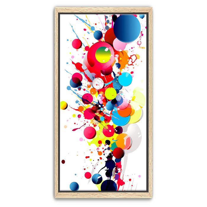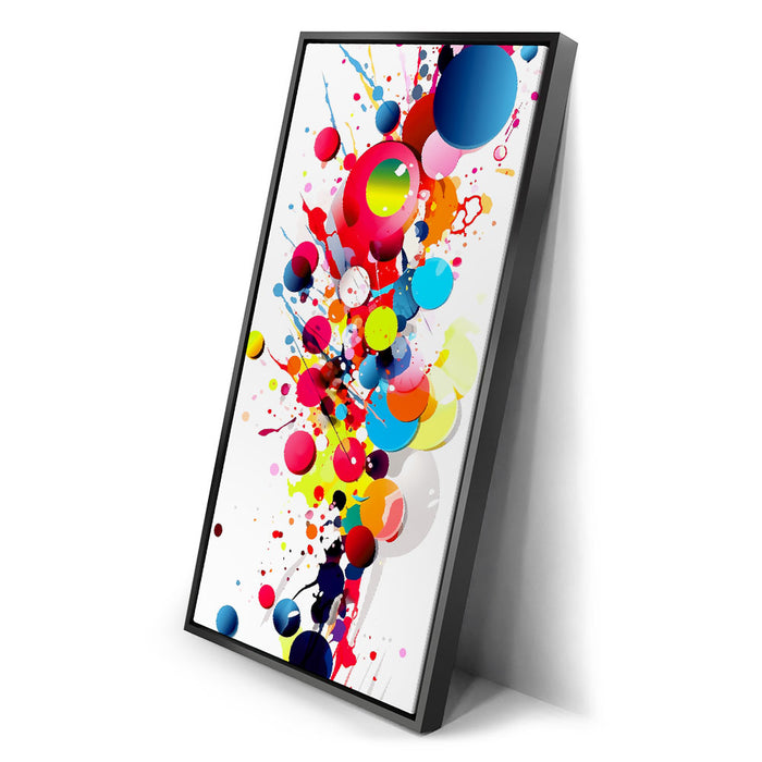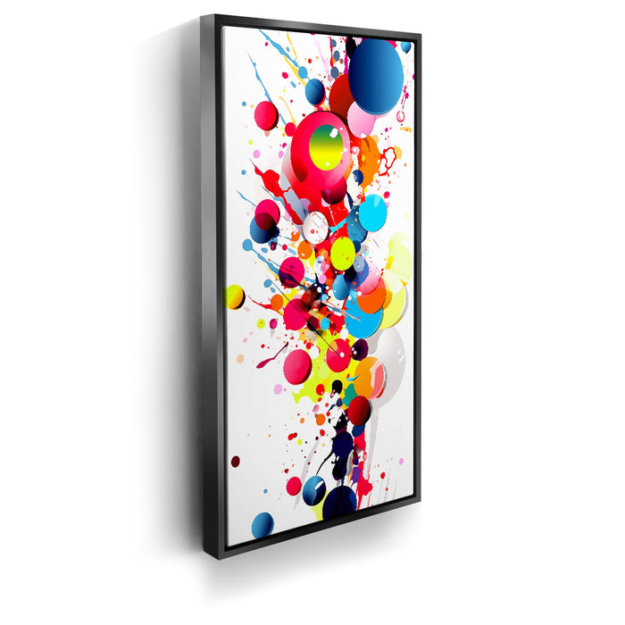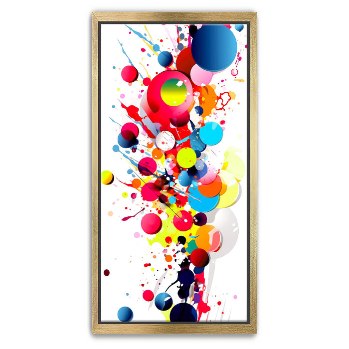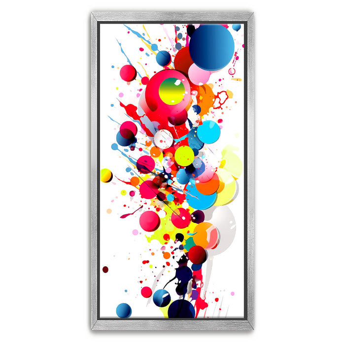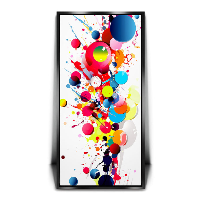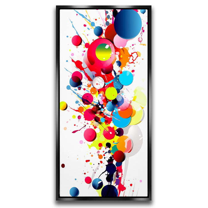 Paint Ball by G2 Creative is a bold and energetic piece of colorful abstract art, bursting with vibrant paint splatter across a tall portrait orientation. This modern abstract wall art features dynamic splashes of color that evoke movement, creativity, and playful expression.