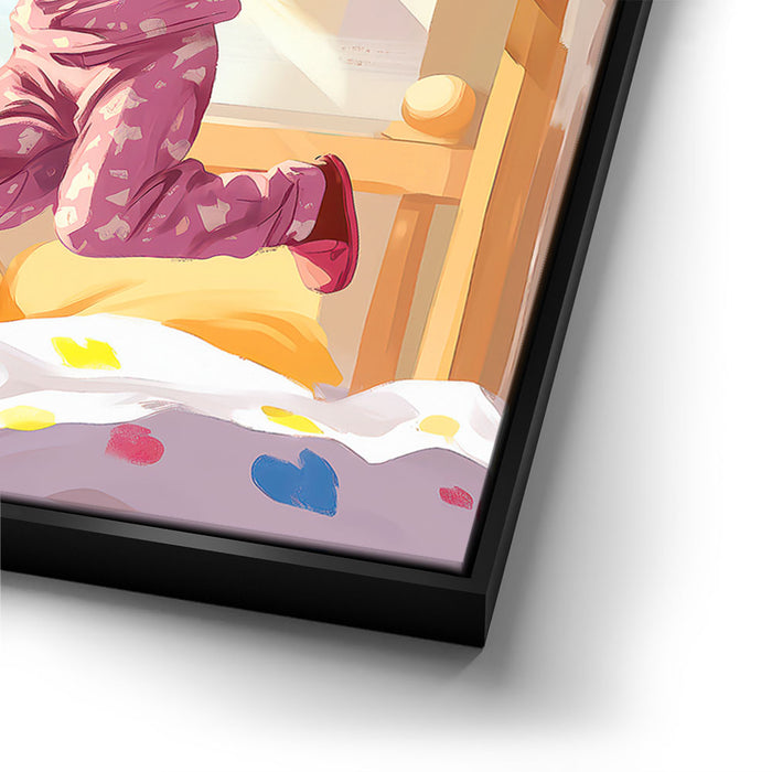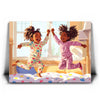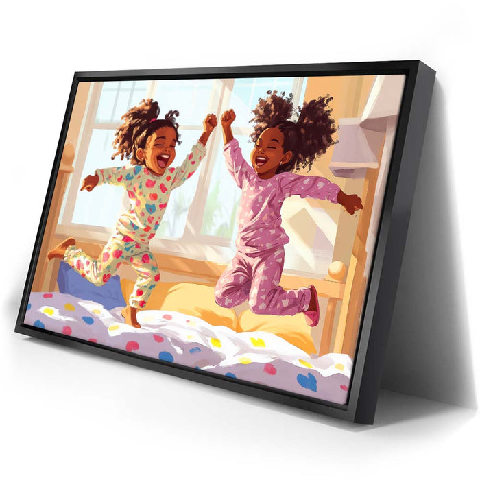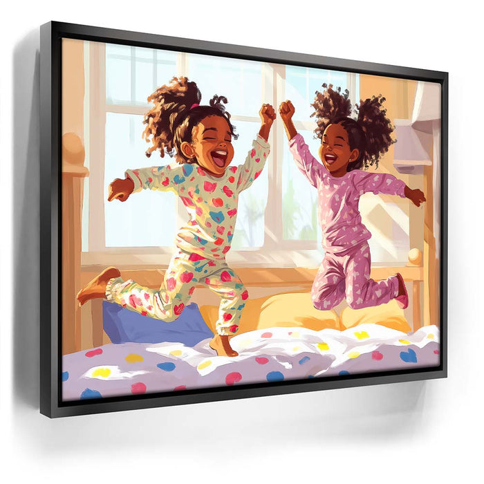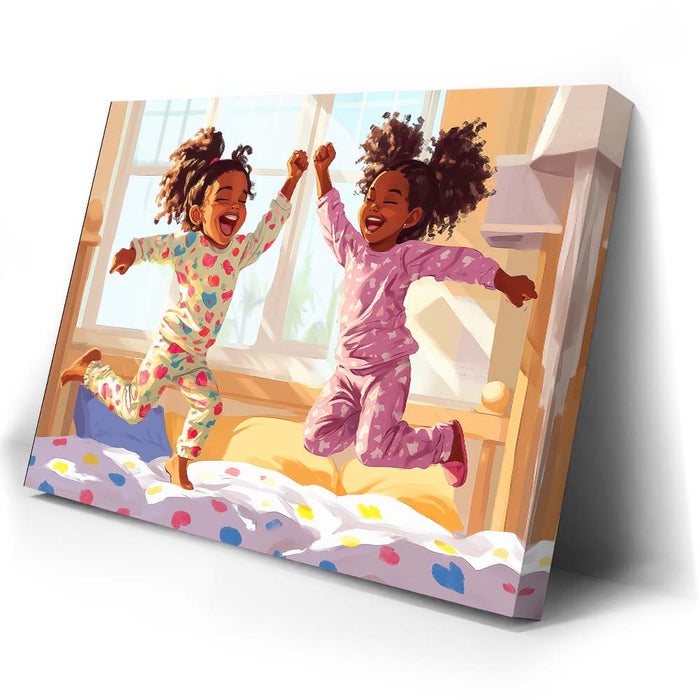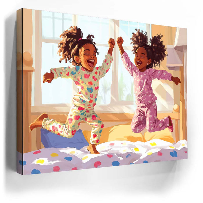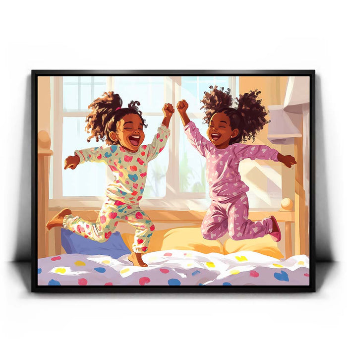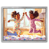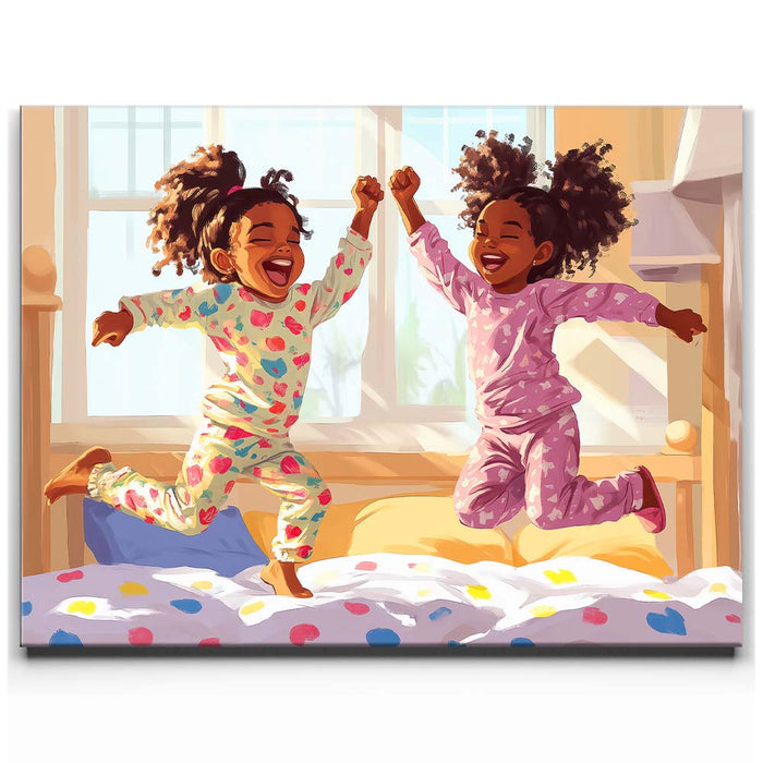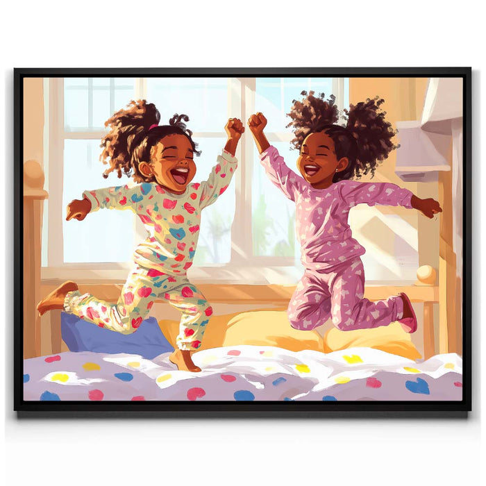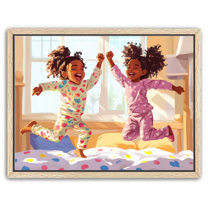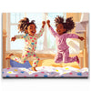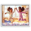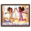 "Pajama Party" by Kandise King exudes pure joy and childhood delight. This heartwarming artwork depicts two young girls laughing and leaping in their colorful pajamas as sunlight streams through the window, filling the room with warmth. Their carefree energy and radiant smiles capture the essence of innocent fun and sibling bonds.