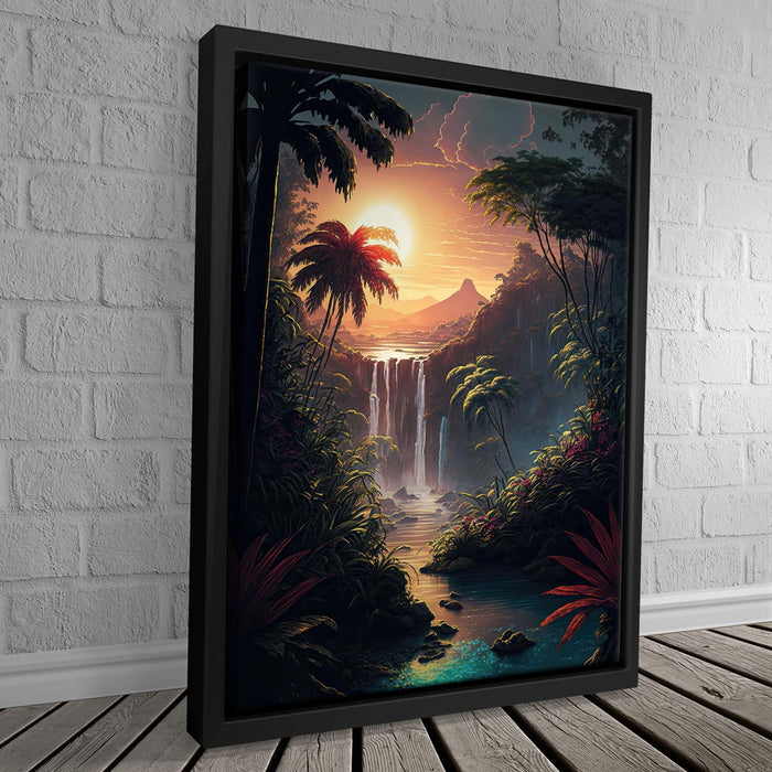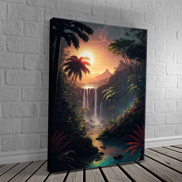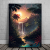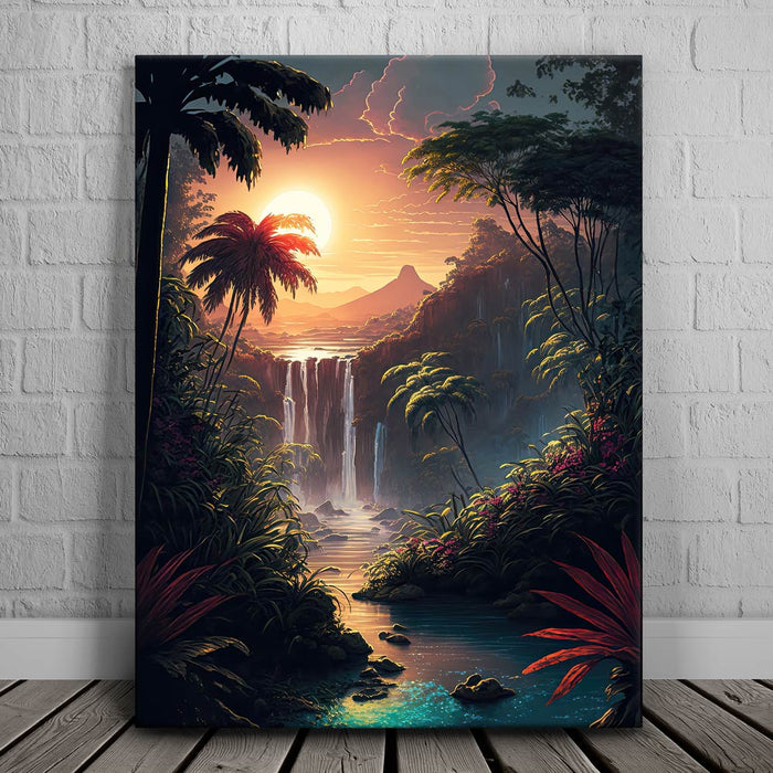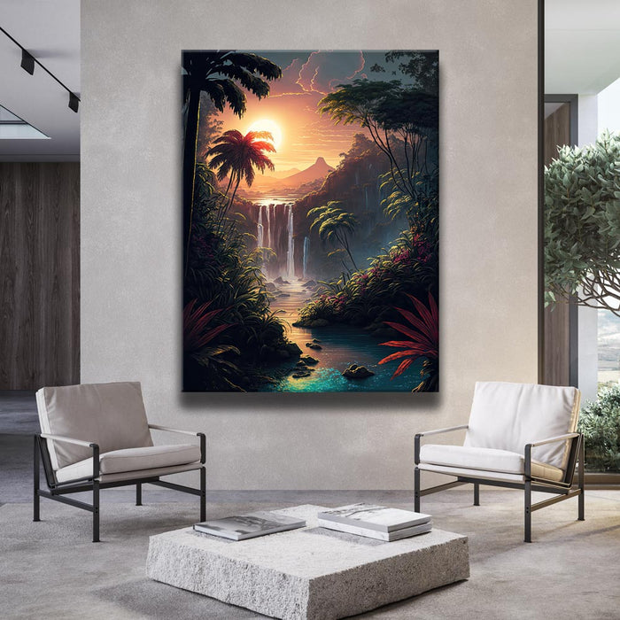 "Paradise" by MIDJOURNEY.MAN is a breathtaking depiction of a hidden tropical oasis, complete with cascading waterfalls, lush greenery, and a vibrant sunrise or sunset sky. This captivating portrait-style artwork celebrates the serene beauty of nature, bringing to life the tranquility of tropical plants, flowing rivers, and rolling meadows bathed in golden light.