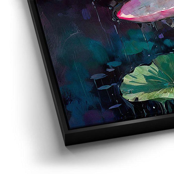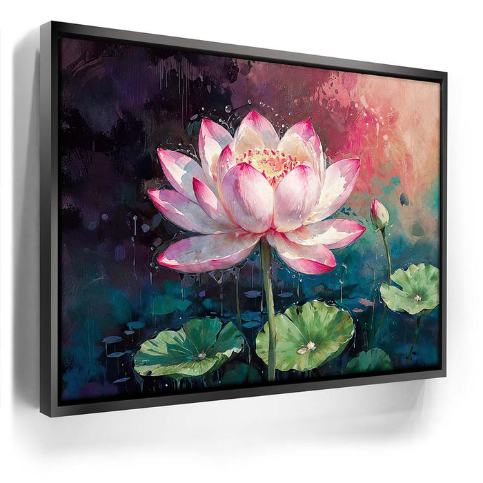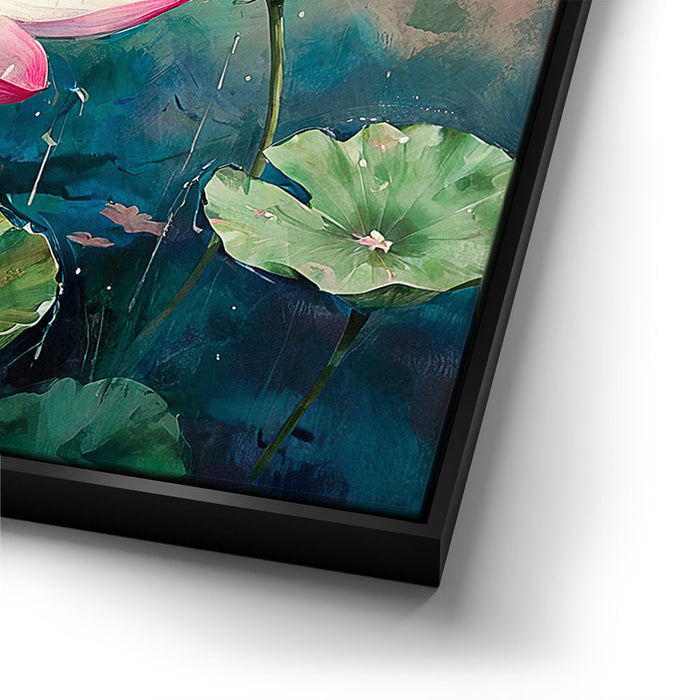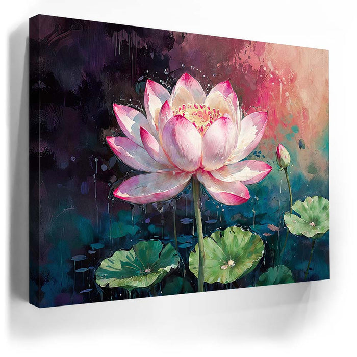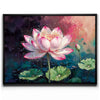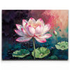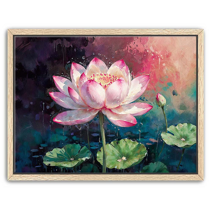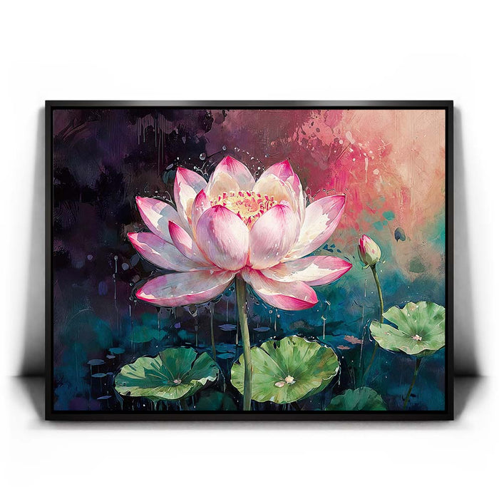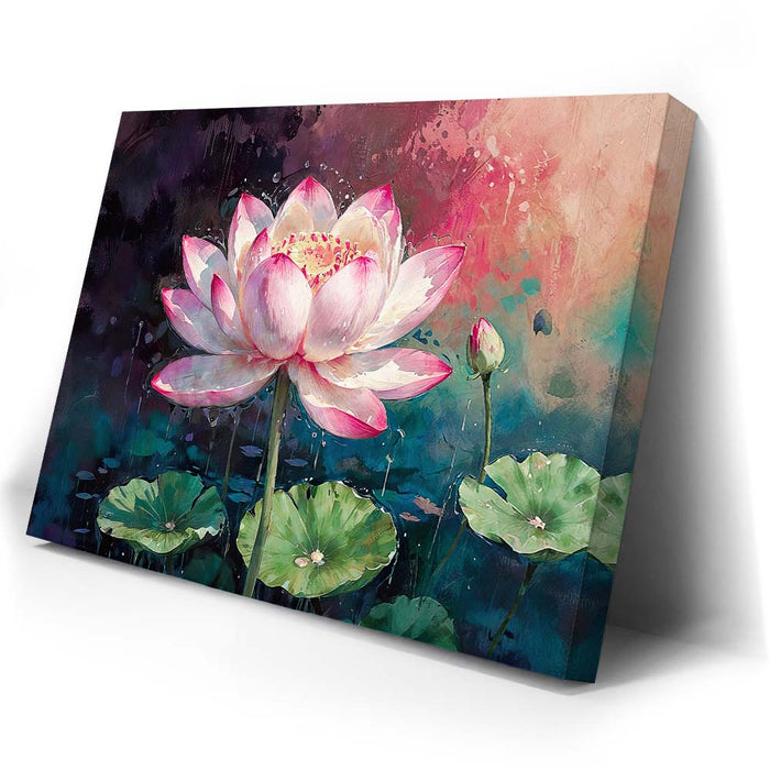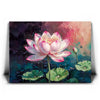 Peaceful Lotus Flower by Stella Ygris is a serene landscape painting featuring a delicate pink lotus in full bloom. Surrounded by a tranquil lotus patch, the soft flower petals radiate calm and beauty, making this piece a perfect symbol of peace and natural harmony.