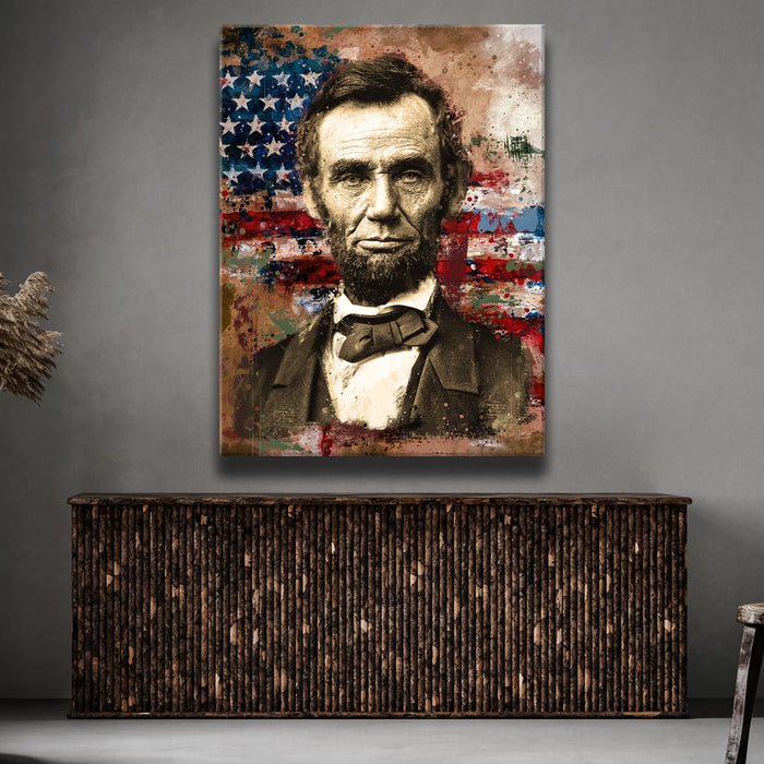 "President Lincoln II" is a striking abstract wall art piece that pays tribute to Abraham Lincoln, the 16th President of the United States. Rendered in a sepia tone with nods to the Wild West and the American flag, this artwork embodies themes of freedom, patriotism, and the enduring legacy of "Honest Abe." It beautifully combines the iconic imagery of Lincoln with a contemporary, abstract design.