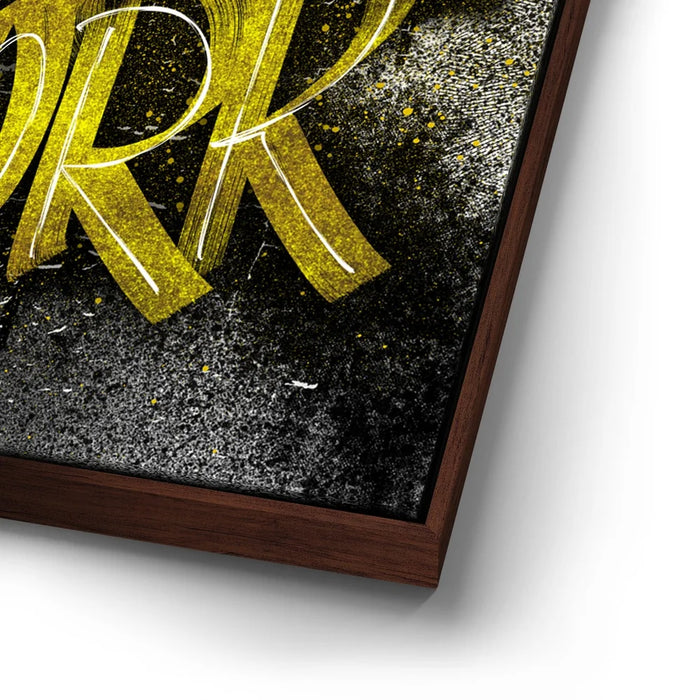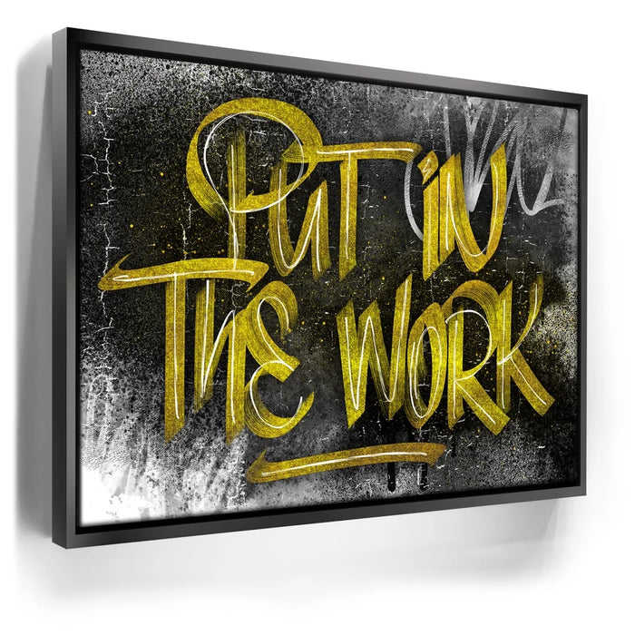 Put In The Work – Calligraphy (Gold Text) is a bold and motivational graffiti-inspired artwork that captures the power of hustle and dedication. With its striking gold brush lettering layered over a gritty black-and-gray textured background, this piece demands attention and fuels ambition. The dripping paint and distressed finish give it a raw, urban energy that speaks to perseverance and grit.