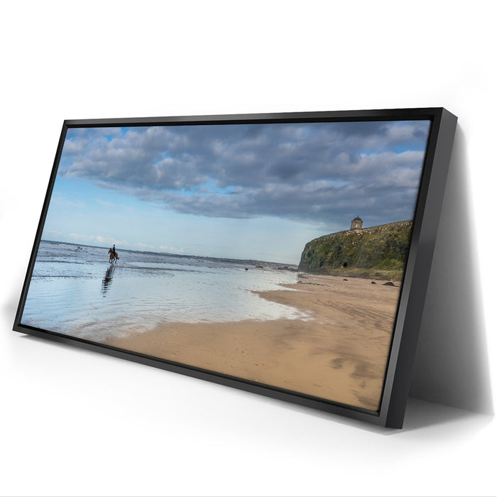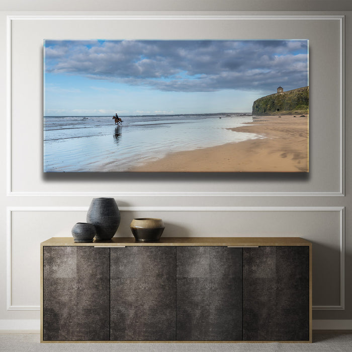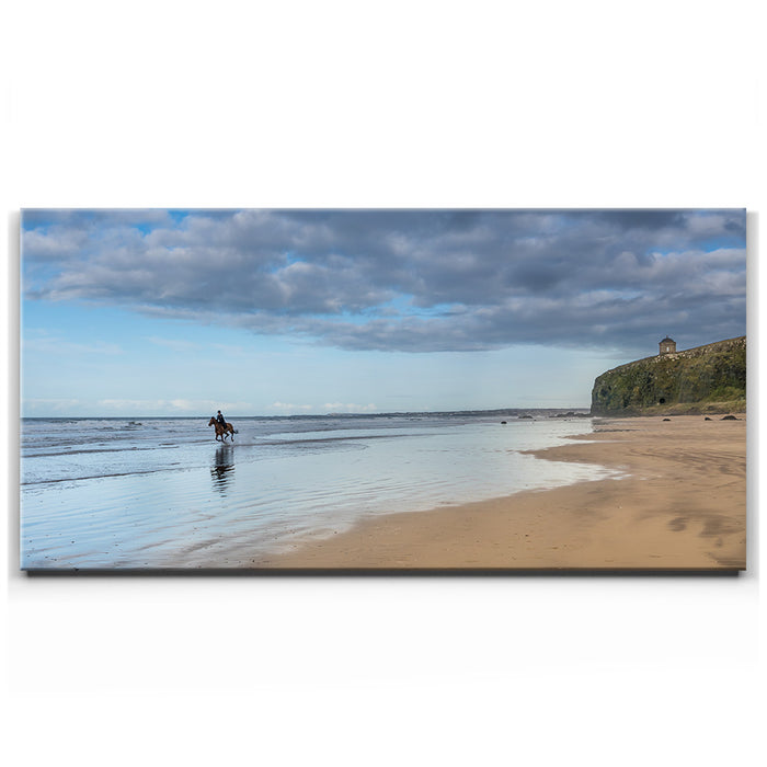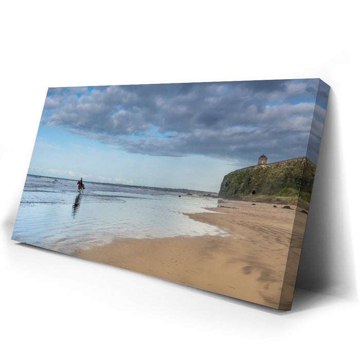 A rider exercises her horse on the Antrim Coast in Northern Ireland, the Musselman Temple in the background.